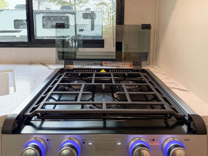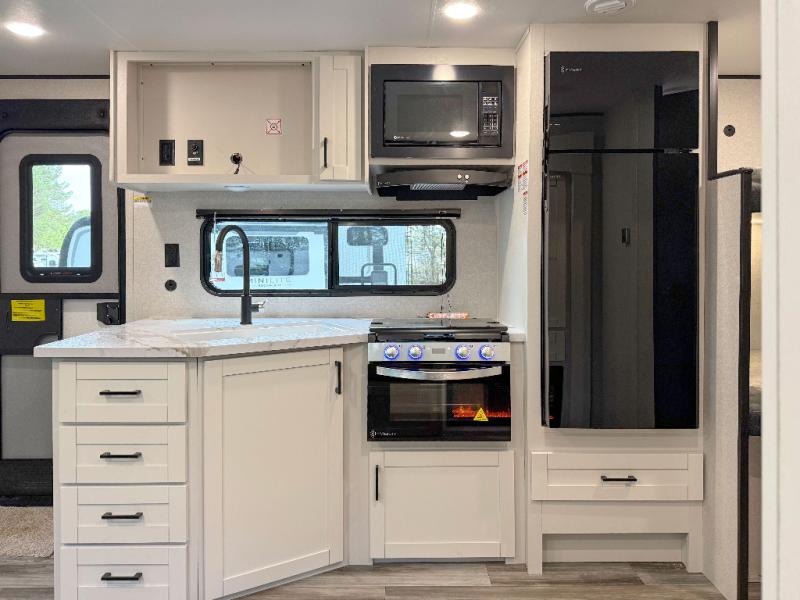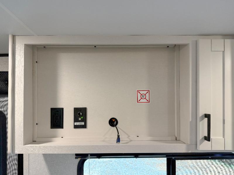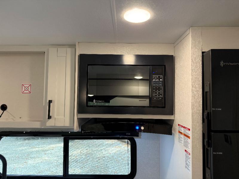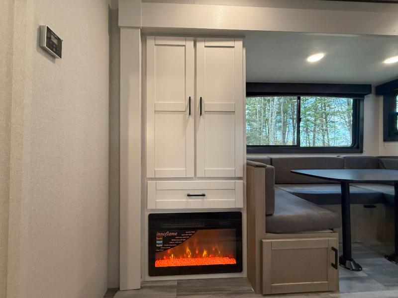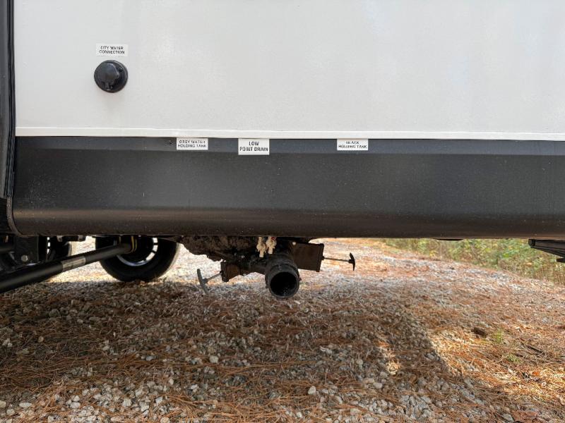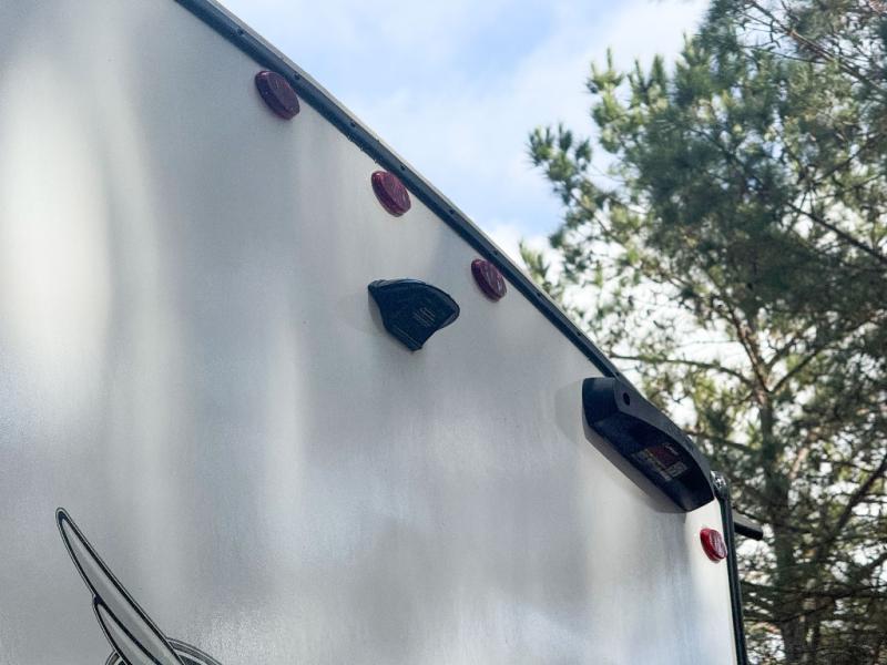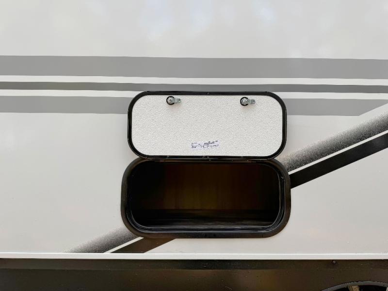 You can comfortably sleep eight people in this travel trailer thanks to the double-size bunks in back, the 60" x 80" queen bed in the front bedroom, plus the U-shaped dinette within the slide out! The chef of your crew will have a three burner cooktop and microwave oven to prepare meals, and everyone can store their favorite drinks in the 12V refrigerator inside or in the exterior refrigerator! This unit also includes ample storage space, including a large pantry and dual bedside wardrobes.