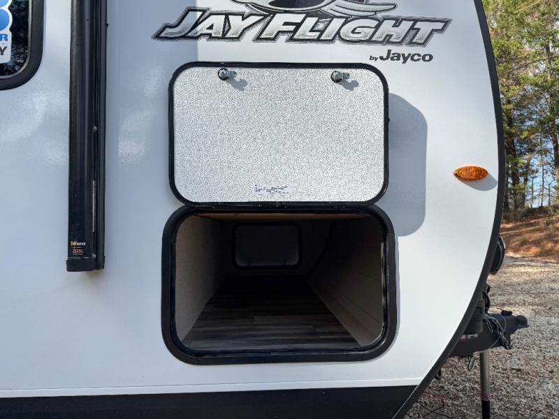 The Jayco Jay Flight SLX travel trailer is quite easy to own because it is lightweight for an easier towing experience. Built on a fully integrated A-frame with galvanized-steel, impact-resistant wheel wells, the Jay Flight SLX has quality at its very foundation. That quality continues on to the electric self-adjusting brakes, easy-lube hubs, Magnum Truss roof system, and LP quick connect. Some of what the mandatory Customer Value Package includes is backup camera prep, Keyed-Alike entry and baggage doors, and an on-demand tankless water heater.