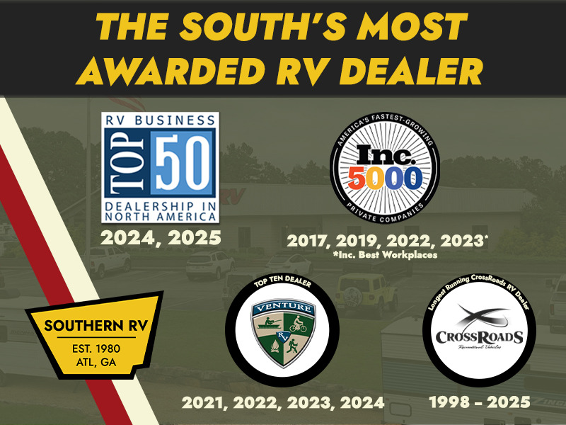 With over 45 years as a family run business we carry great new products from brands like Jayco, Forest River, Venture RV and DRV, and Crossroads and Thor Motor Coach. Southern RV also features certified pre-owned RV's from companies like Keystone, Brinkley, Heartland, Airstream and Alliance,Tiffin and Winnebago. Come into our Cumming or Mcdonough locations and take advantage of the exceptional customer experience and marvelous pricing that has positioned Southern RV as one of the most awarded RV Dealers in the America with two RV Business Top 50 Dealer awards, three Inc. 5000 awards, as well as a Top Ten Venture RV Dealer for four years in a row.