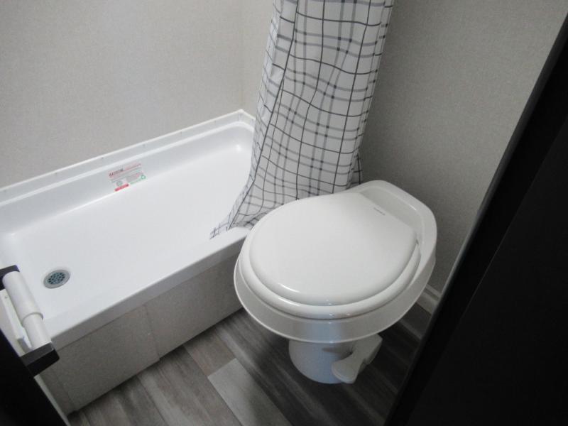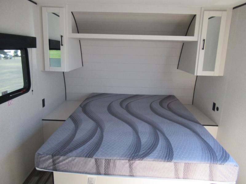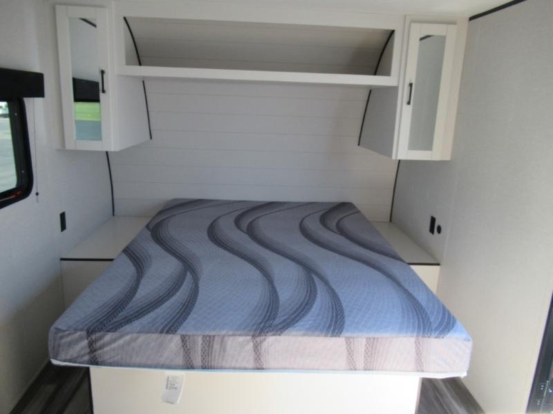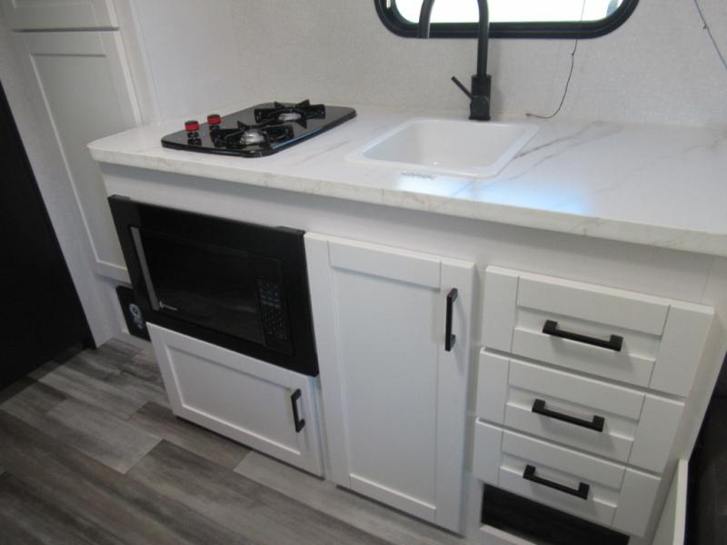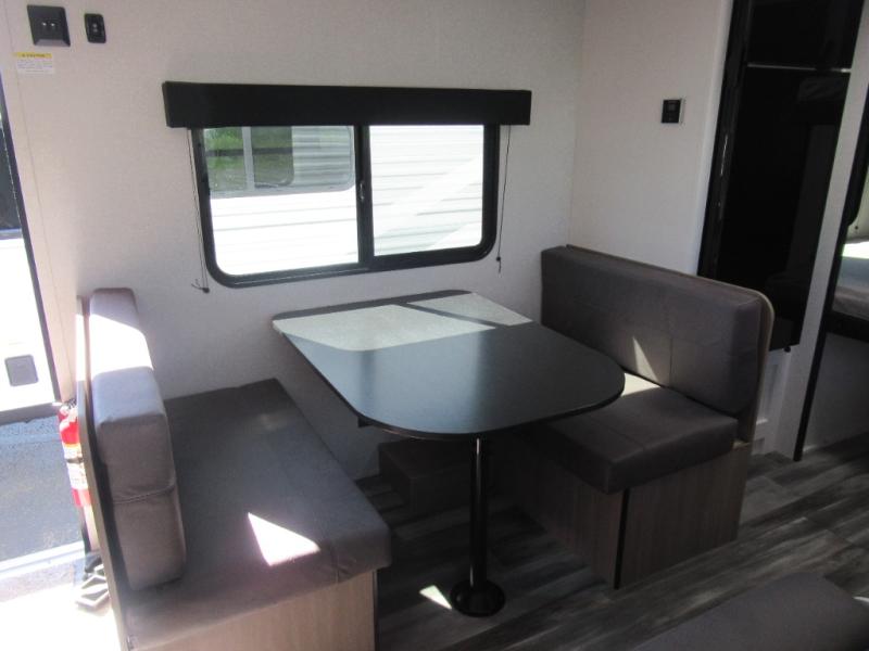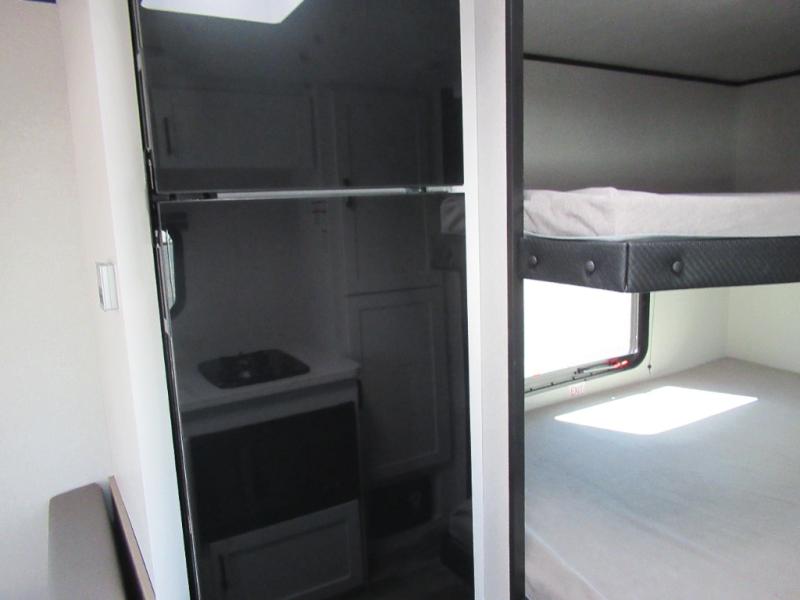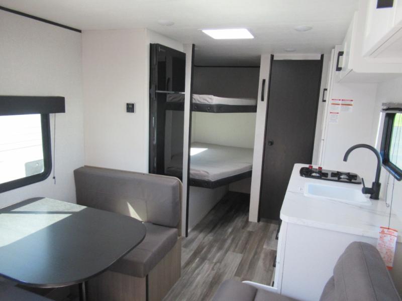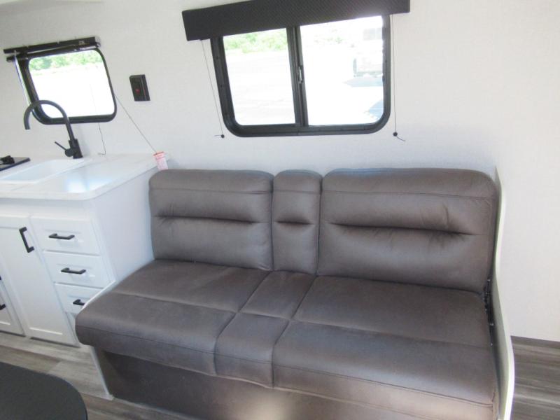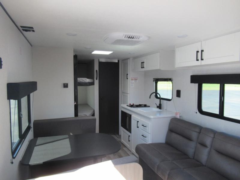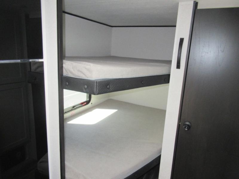 You can comfortably sleep eight to ten people in this trailer thanks to the double-size bunks, the 60" x 80" queen bed in the front bedroom, plus the booth dinette and jack-knife sofa in the main living area! The chef of your crew will have a two burner cooktop and microwave oven to prepare meals, and everyone can store their favorite drinks in the 12V refrigerator. The bathroom includes a 40" shower and a toilet, with the sink just outside of this room so others can brush their teeth if one is taking a shower before bed. The outside storage will let you bring along fishing poles and the 12' power awning will create a nice place to gather in the evenings!