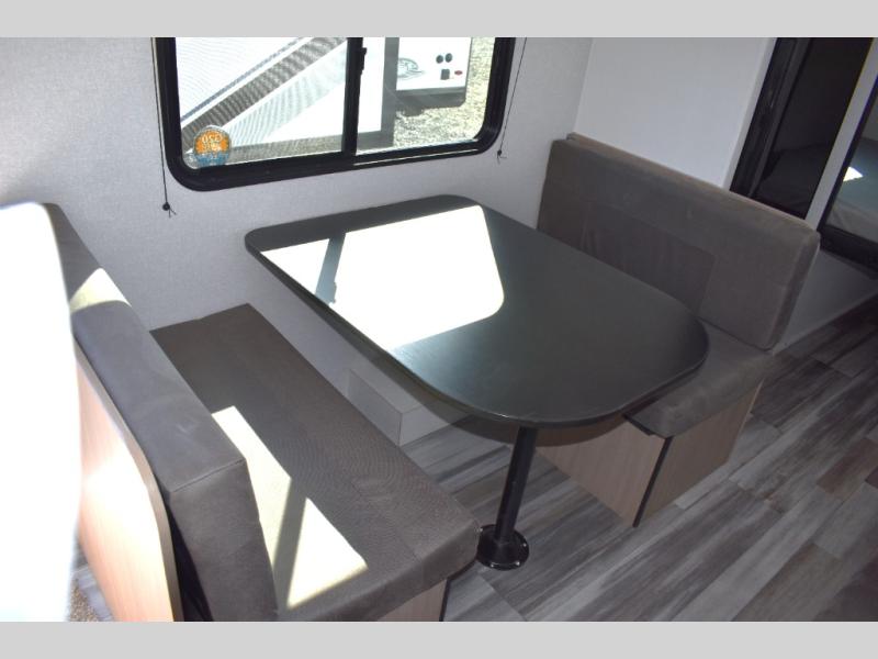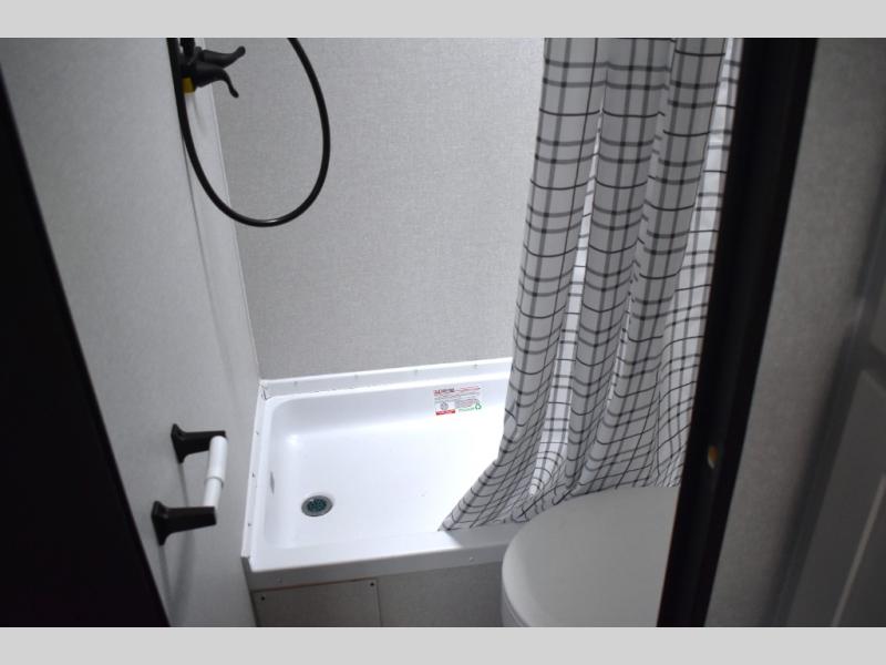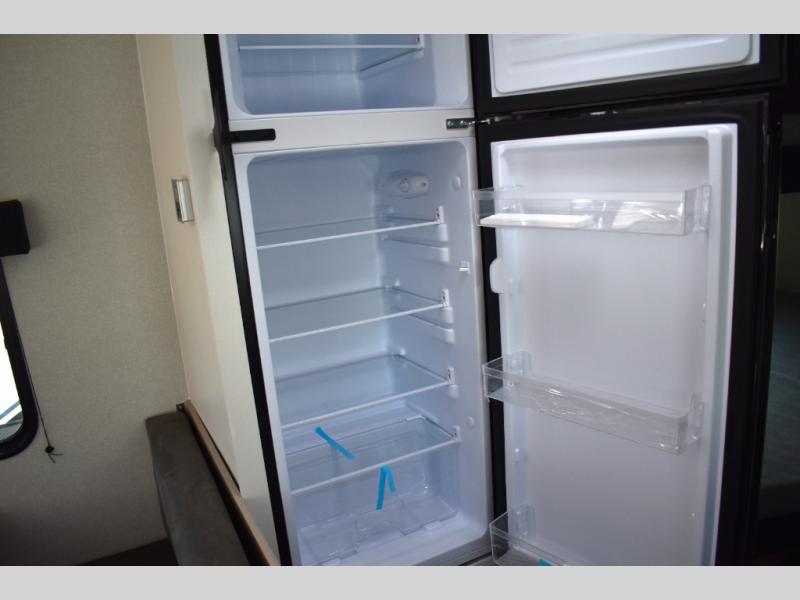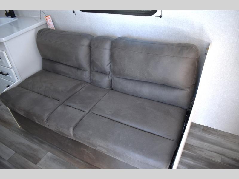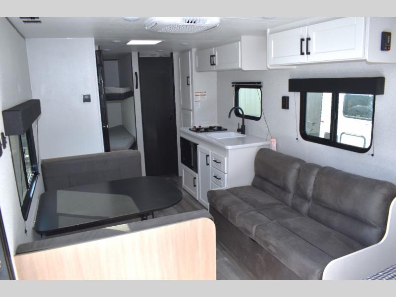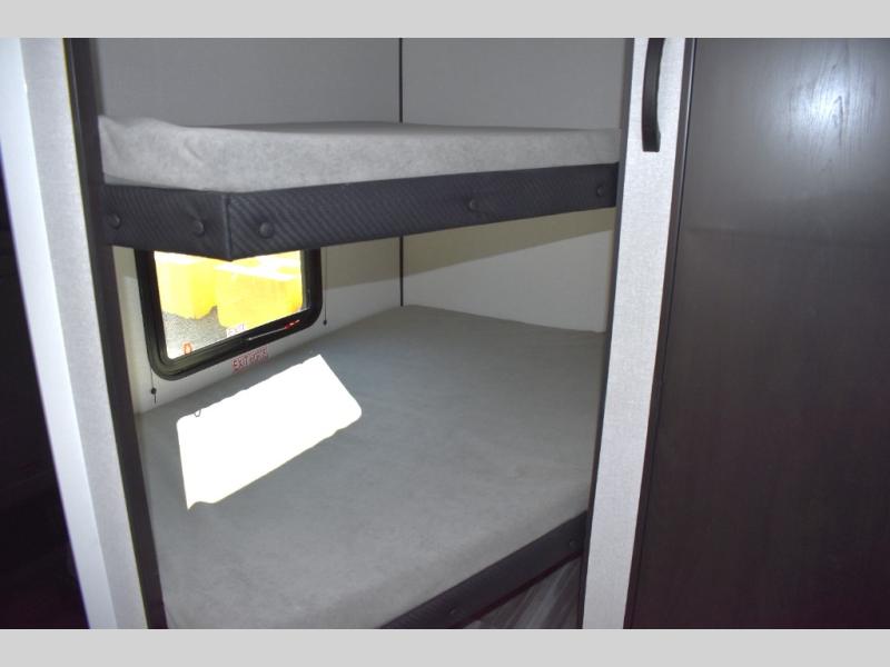 You can comfortably sleep eight to ten people in this trailer thanks to the double-size bunks, the 60" x 80" queen bed in the front bedroom, plus the booth dinette and jack-knife sofa in the main living area! The chef of your crew will have a two burner cooktop and microwave oven to prepare meals, and everyone can store their favorite drinks in the 12V refrigerator. The bathroom includes a 40" shower and a toilet, with the sink just outside of this room so others can brush their teeth if one is taking a shower before bed. The outside storage will let you bring along fishing poles and the 12' power awning will create a nice place to gather in the evenings!