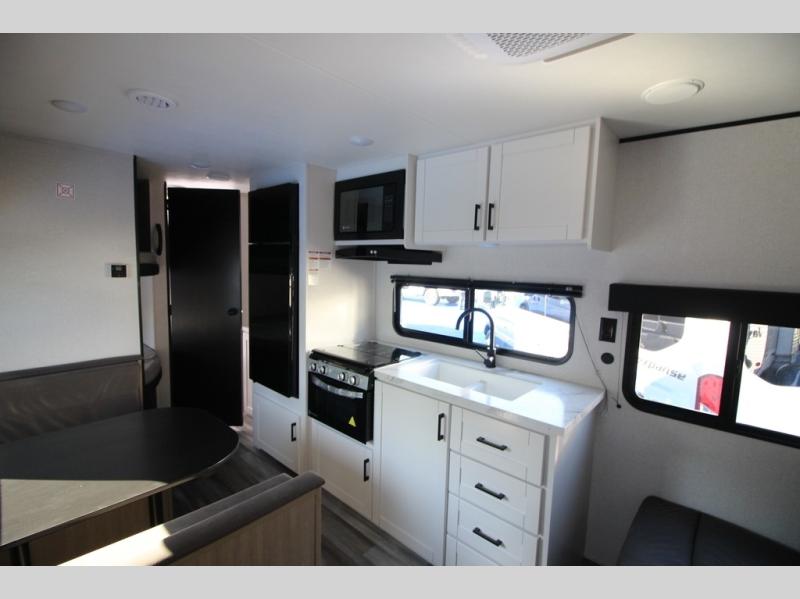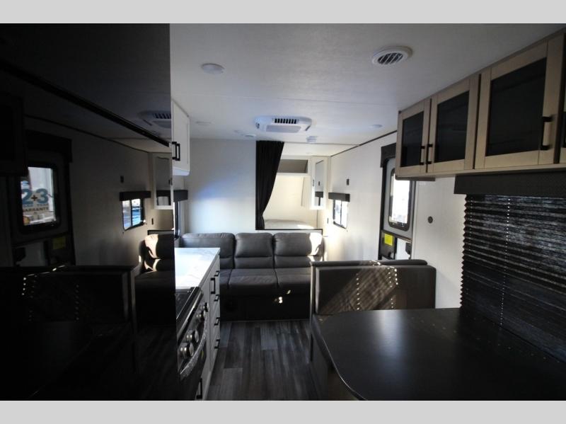 You can comfortably sleep eight to ten people in this trailer thanks to the double-size bunks, the RV queen bed in the front bedroom, plus the booth dinette and jack-knife sofa in the main living area! The chef of your crew will have a three burner cooktop and microwave oven to prepare meals, and everyone can store their favorite drinks in the 8 cu. ft. 12V refrigerator. The bathroom includes a shower and a toilet, with the sink just outside of this room so others can brush their teeth if one is taking a shower before bed. The outside storage will let you bring along fishing poles and the 16' power awning with LED lights will create a nice place to gather in the evenings!