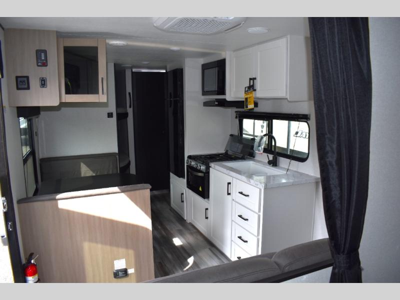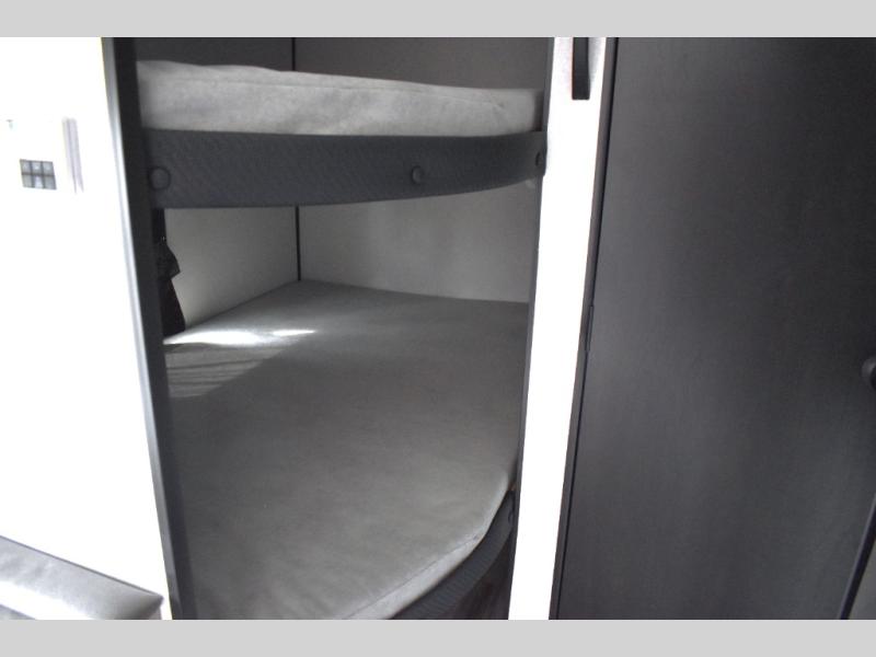 You can comfortably sleep up to eight people in this trailer thanks to the double-size bunks, the RV queen bed in the front bedroom, plus the booth dinette and jack-knife sofa in the main living area! The chef of your crew will have a three burner cooktop and microwave oven to prepare meals, and everyone can store their favorite drinks in the 8 cu. ft. 12V refrigerator. The bathroom includes a shower and a toilet, with the sink just outside of this room so others can brush their teeth if one is taking a shower before bed. The outside storage will let you bring along fishing poles and the 16' power awning with LED lights will create a nice place to gather in the evenings!