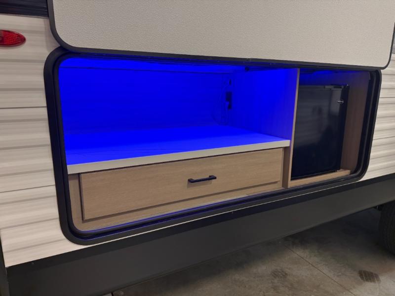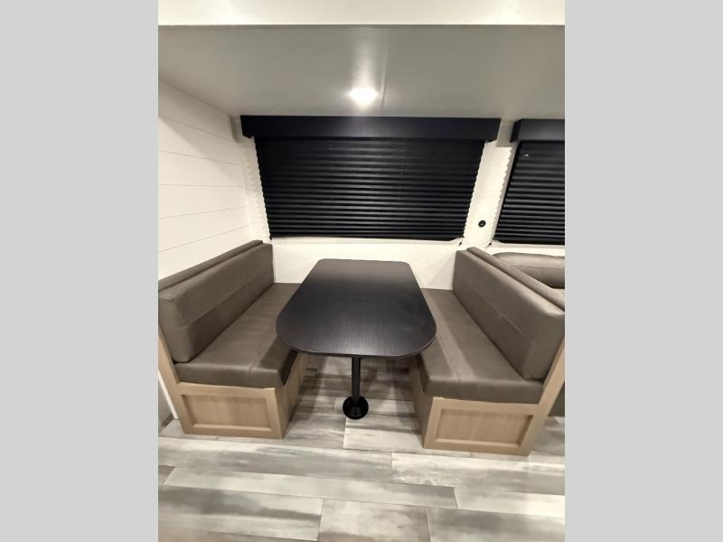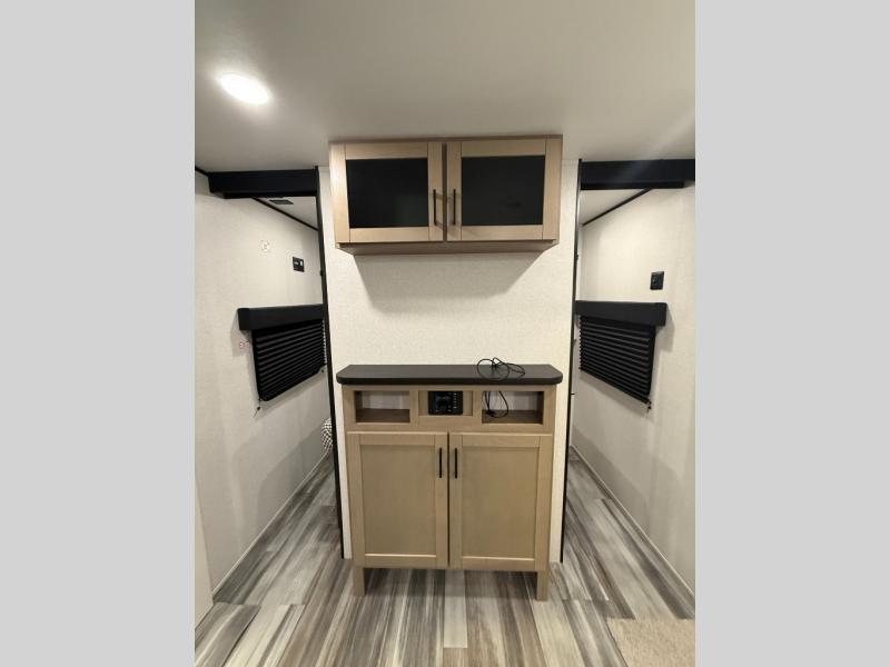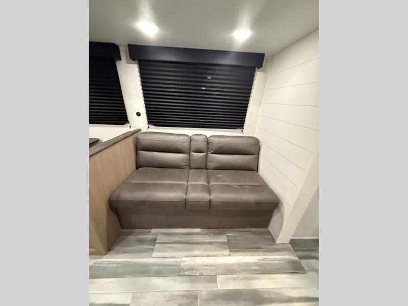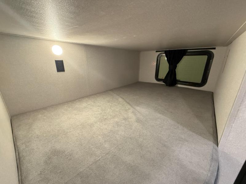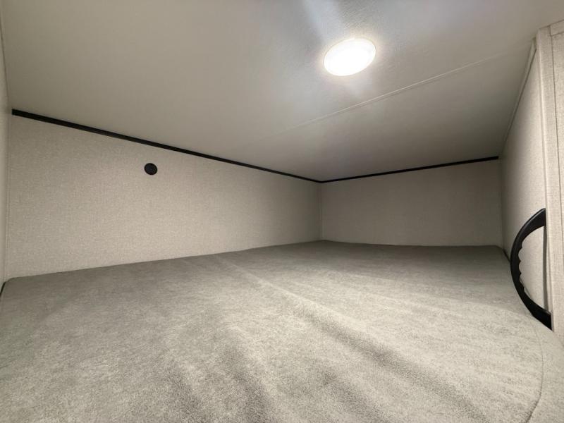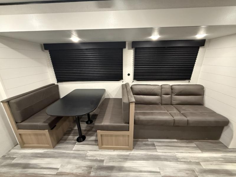 You can comfortably sleep up to ten people in this trailer thanks to the double-size bunks in back, the RV queen bed in the front bedroom, plus the booth dinette and jack-knife sofa in the main living area! The chef of your crew will have a three burner cooktop and microwave oven to prepare meals, and everyone can store their favorite drinks in the 8 cu. ft. 12V refrigerator inside, or in the outdoor refrigerator for convenience. The rear corner bathroom includes a shower and a toilet, with the sink just outside of this room so others can brush their teeth if one is taking a shower before bed. The outside storage is accessible on both sides of the unit and will easily allow you bring along camp chairs, yard games and more. A 16' powered awning with LED lights will create a nice place to gather in the evenings with family and friends!