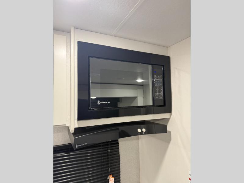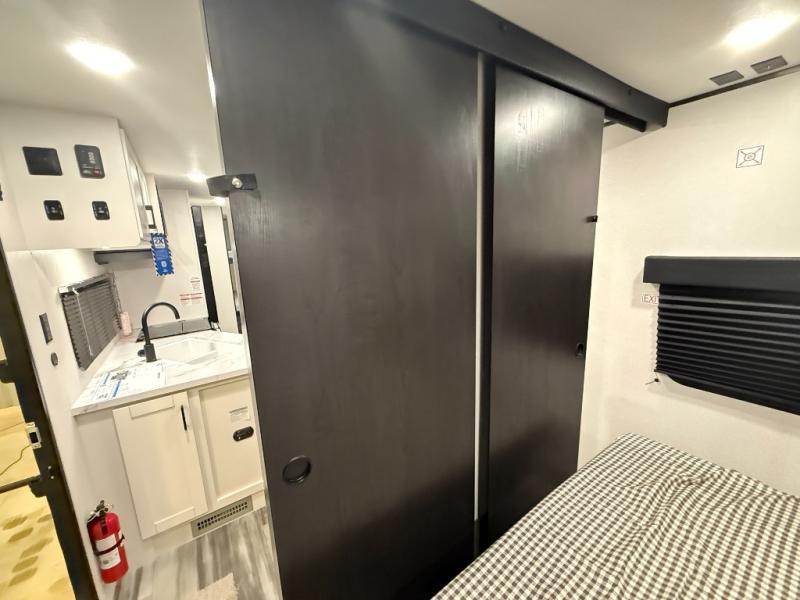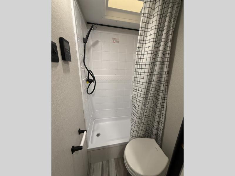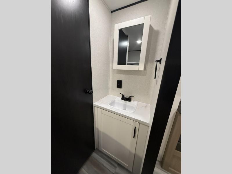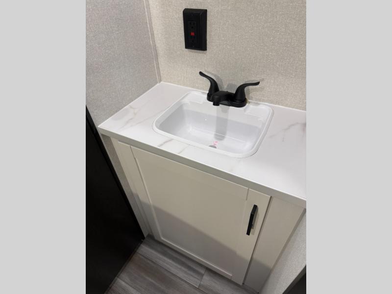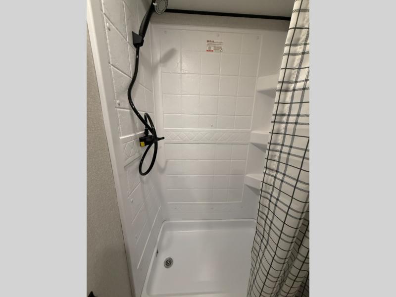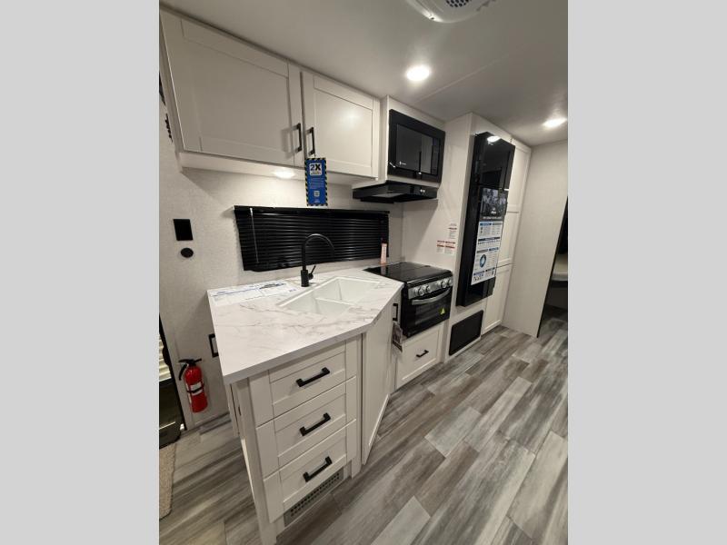 You can comfortably sleep up to ten people in this trailer thanks to the double-size bunks in back, the RV queen bed in the front bedroom, plus the booth dinette and jack-knife sofa in the main living area! The chef of your crew will have a three burner cooktop and microwave oven to prepare meals, and everyone can store their favorite drinks in the 8 cu. ft. 12V refrigerator inside, or in the outdoor refrigerator for convenience. The rear corner bathroom includes a shower and a toilet, with the sink just outside of this room so others can brush their teeth if one is taking a shower before bed. The outside storage is accessible on both sides of the unit and will easily allow you bring along camp chairs, yard games and more. A 16' powered awning with LED lights will create a nice place to gather in the evenings with family and friends!