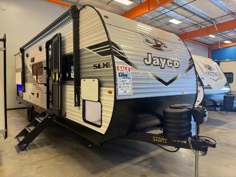 The Jayco Jay Flight SLX travel trailer is quite easy to own because it is lightweight for an easier towing experience. Built on a fully integrated A-frame with galvanized-steel, impact-resistant wheel wells, the Jay Flight SLX has quality at its very foundation. That quality continues on to the electric self-adjusting brakes, easy-lube hubs, Magnum Truss roof system, and LP quick connect. Some of what the mandatory Customer Value Package includes is backup camera prep, Keyed-Alike entry and baggage doors, and an on-demand tankless water heater.