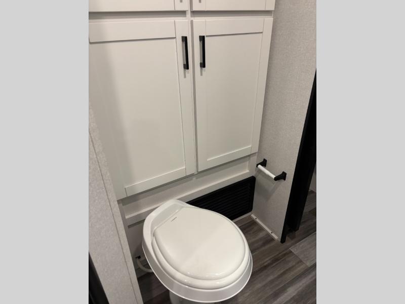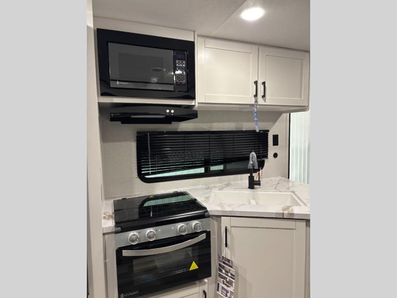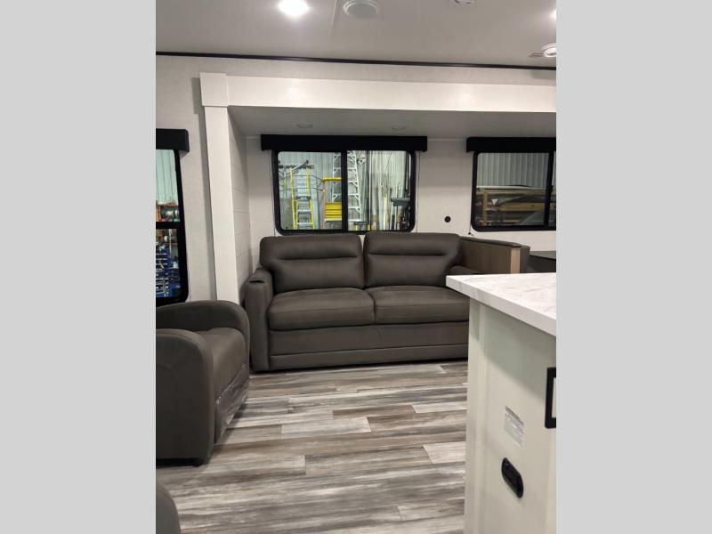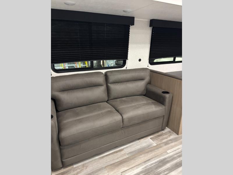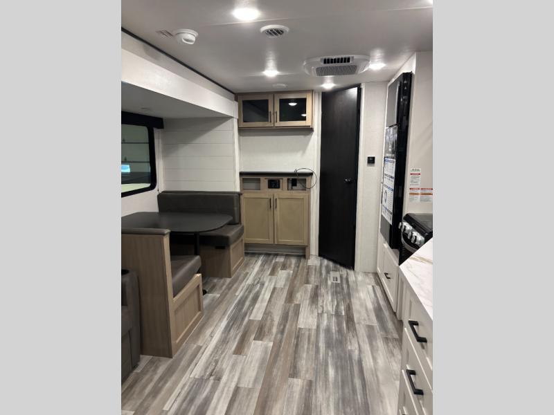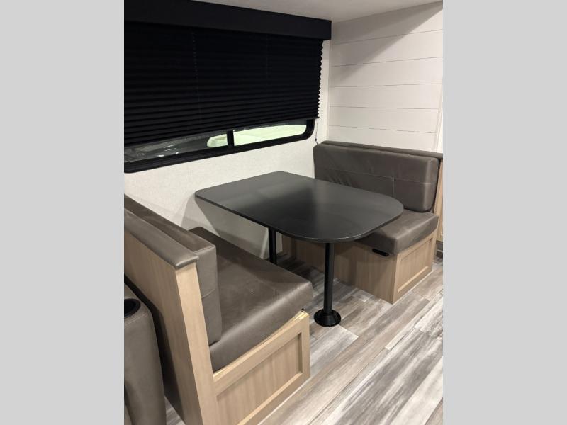 You can comfortably sleep up to six people in this trailer thanks to the RV queen bed in the front bedroom, plus the booth dinette and jack-knife sofa in the main living area! The chef of your crew will have a three burner cooktop and microwave oven to prepare meals, and everyone can store their favorite drinks in the 8 cu. ft. 12V refrigerator. The walk-through bath is spacious and includes a radius shower, toilet, a sink, and linen closet and is the full width of the unit. The outside storage will let you bring along camp chairs and games, fishing poles and more, plus the 18' 3" power awning with LED lights will create a nice place to gather in the evenings!