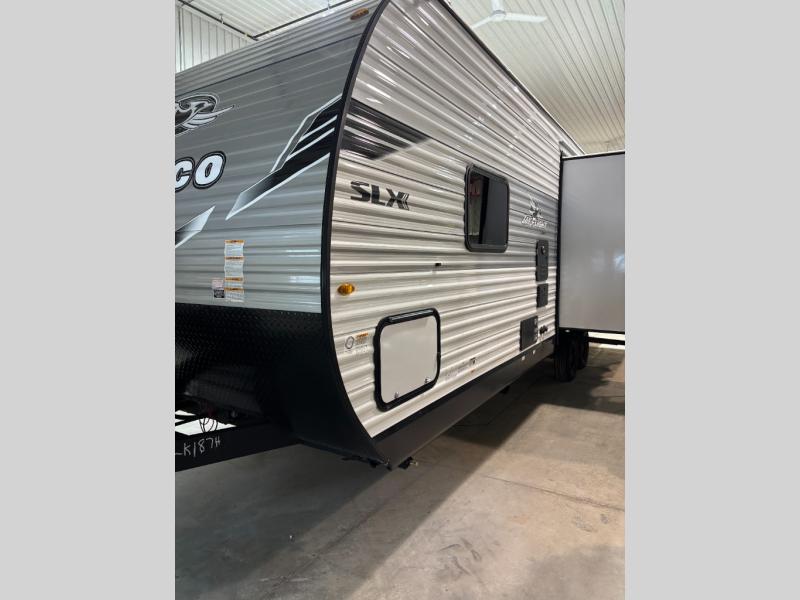 The Jayco Jay Flight SLX travel trailer is quite easy to own because it is lightweight for an easier towing experience. Built on a fully integrated A-frame with galvanized-steel, impact-resistant wheel wells, the Jay Flight SLX has quality at its very foundation. That quality continues on to the electric self-adjusting brakes, easy-lube hubs, Magnum Truss roof system, and LP quick connect. Some of what the mandatory Customer Value Package includes is backup camera prep, Keyed-Alike entry and baggage doors, and an on-demand tankless water heater.