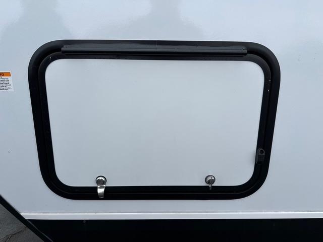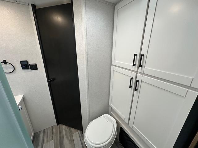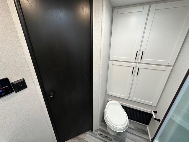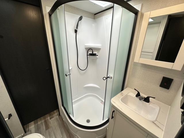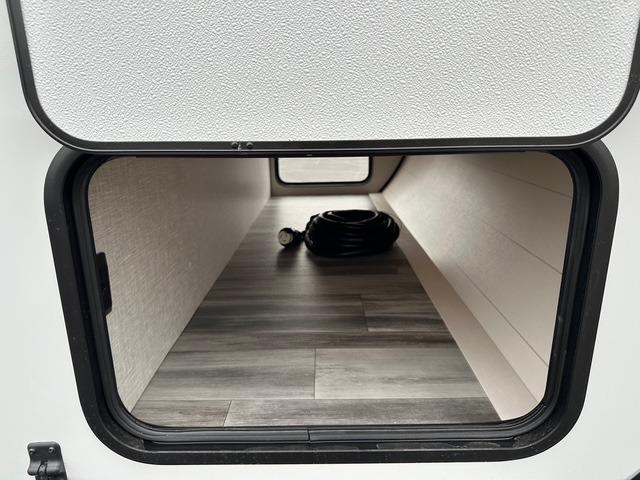 The walk-through bath spans the full width of the unit and includes a radius shower, toilet, sink, and a linen closet for towels and toiletries. Outside, there is plenty of storage for camping gear, fishing poles, chairs, and games. The 18' 3" power awning with LED lights extends your living space outdoors, providing a shaded area for relaxing, dining, or socializing with friends around the campsite.