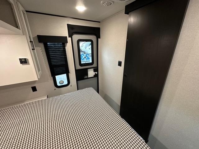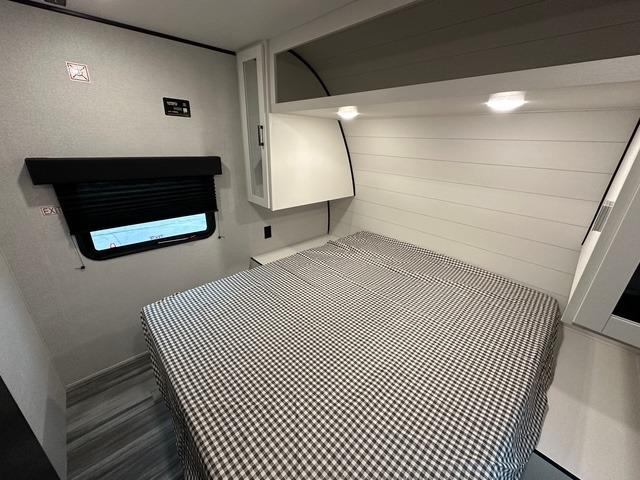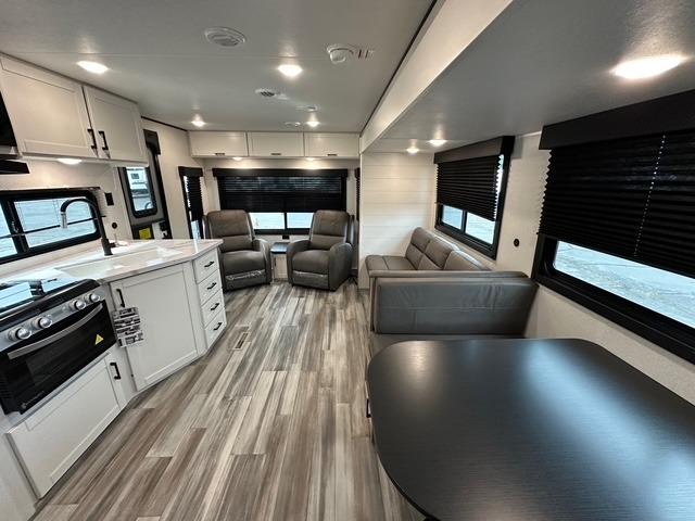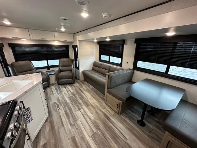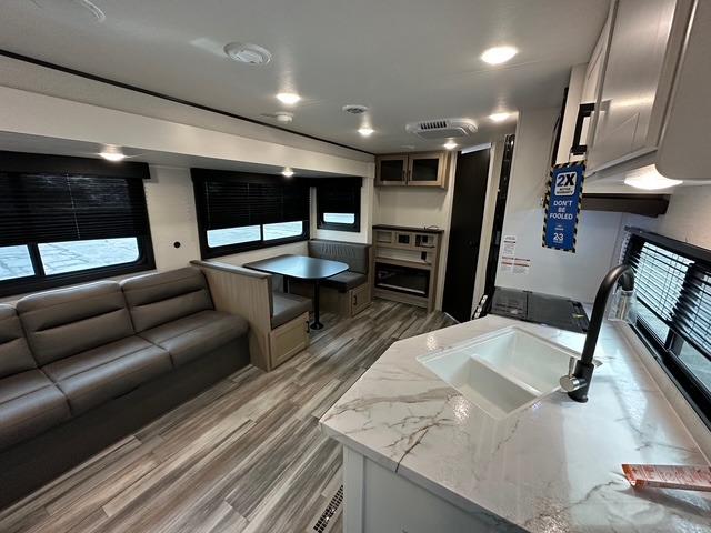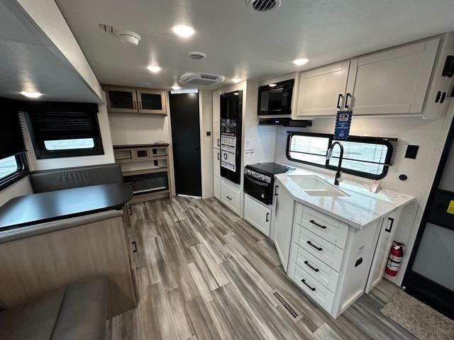 You can comfortably sleep up to six people in this trailer, making it perfect for families or small groups. The front private bedroom features an RV queen bed with overhead storage and bedside cabinets for personal items, while the main living area offers a booth dinette and jack-knife sofa that both convert into additional sleeping space. The kitchen is fully equipped with a three-burner cooktop, microwave oven, and an 8 cu. ft. 12V refrigerator, giving the chef of the crew everything needed to prepare meals on the road.