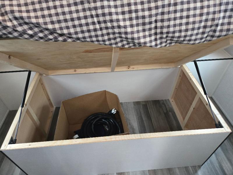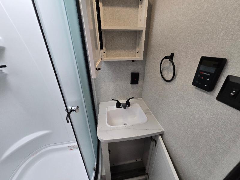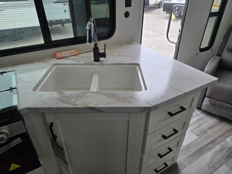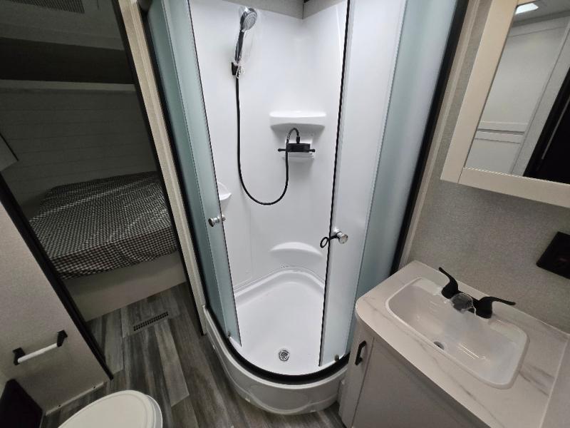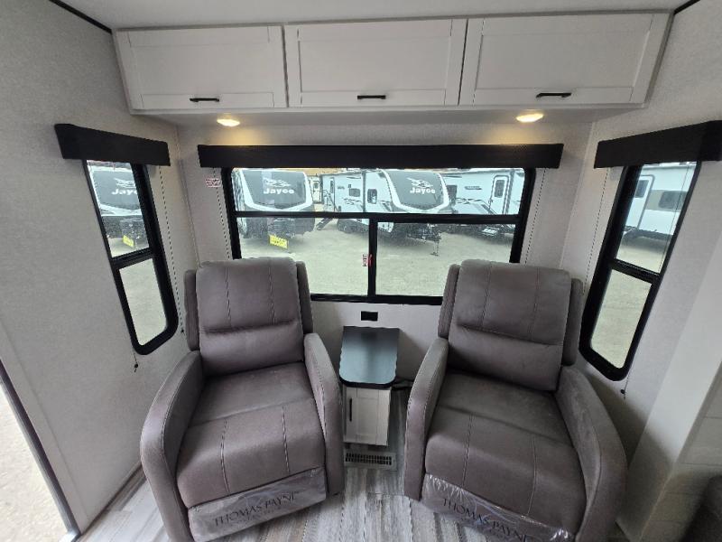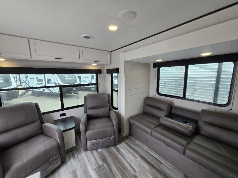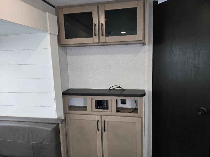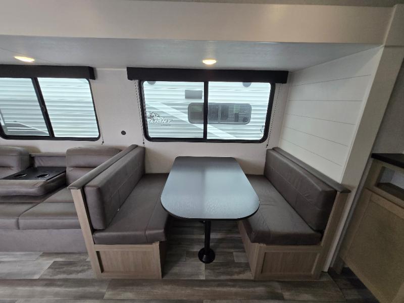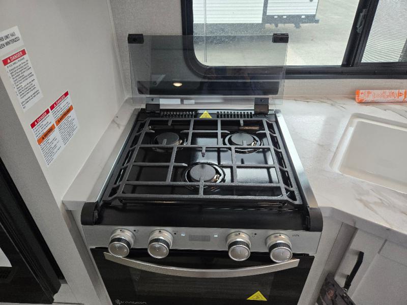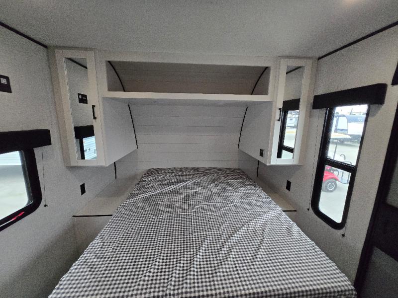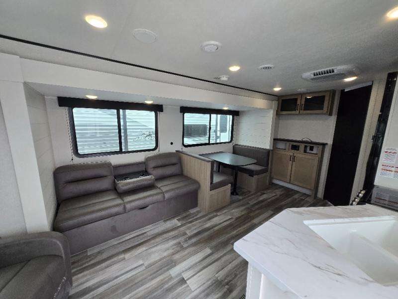 You can comfortably sleep up to six people in this trailer thanks to the RV queen bed in the front bedroom, plus the booth dinette and jack-knife sofa in the main living area! The chef of your crew will have a three burner cooktop and microwave oven to prepare meals, and everyone can store their favorite drinks in the 8 cu. ft. 12V refrigerator. The walk-through bath is spacious and includes a radius shower, toilet, a sink, and linen closet and is the full width of the unit. The outside storage will let you bring along camp chairs and games, fishing poles and more, plus the 18' 3" power awning with LED lights will create a nice place to gather in the evenings!