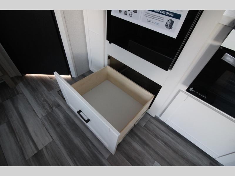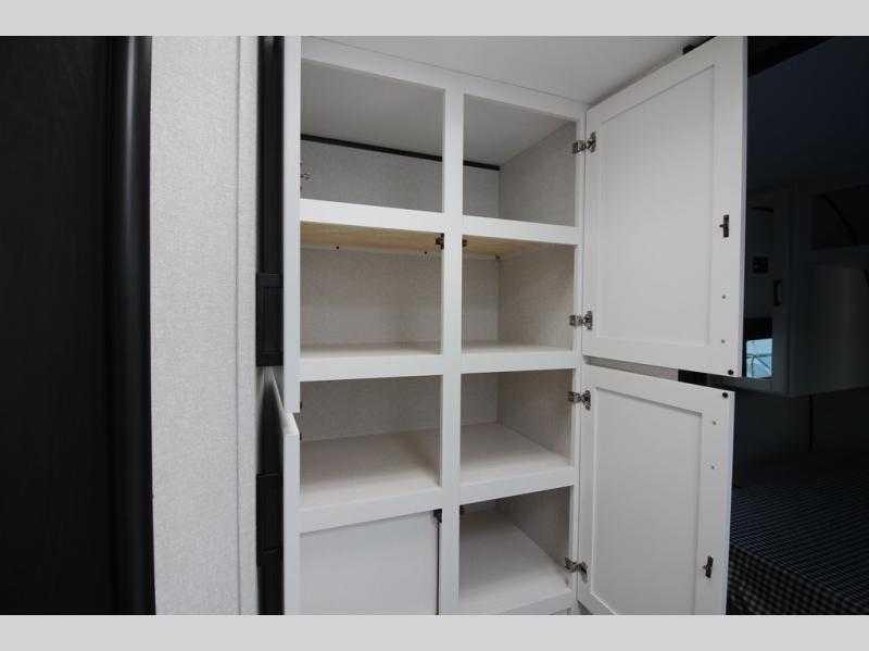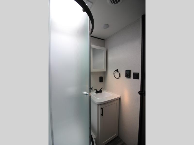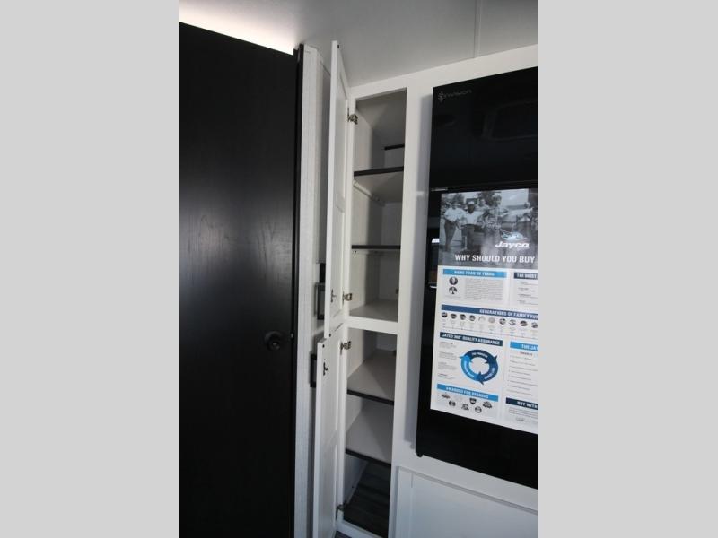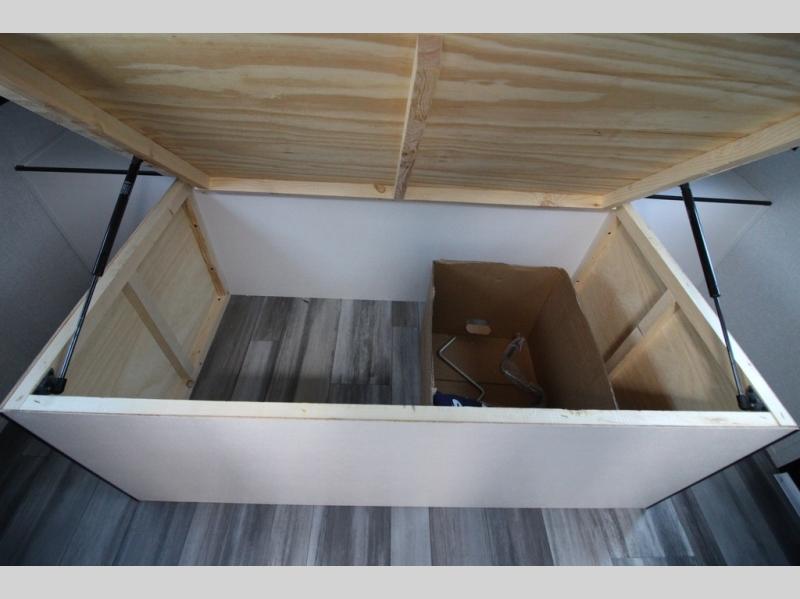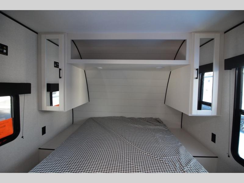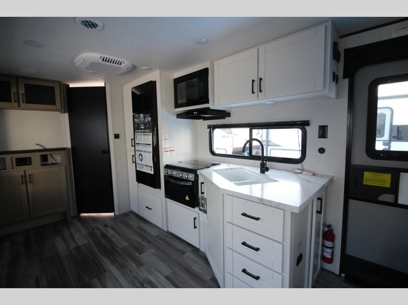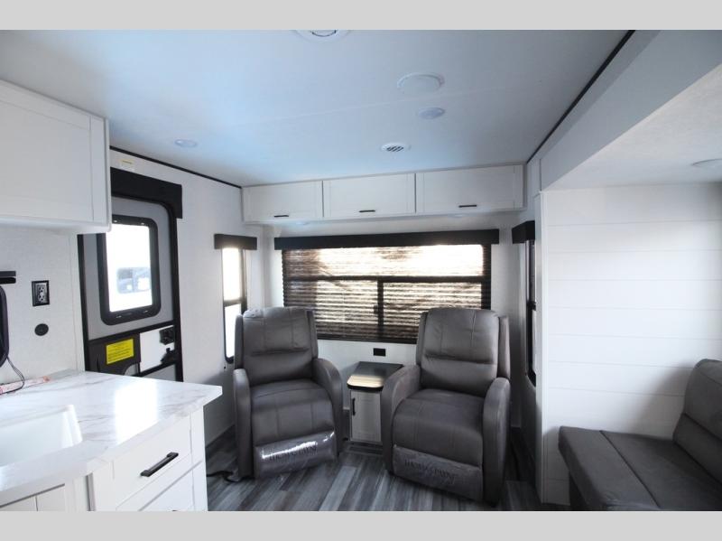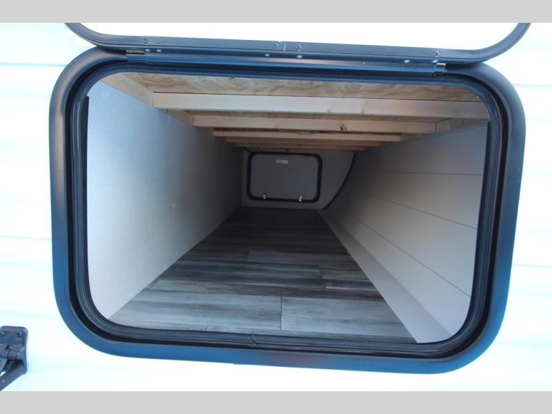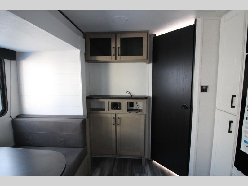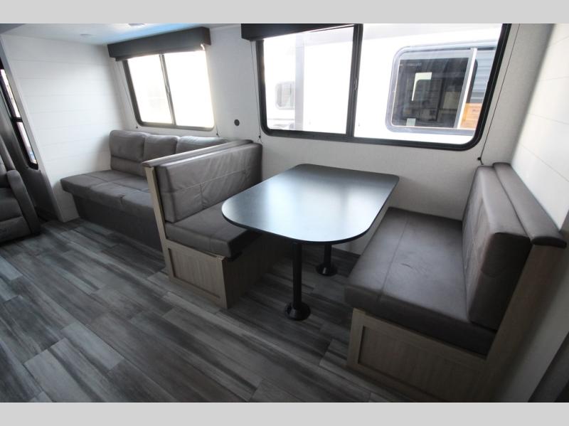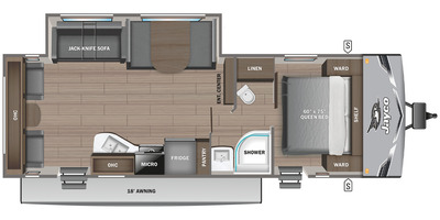 You can comfortably sleep up to six people in this trailer thanks to the RV queen bed in the front bedroom, plus the booth dinette and jack-knife sofa in the main living area! The chef of your crew will have a three burner cooktop and microwave oven to prepare meals, and everyone can store their favorite drinks in the 8 cu. ft. 12V refrigerator. The walk-through bath is spacious and includes a radius shower, toilet, a sink, and linen closet and is the full width of the unit. The outside storage will let you bring along camp chairs and games, fishing poles and more, plus the 18' 3" power awning with LED lights will create a nice place to gather in the evenings!