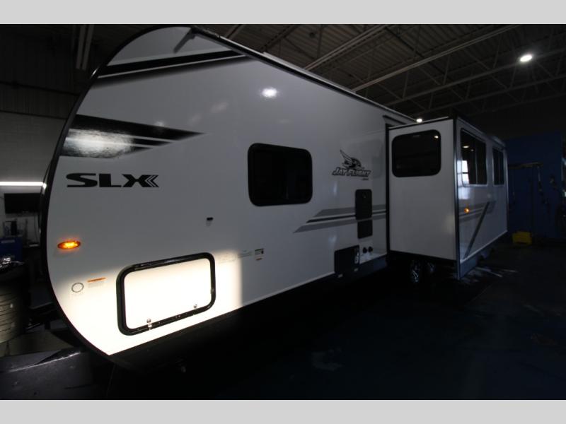The Jayco Jay Flight SLX travel trailer is quite easy to own because it is lightweight for an easier towing experience. Built on a fully integrated A-frame with galvanized-steel, impact-resistant wheel wells, the Jay Flight SLX has quality at its very foundation. That quality continues on to the electric self-adjusting brakes, easy-lube hubs, Magnum Truss roof system, and LP quick connect. Some of what the mandatory Customer Value Package includes is backup camera prep, Keyed-Alike entry and baggage doors, and an on-demand tankless water heater.