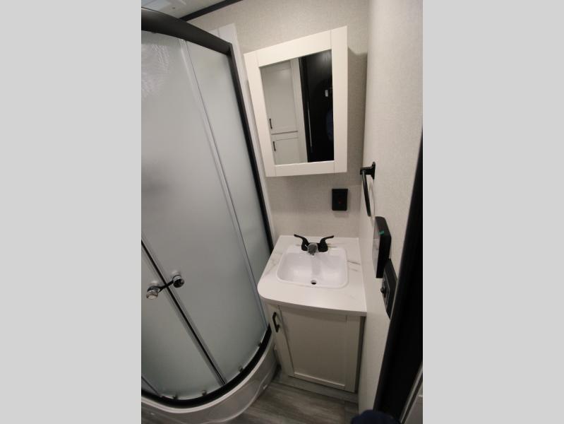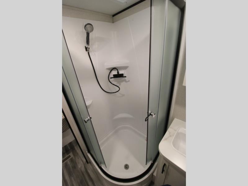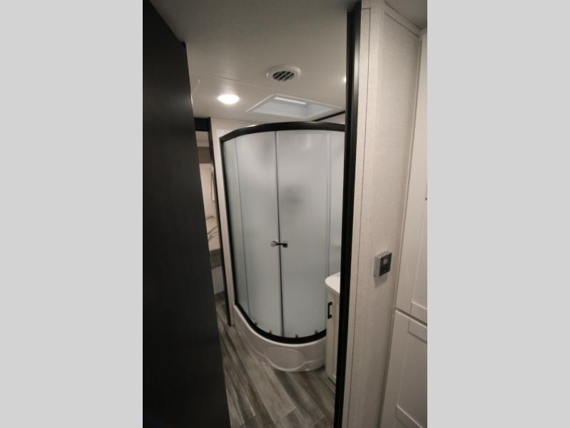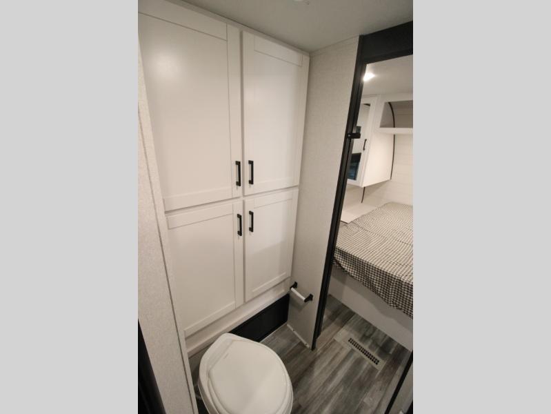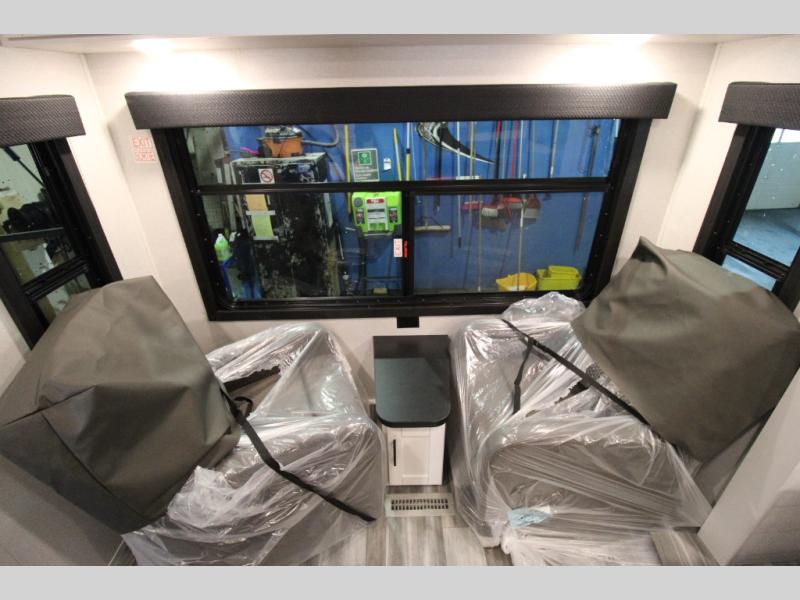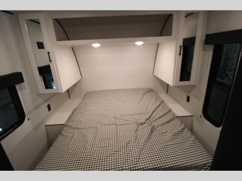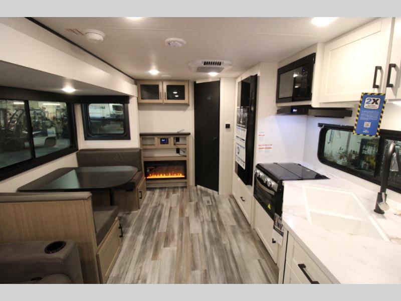 You can comfortably sleep up to six people in this trailer thanks to the RV queen bed in the front bedroom, plus the booth dinette and jack-knife sofa in the main living area! The chef of your crew will have a three burner cooktop and microwave oven to prepare meals, and everyone can store their favorite drinks in the 8 cu. ft. 12V refrigerator. The walk-through bath is spacious and includes a radius shower, toilet, a sink, and linen closet and is the full width of the unit. The outside storage will let you bring along camp chairs and games, fishing poles and more, plus the 18' 3" power awning with LED lights will create a nice place to gather in the evenings!