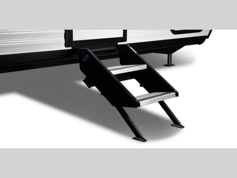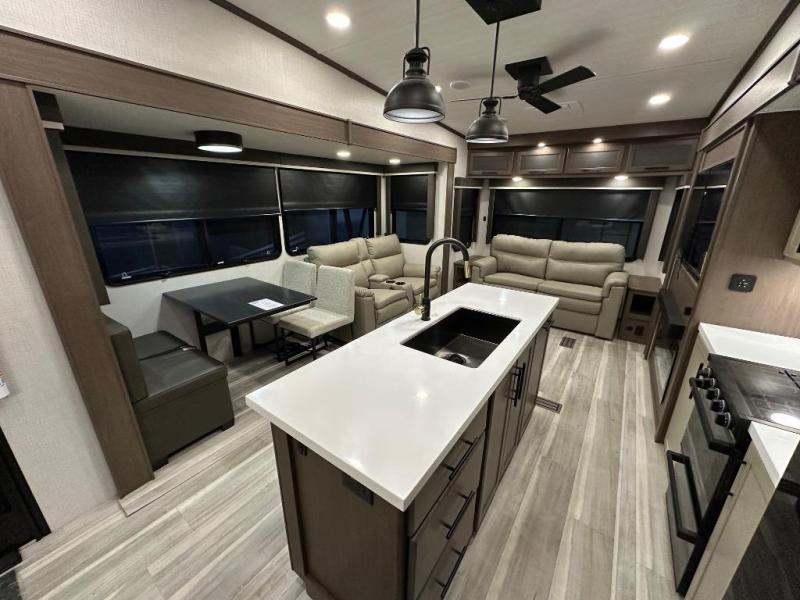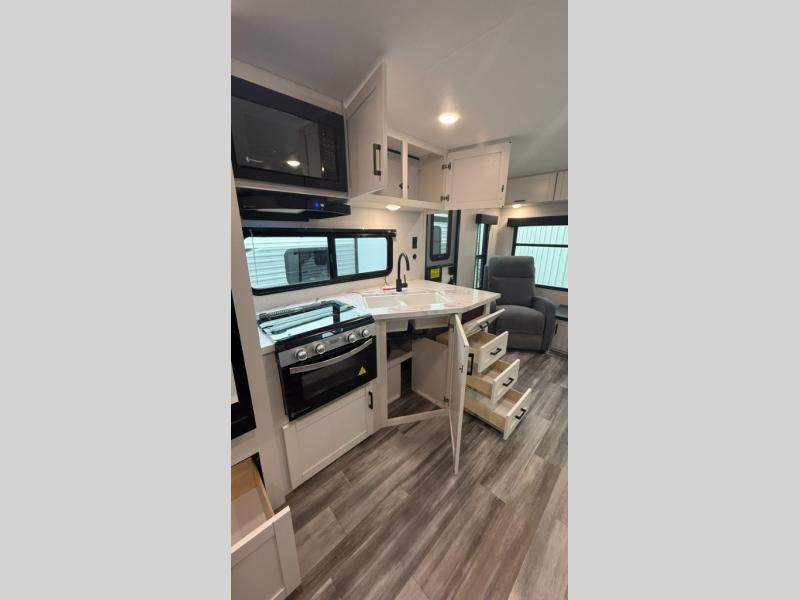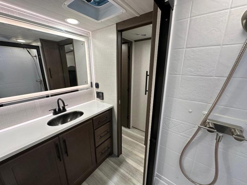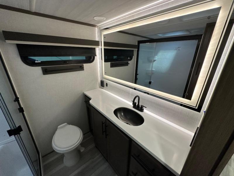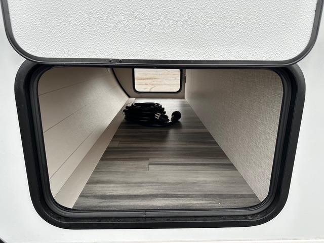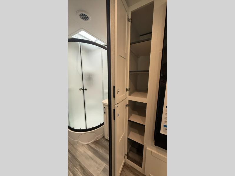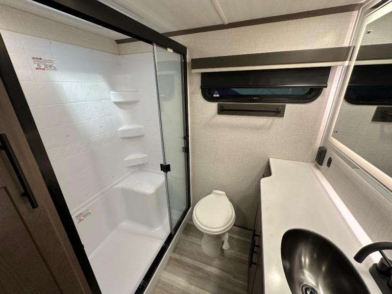 The walk-through bath is spacious and spans the full width of the unit, featuring a radius shower with skylight, toilet, sink with vanity storage, and a linen closet for towels and toiletries. The rear living area provides a cozy space to relax, with large windows for scenic campsite views and overhead cabinets for added storage. Outside storage compartments let you bring along camp chairs, fishing poles, and outdoor games, while the 18' 3" power awning with LED lights creates a welcoming spot to gather in the evenings rain or shine.