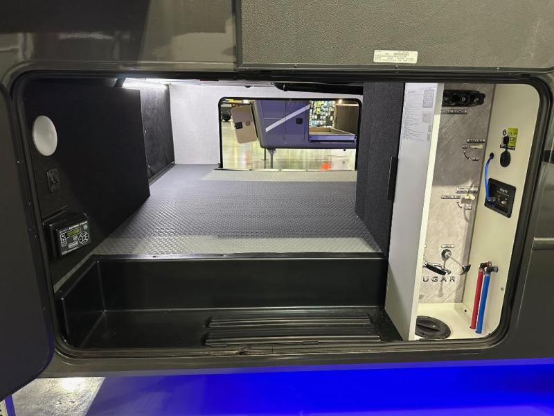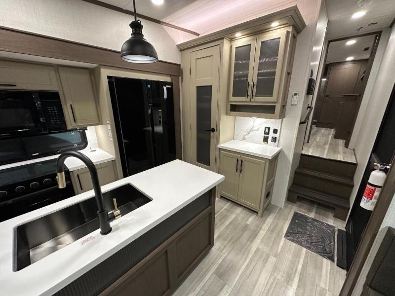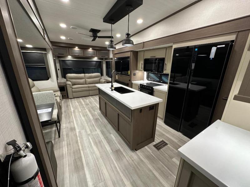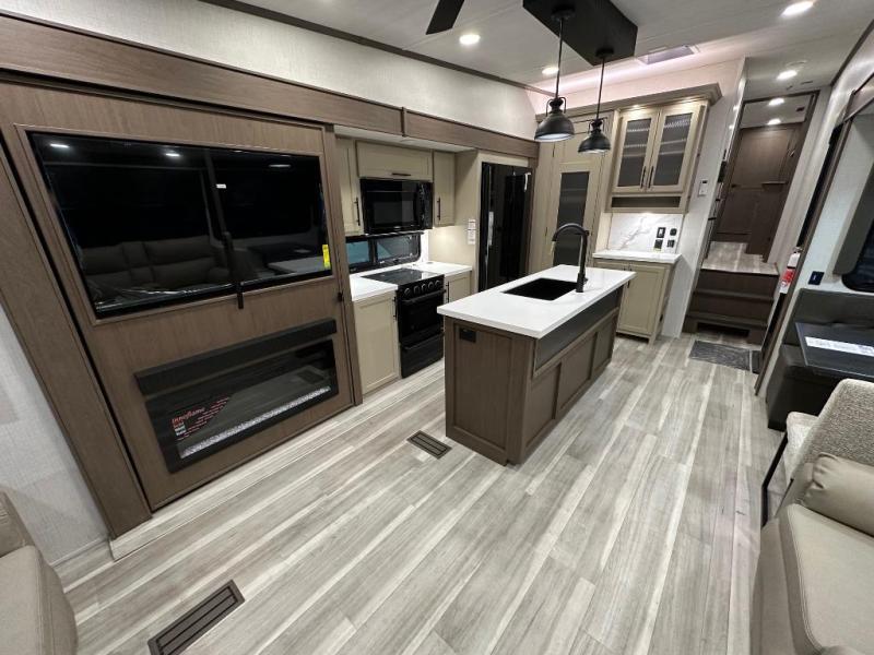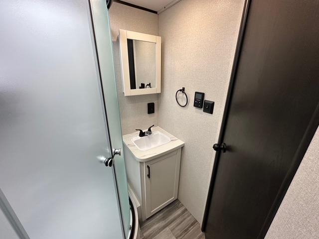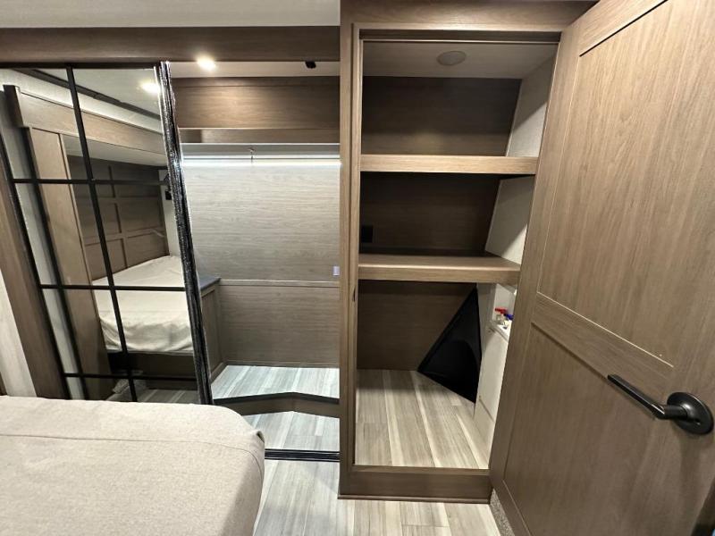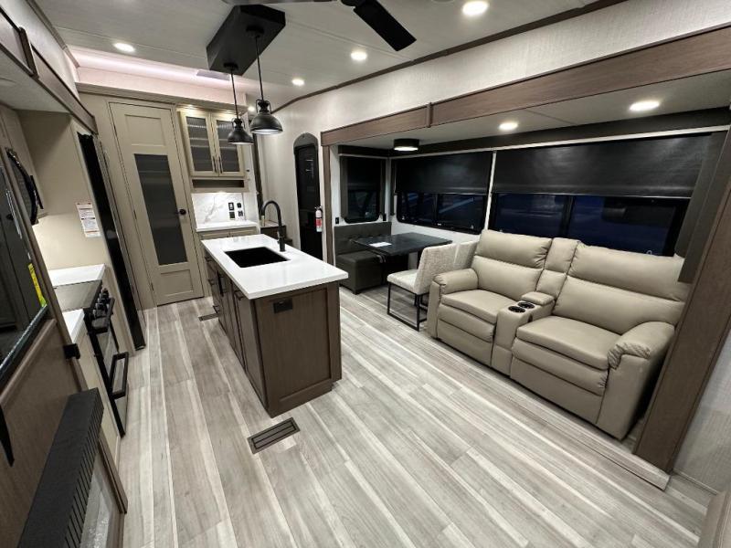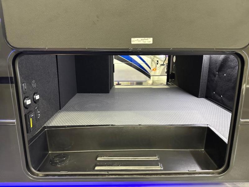 The walk-through bath is spacious and spans the full width of the unit, featuring a radius shower with skylight, toilet, sink with vanity storage, and a linen closet for towels and toiletries. The rear living area provides a cozy space to relax, with large windows for scenic campsite views and overhead cabinets for added storage. Outside storage compartments let you bring along camp chairs, fishing poles, and outdoor games, while the 18' 3" power awning with LED lights creates a welcoming spot to gather in the evenings rain or shine.