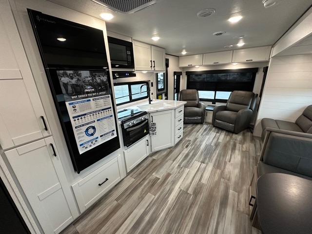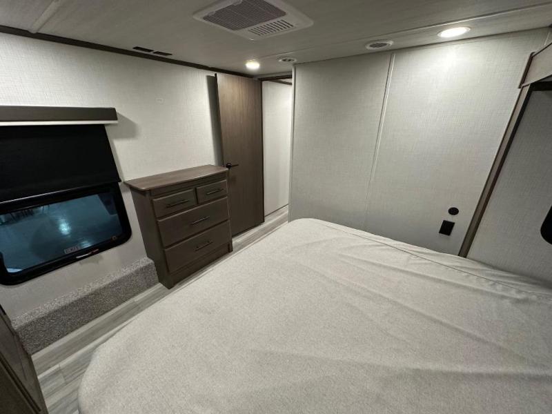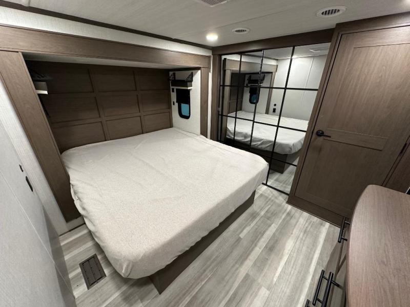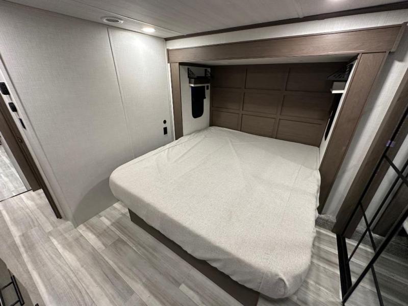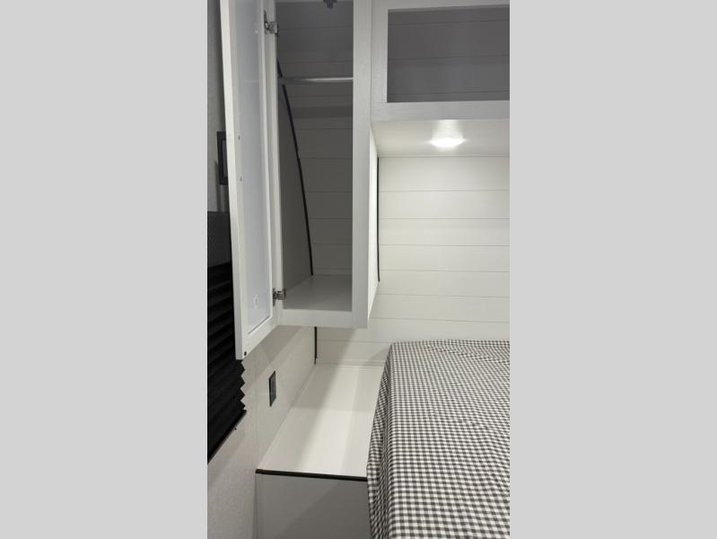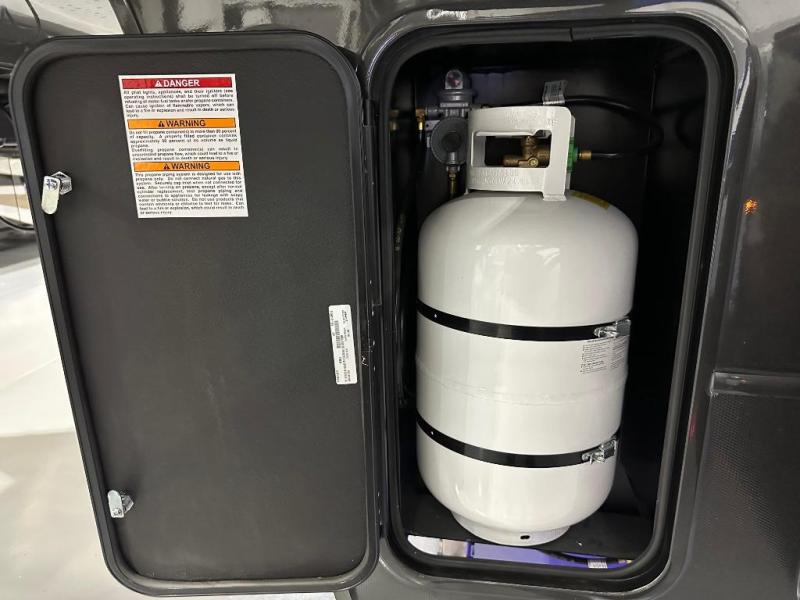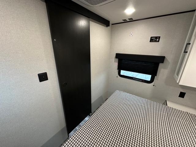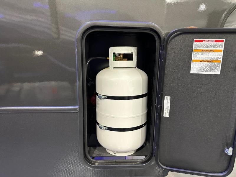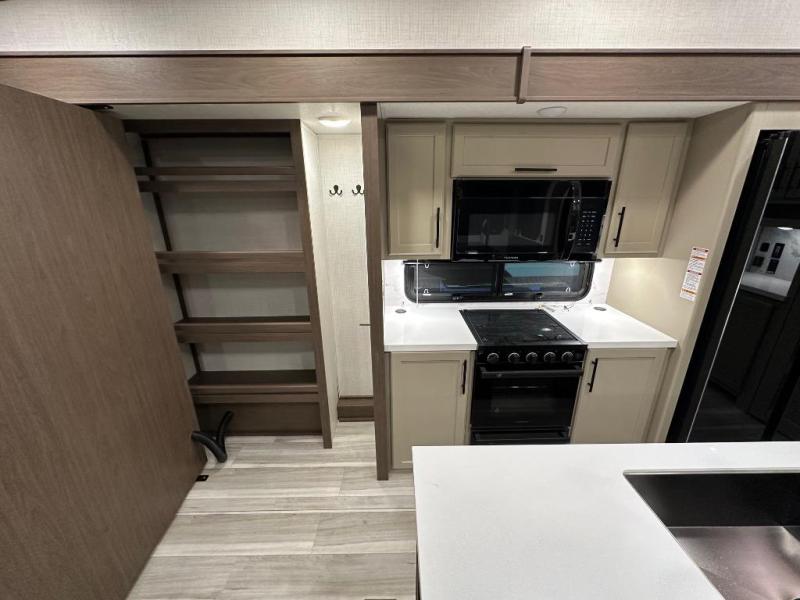 You can comfortably sleep up to six people in this trailer thanks to the RV queen bed in the private front bedroom, plus the booth dinette and jack-knife sofa in the main rear living area. Dual bedside wardrobes and overhead cabinets provide convenient storage for clothing and personal items, while windows on each side allow for natural light and cross ventilation. The chef of your crew will have a three-burner cooktop, microwave oven, and ample counter space to prepare meals, and everyone can store their favorite drinks and snacks in the 8 cu. ft. 12V refrigerator. A double-door pantry adds even more space for dry goods and paper products.