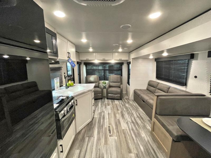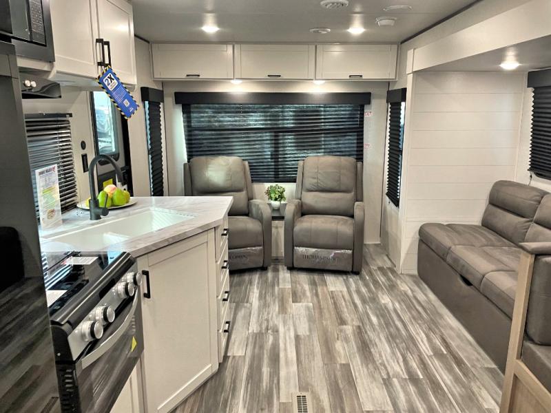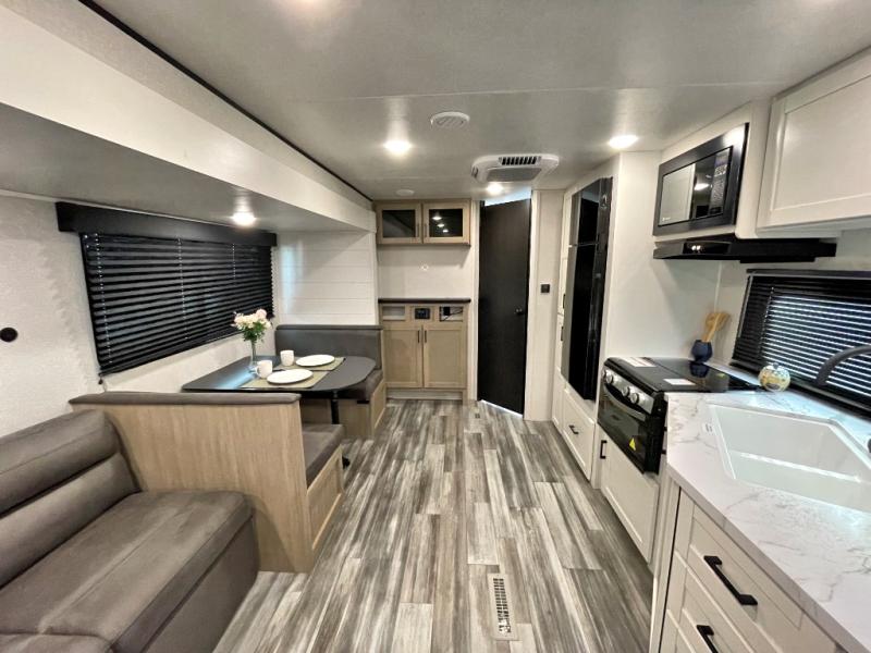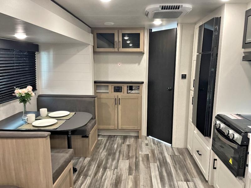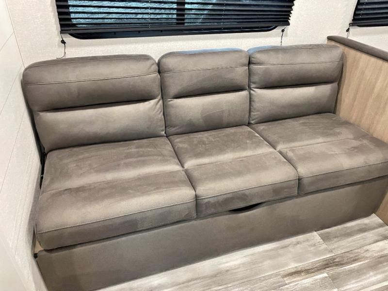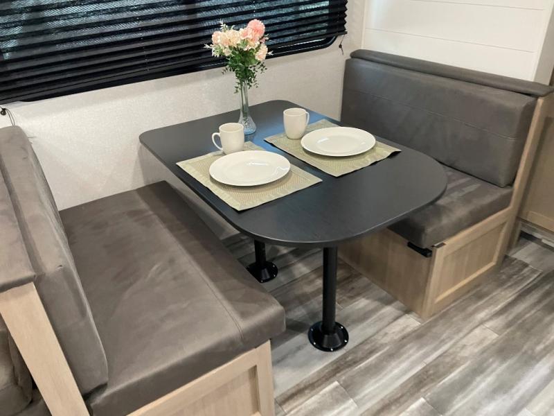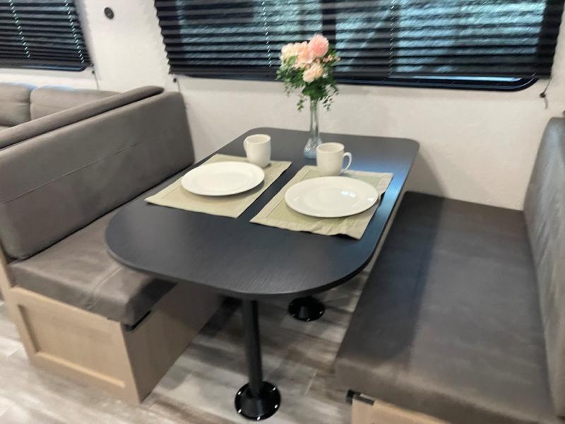 You can comfortably sleep up to six people in this trailer thanks to the RV queen bed in the front bedroom, plus the booth dinette and jack-knife sofa in the main living area! The chef of your crew will have a three burner cooktop and microwave oven to prepare meals, and everyone can store their favorite drinks in the 8 cu. ft. 12V refrigerator. The walk-through bath is spacious and includes a radius shower, toilet, a sink, and linen closet and is the full width of the unit. The outside storage will let you bring along camp chairs and games, fishing poles and more, plus the 18' power awning with LED lights will create a nice place to gather in the evenings!