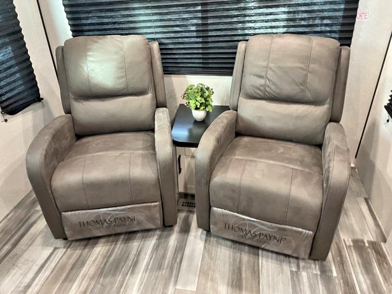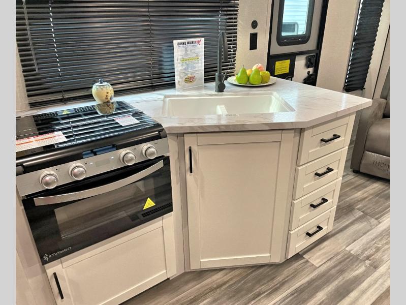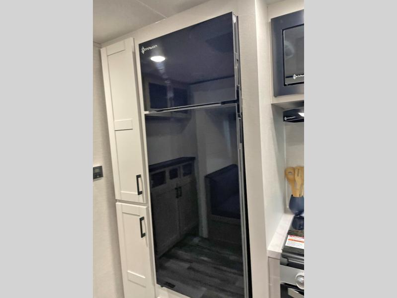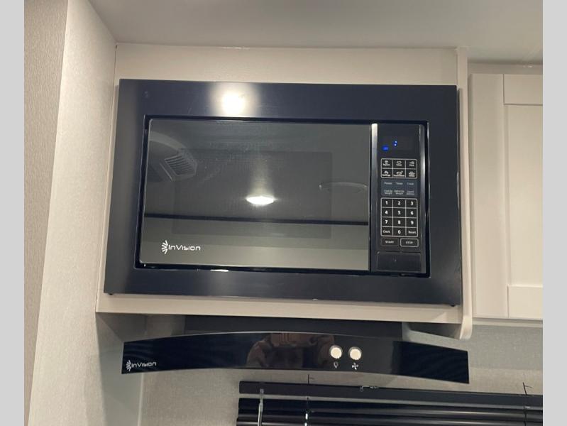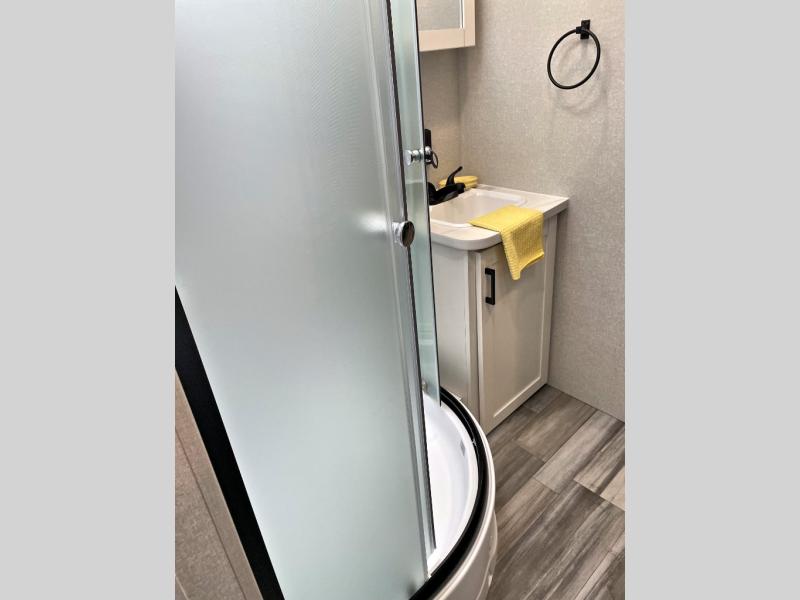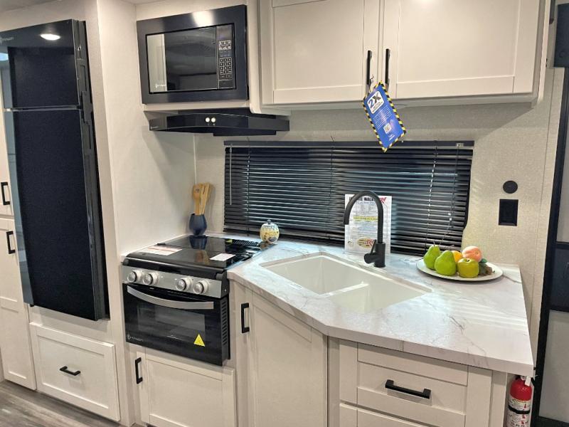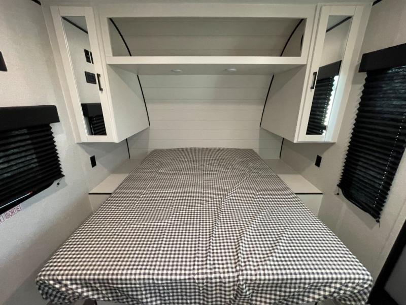 You can comfortably sleep up to six people in this trailer thanks to the RV queen bed in the front bedroom, plus the booth dinette and jack-knife sofa in the main living area! The chef of your crew will have a three burner cooktop and microwave oven to prepare meals, and everyone can store their favorite drinks in the 8 cu. ft. 12V refrigerator. The walk-through bath is spacious and includes a radius shower, toilet, a sink, and linen closet and is the full width of the unit. The outside storage will let you bring along camp chairs and games, fishing poles and more, plus the 18' power awning with LED lights will create a nice place to gather in the evenings!