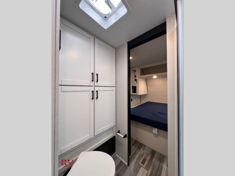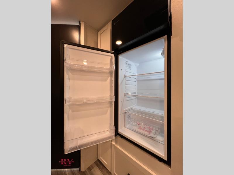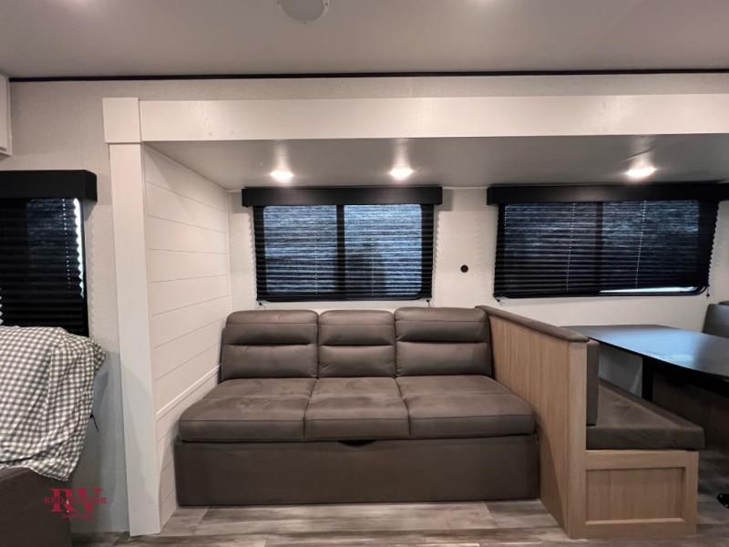 You can comfortably sleep up to six people in this trailer thanks to the RV queen bed in the front bedroom, plus the booth dinette and jack-knife sofa in the main living area! The chef of your crew will have a three burner cooktop and microwave oven to prepare meals, and everyone can store their favorite drinks in the 8 cu. ft. 12V refrigerator. The walk-through bath is spacious and includes a radius shower, toilet, a sink, and linen closet and is the full width of the unit. The outside storage will let you bring along camp chairs and games, fishing poles and more, plus the 18' power awning with LED lights will create a nice place to gather in the evenings!