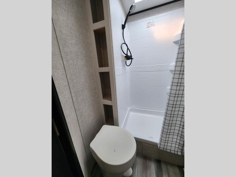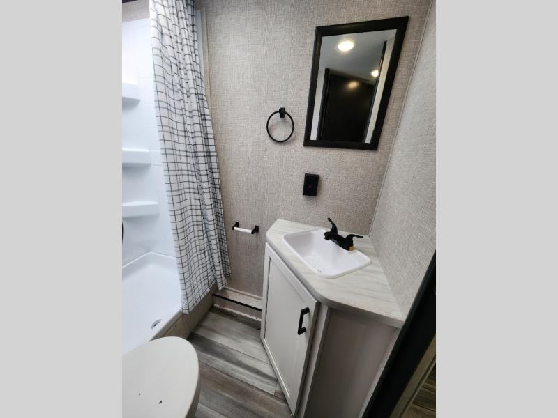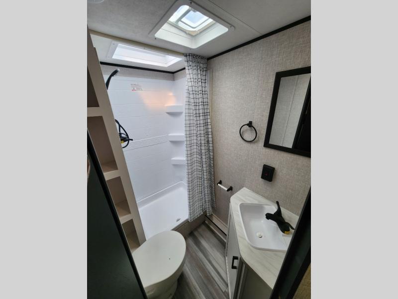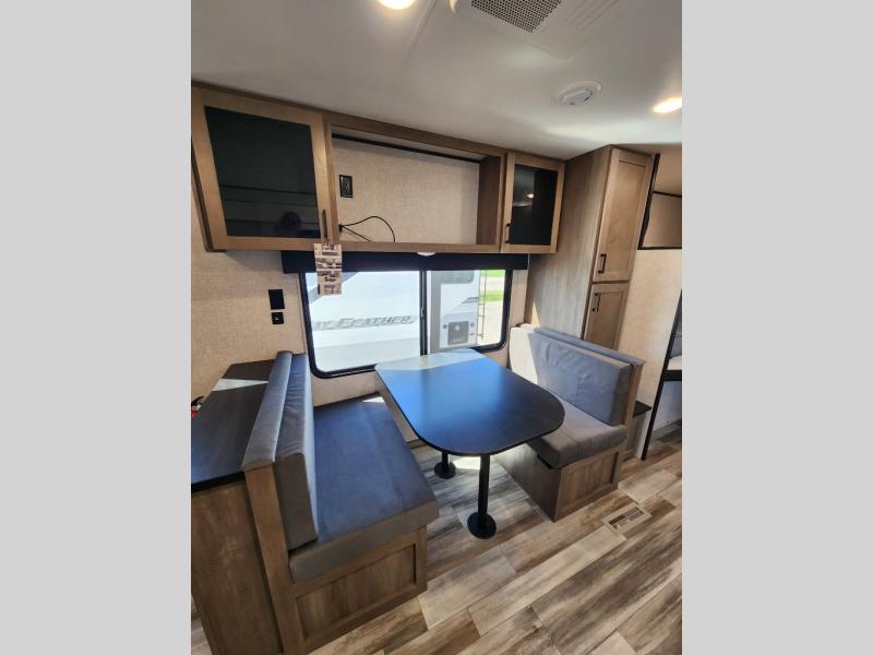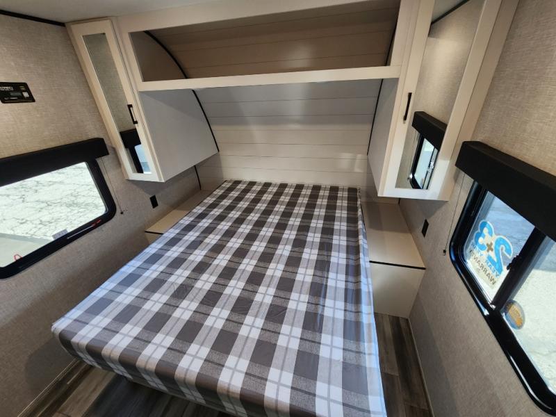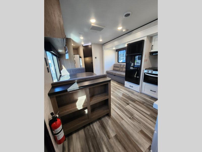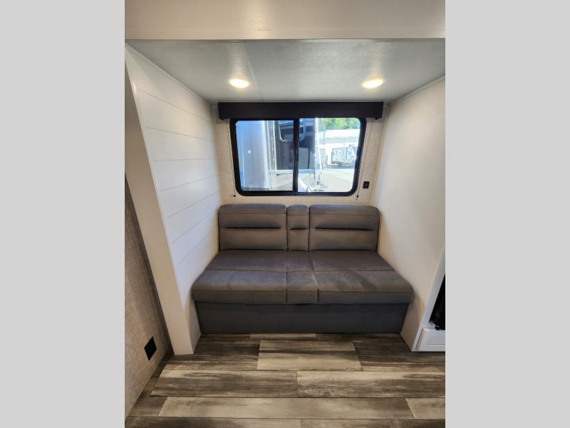 Wherever you decide to camp, you'll be met with comforts each day with this spacious travel trailer. There is a large slide out that will give the dog more space to nap on the floor. Your crew can relax on the jack-knife sofa, play a game at the booth dinette, or visit outdoors under the 16' power awning with LED lights. The outside kitchen is complete with an outdoor refrigerator for cold drinks, and there is an LP Quick Connect if you want to add your own grill. Head inside to clean up in the full bath, then head to bed in the front private bedroom. Here, you'll find a queen bed, dual wardrobes, plus a shelf for books. And your guests can sleep on the double-size bunks and living room furniture!