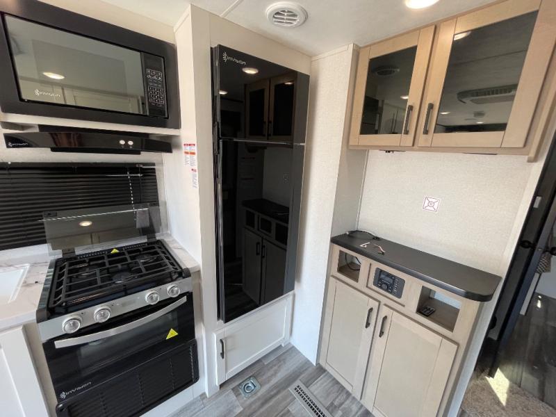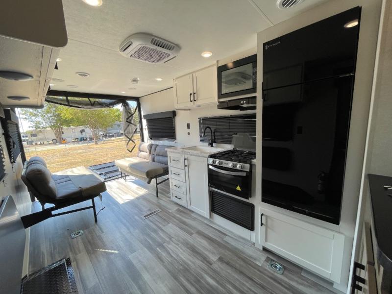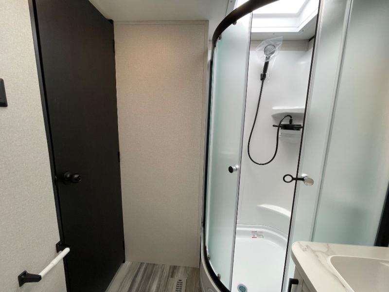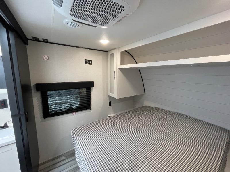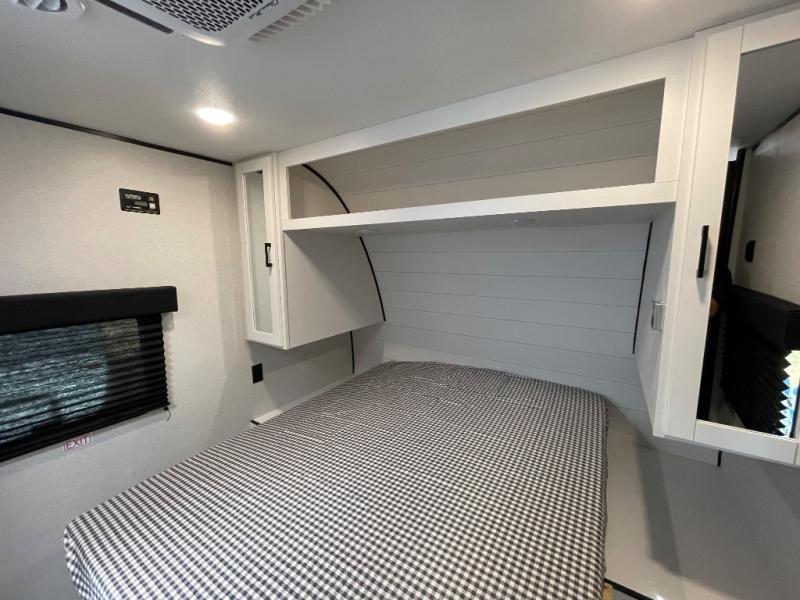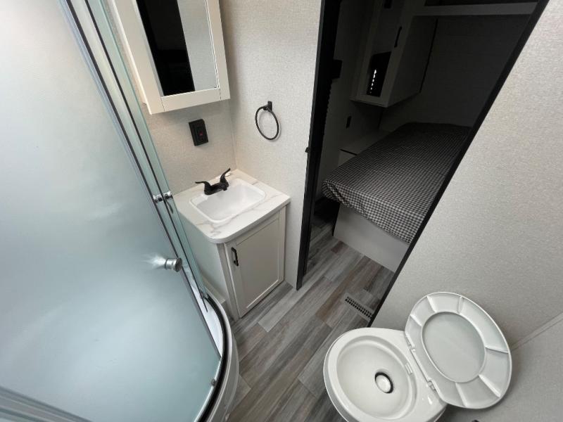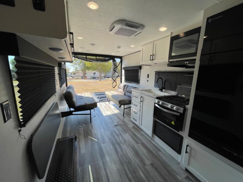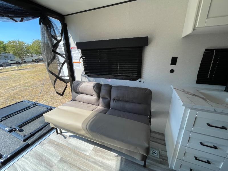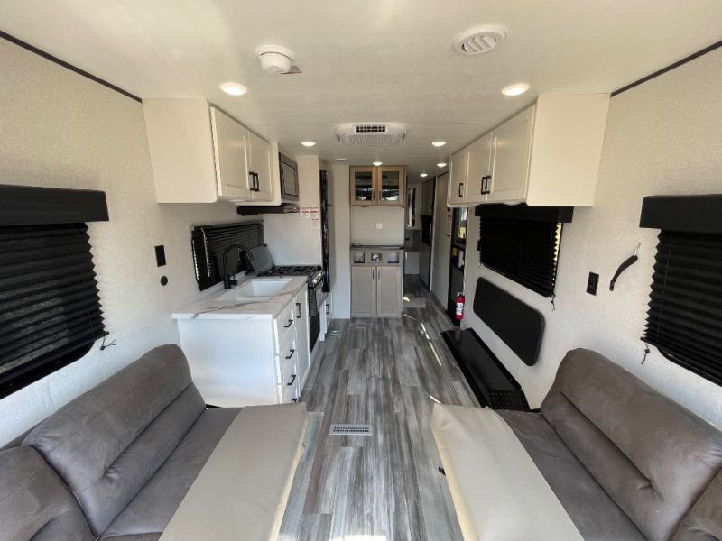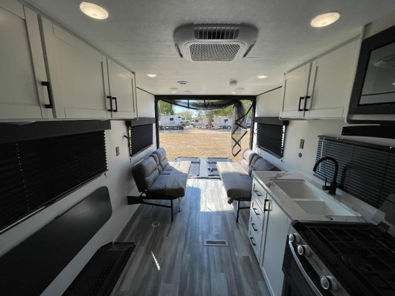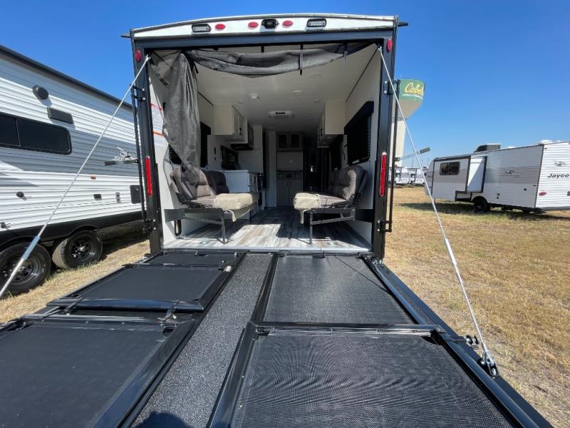 When you are ready to ride your off-road toys, relax in the great outdoors and unwind after a ride and do it all over again the next day, then load up and head to the campsite! You will have 5' 11" of cargo space plus a little more space in between the kitchen amenities and the flip-up bar top with stools to load more gear and such. The 7' 3" opening and 7' ramp door makes unloading easy as well. The convertible sofas and removable table allow more to dine, and the double entry bathroom will keep everyone clean before bedtime. The front bedroom offers privacy for the owners, and comfortable nights on a queen bed. And the power awning offers shade during the daytime when you want to relax outside.