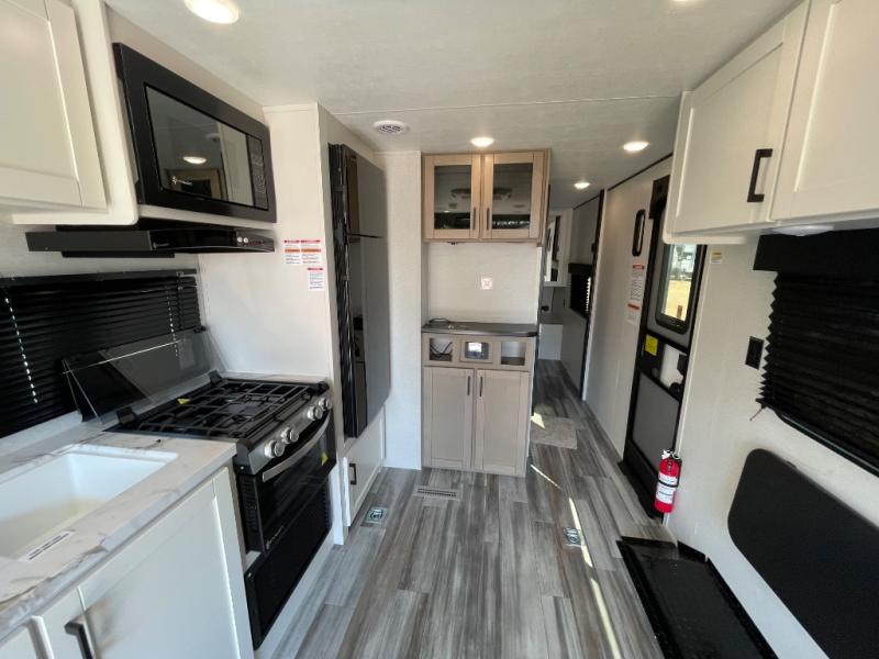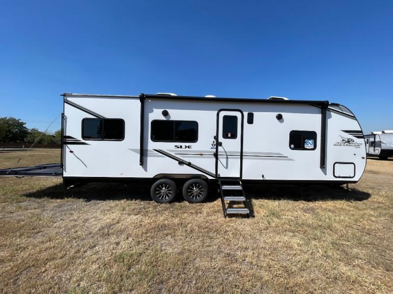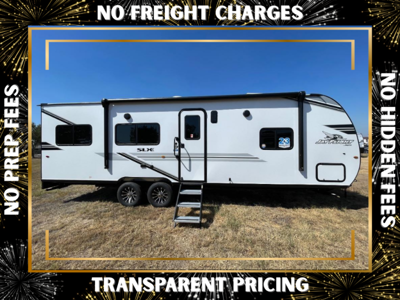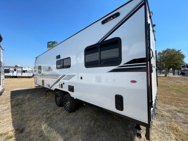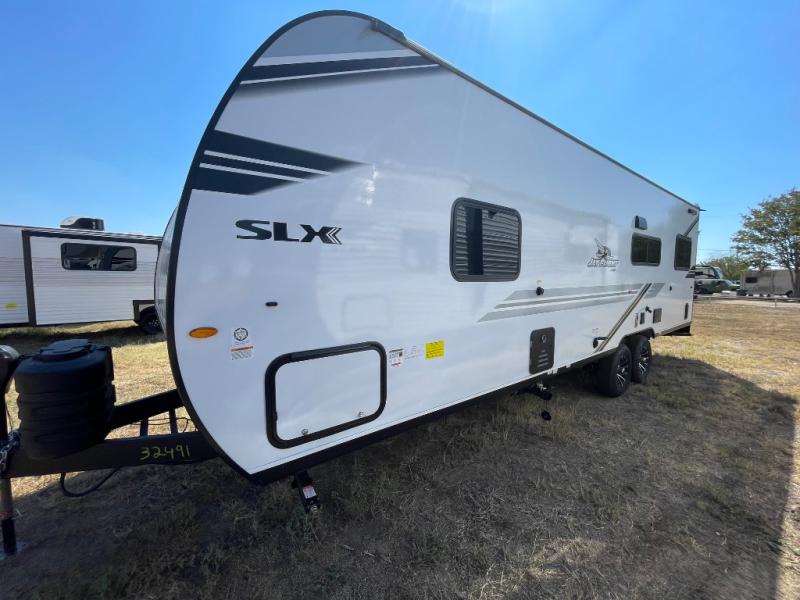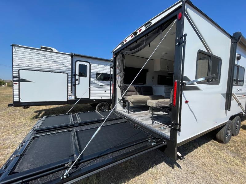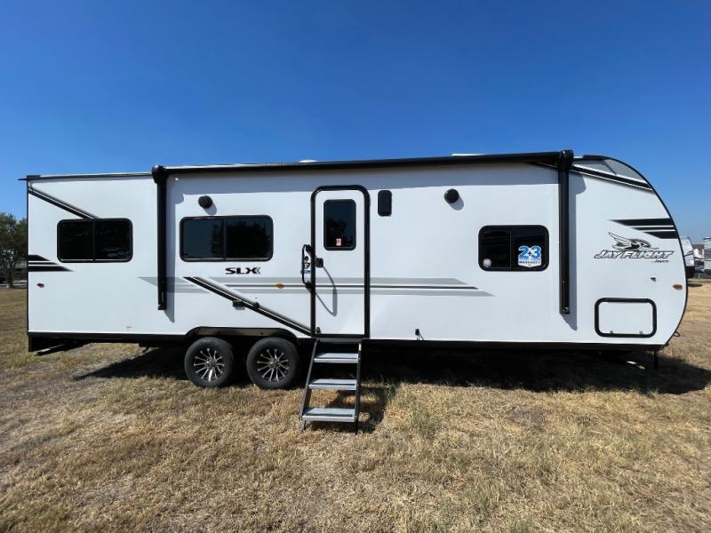 The Jayco Jay Flight SLX toy hauler travel trailer is quite easy to own because it is lightweight for an easier towing experience. Built on a fully integrated A-frame with galvanized-steel, impact-resistant wheel wells, the Jay Flight SLX has quality at its very foundation. That quality continues on to the electric self-adjusting brakes, easy-lube hubs, Magnum Truss roof system, and LP quick connect. Some of what the mandatory Customer Value Package includes is backup camera prep, Keyed-Alike entry and baggage doors, and an on-demand tankless water heater.