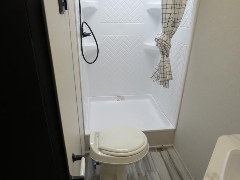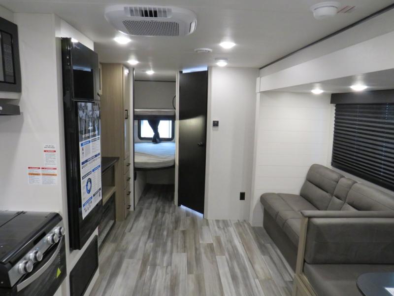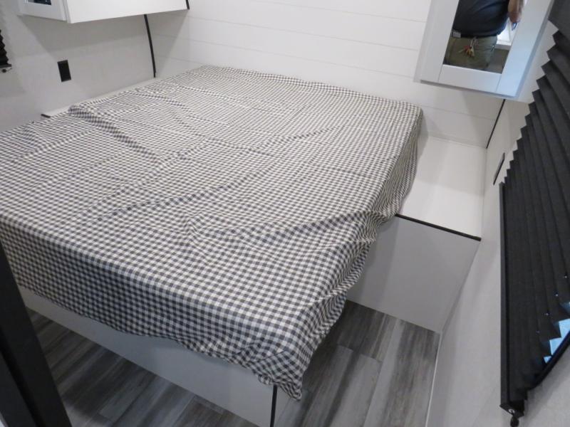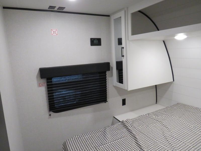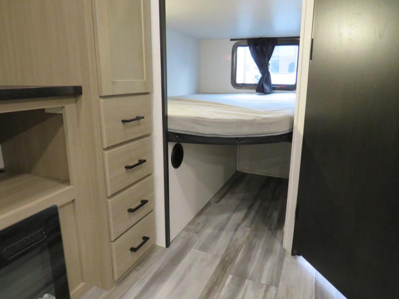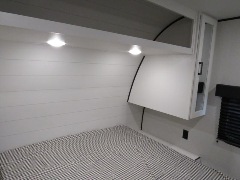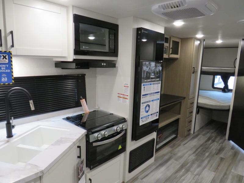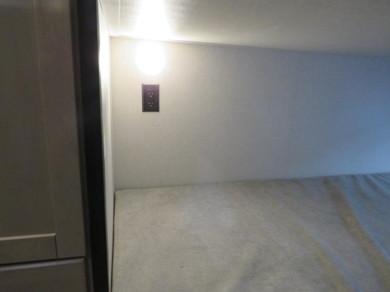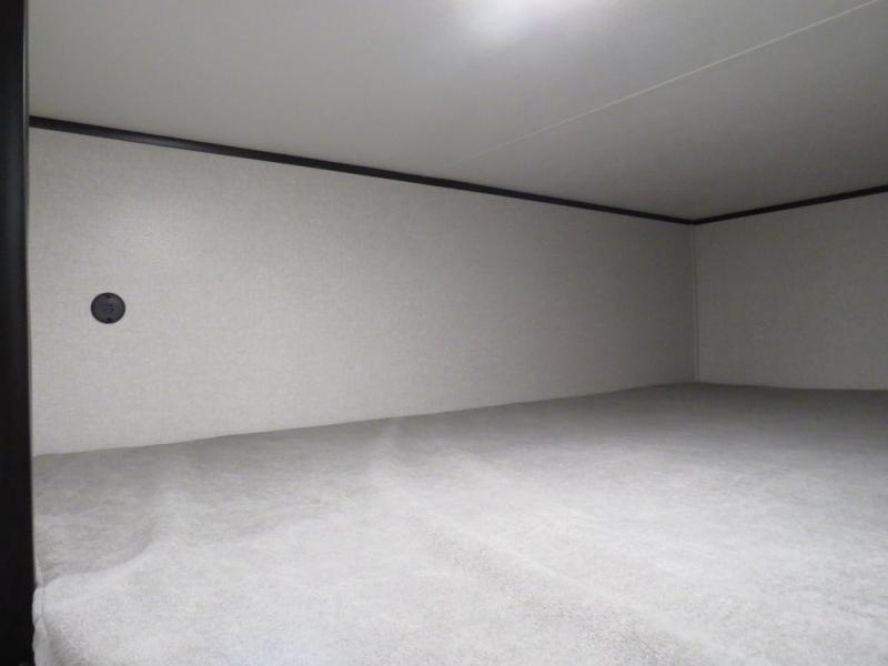 Comfort and fun is waiting for you! This trailer allows the owners to sleep in privacy behind the space saving sliding door on a 60" x 75" queen bed. And the kids or grandkids can sleep on the double-size bunks in the rear next to the full bathroom including a shower. They even have a wardrobe nearby for their things. The slide out jackknife sofa and U-shaped dinette offers more floor space, a place to relax and dine, plus you can play games at the dinette. This model also includes an exterior refrigerator so you can grab a cold drink while under the 16' power awning!