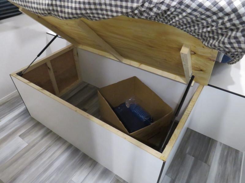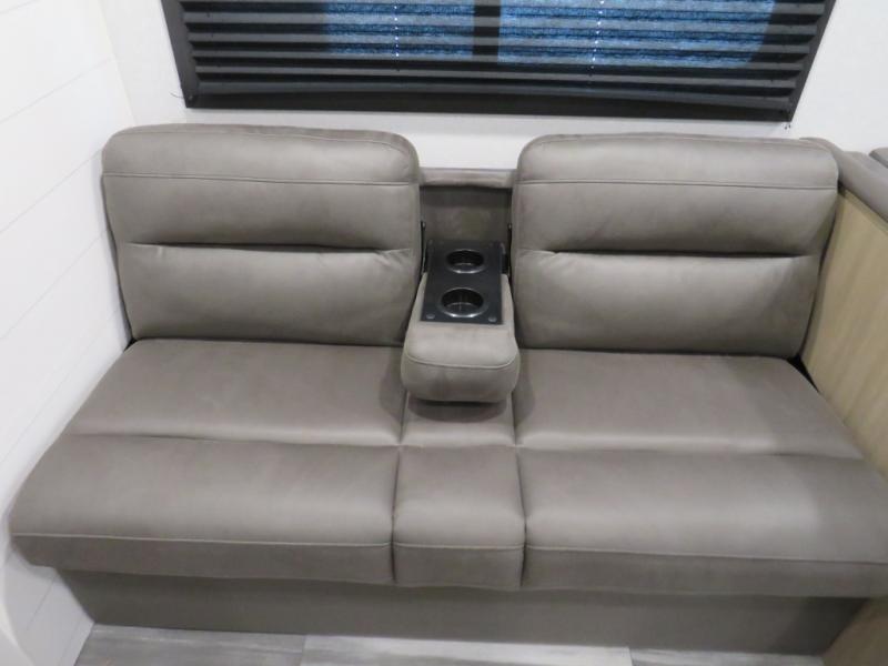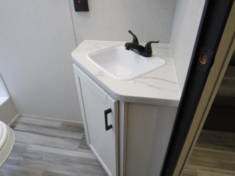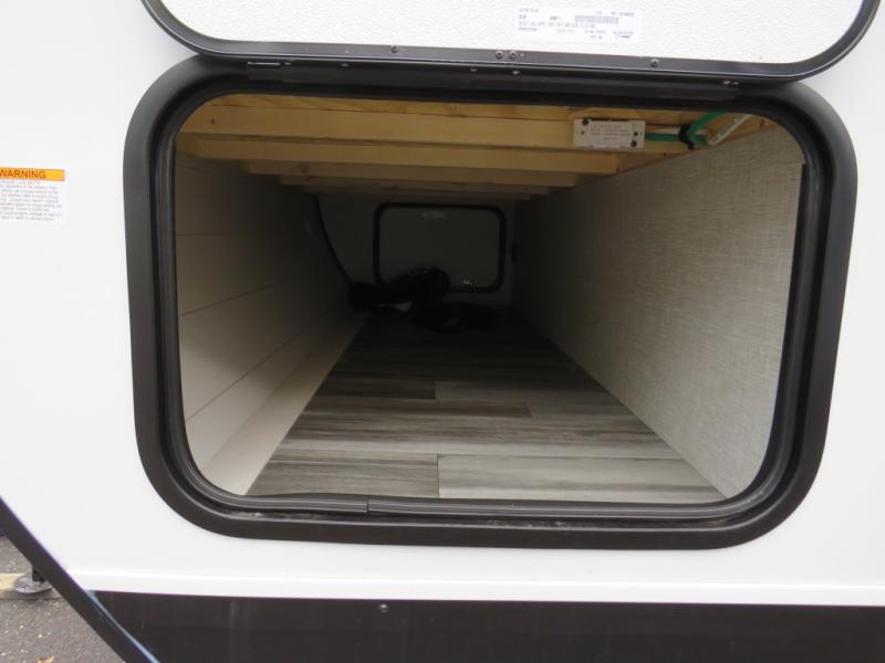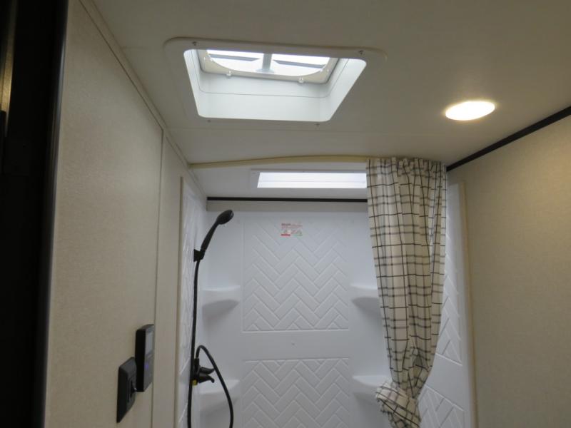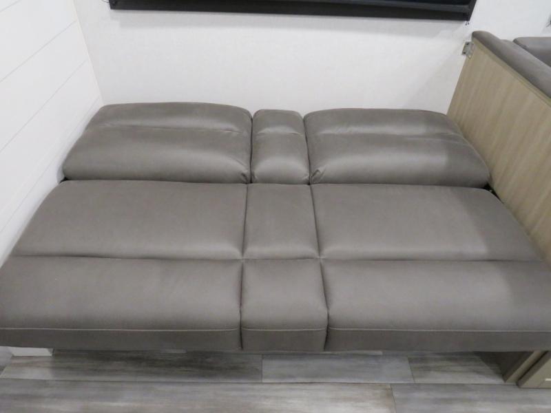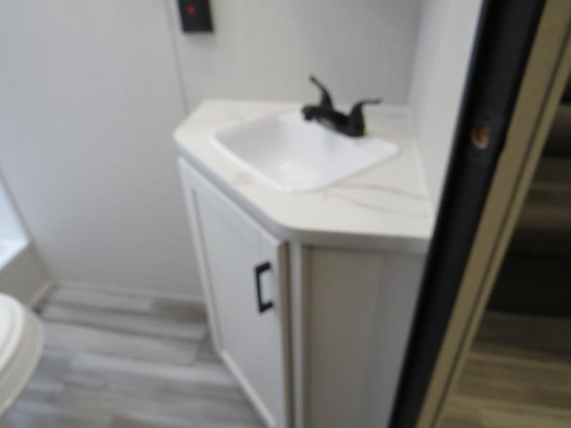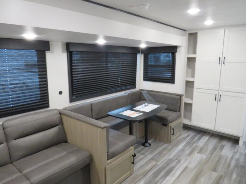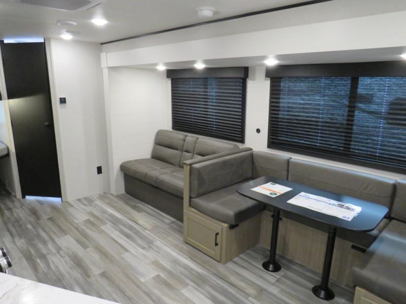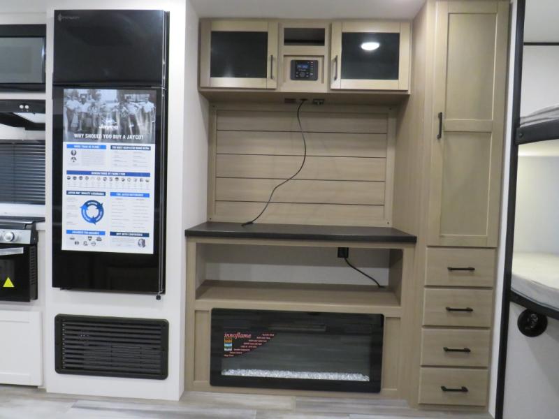 Comfort and fun is waiting for you! This trailer allows the owners to sleep in privacy behind the space saving sliding door on a 60" x 75" queen bed. And the kids or grandkids can sleep on the double-size bunks in the rear next to the full bathroom including a shower. They even have a wardrobe nearby for their things. The slide out jackknife sofa and U-shaped dinette offers more floor space, a place to relax and dine, plus you can play games at the dinette. This model also includes an exterior refrigerator so you can grab a cold drink while under the 16' power awning!