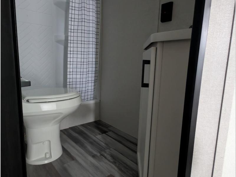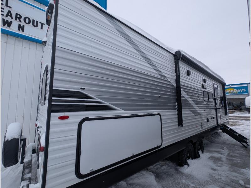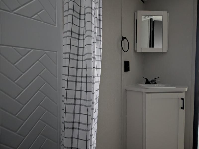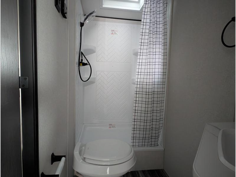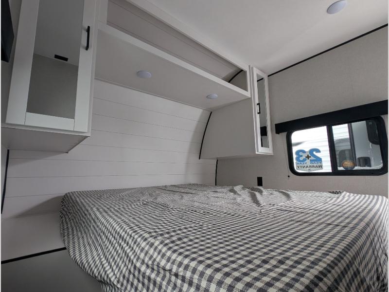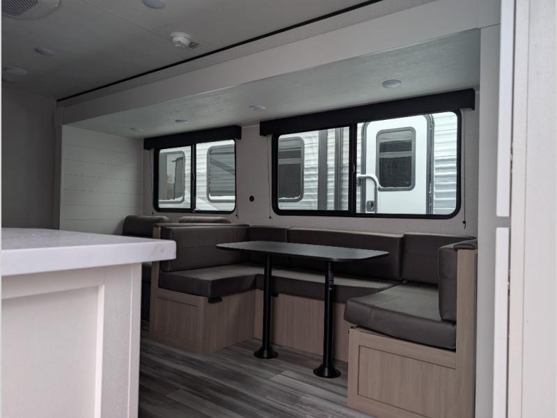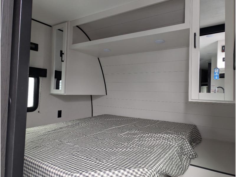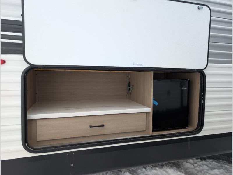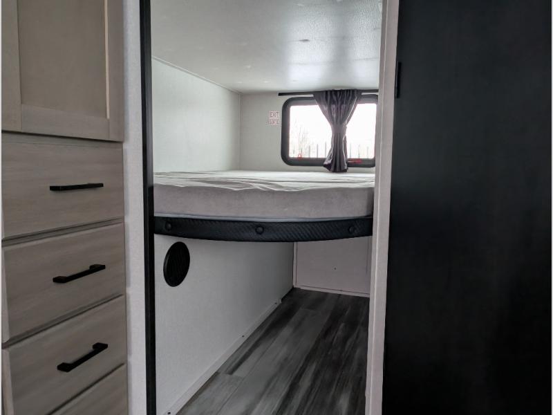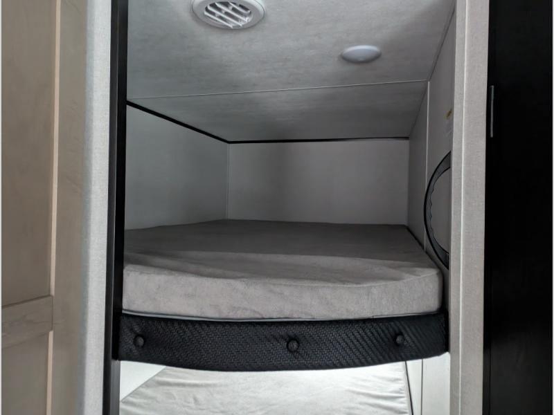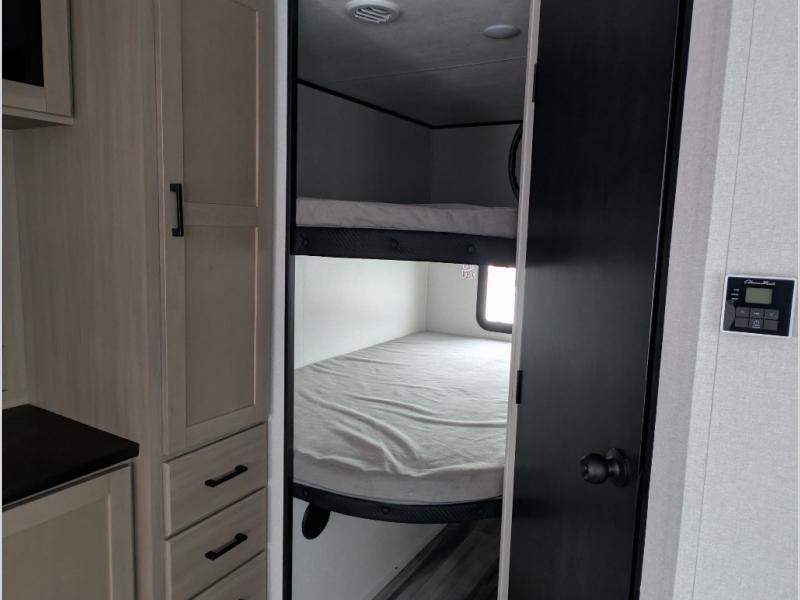 Comfort and fun is waiting for you! This trailer allows the owners to sleep in privacy behind the space saving sliding door on a 60" x 75" queen bed. And the kids or grandkids can sleep on the double-size bunks in the rear next to the full bathroom including a shower. They even have a wardrobe nearby for their things. The slide out jackknife sofa and U-shaped dinette offers more floor space, a place to relax and dine, plus you can play games at the dinette. This model also includes an exterior refrigerator so you can grab a cold drink while under the 16' power awning!