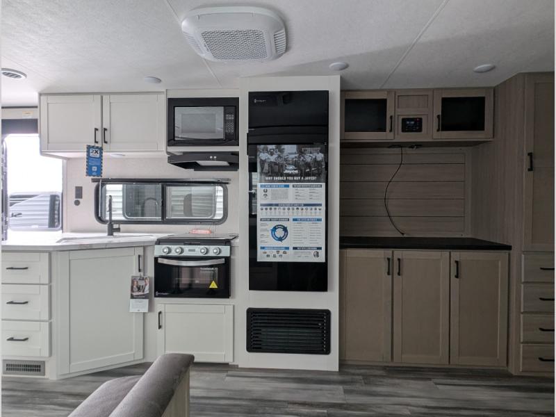 The Jayco Jay Flight SLX travel trailer is quite easy to own because it is lightweight for an easier towing experience. Built on a fully integrated A-frame with galvanized-steel, impact-resistant wheel wells, the Jay Flight SLX has quality at its very foundation. That quality continues on to the electric self-adjusting brakes, easy-lube hubs, Magnum Truss roof system, and LP quick connect. Some of what the mandatory Customer Value Package includes is backup camera prep, Keyed-Alike entry and baggage doors, and an on-demand tankless water heater.