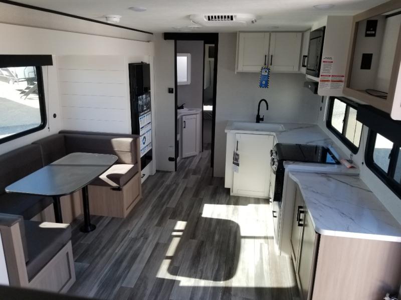 It's time to ditch that old tent and upgrade to this spacious travel trailer! The littles ones or your guests will love the double-size bunks with steps in the back, while you take the front master bedroom. One of the dual entry doors is also found here for convenience, and the walk-through bath is easily accessible for everyone. A U-shaped dinette slide and jack-knife sofa in the main living area provide your crew with space to relax and dine together, and the fully equipped kitchen lets you cook up your best meals. This unit includes ample storage space, including additional kitchen storage, wardrobes, overhead cabinets, and exterior storage!