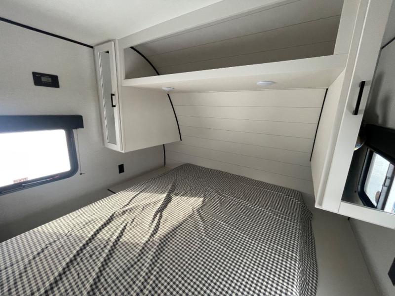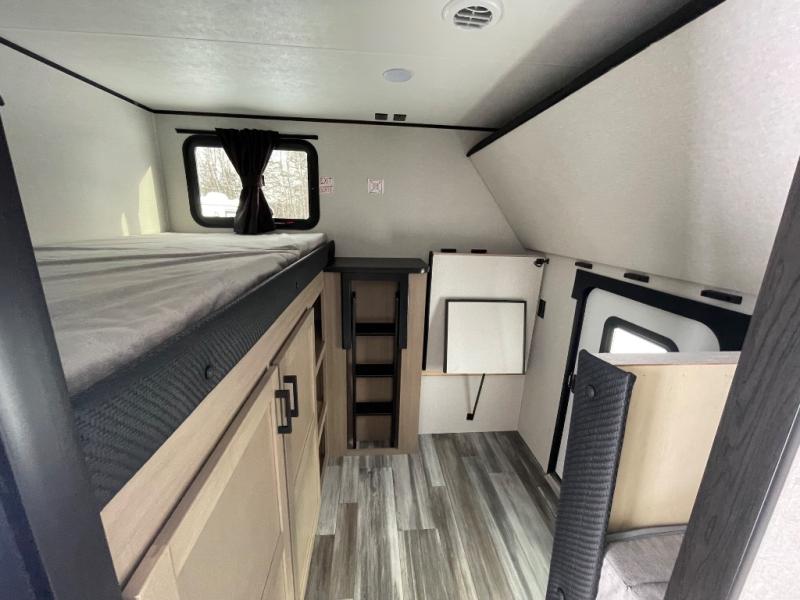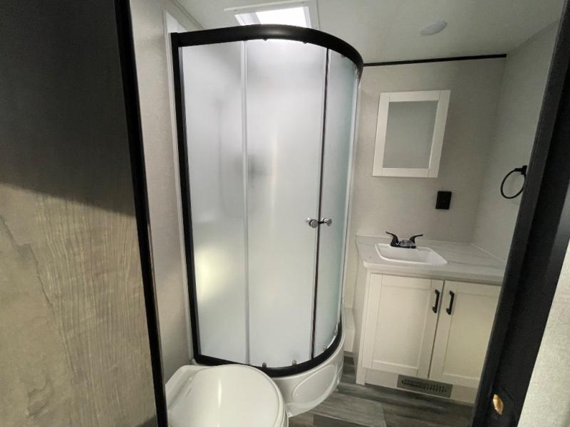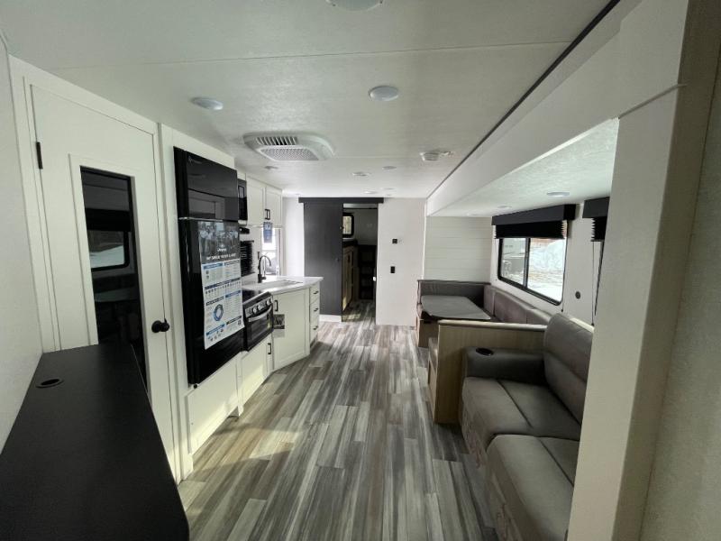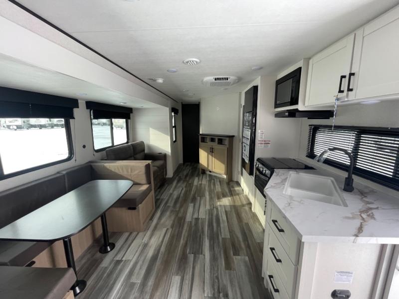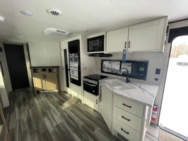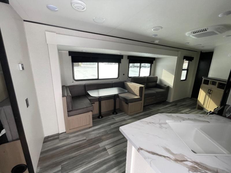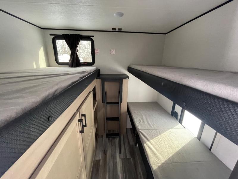 It's time to ditch that old tent and upgrade to this spacious travel trailer! There is a rear private bunkhouse includes a flip-up bunk over a 28" x 76" bunk, plus a bunk across the room and a wardrobe. You'll enjoy the front private bedroom all to yourselves with a queen bed and dual wardrobes, and the full bath is close by for easy nighttime use. A U-shaped dinette slide and sofa in the main living area provide your crew with space to relax and dine together, and the fully equipped kitchen lets you cook up your best meals. Outside, you'll find exterior storage, an 18' power awning, plus an outdoor refrigerator, shelf, and TV prep!