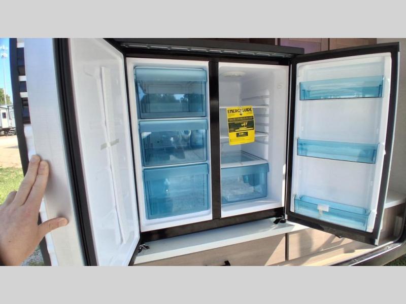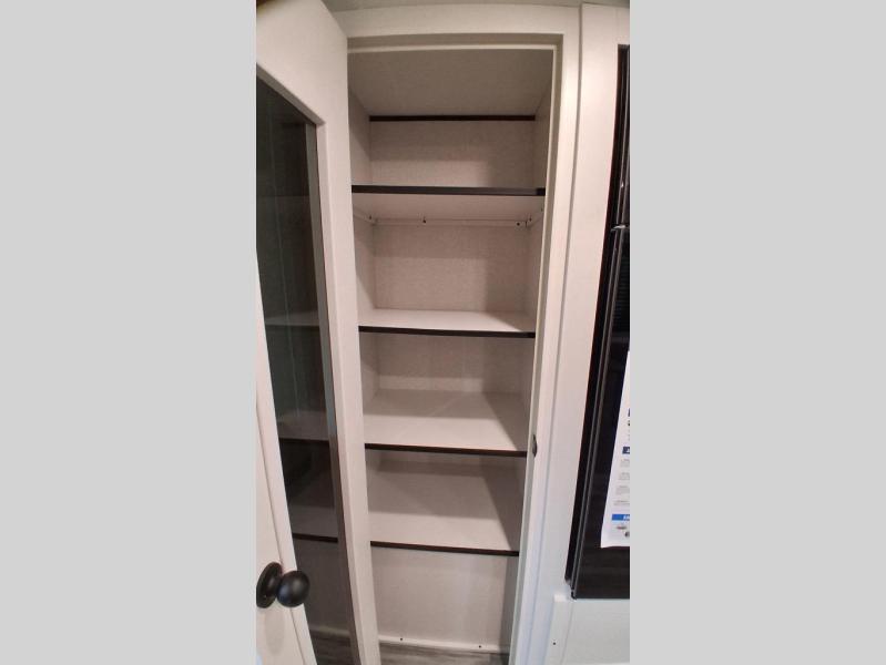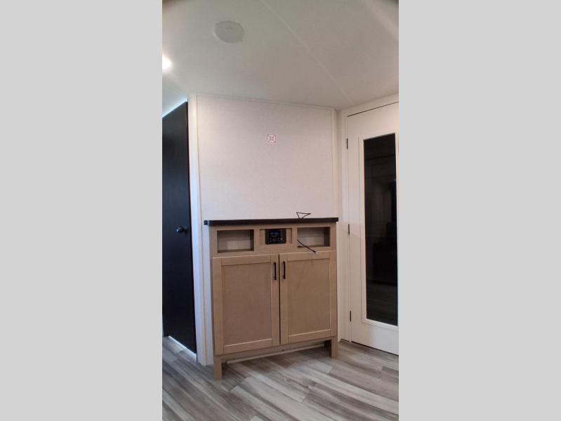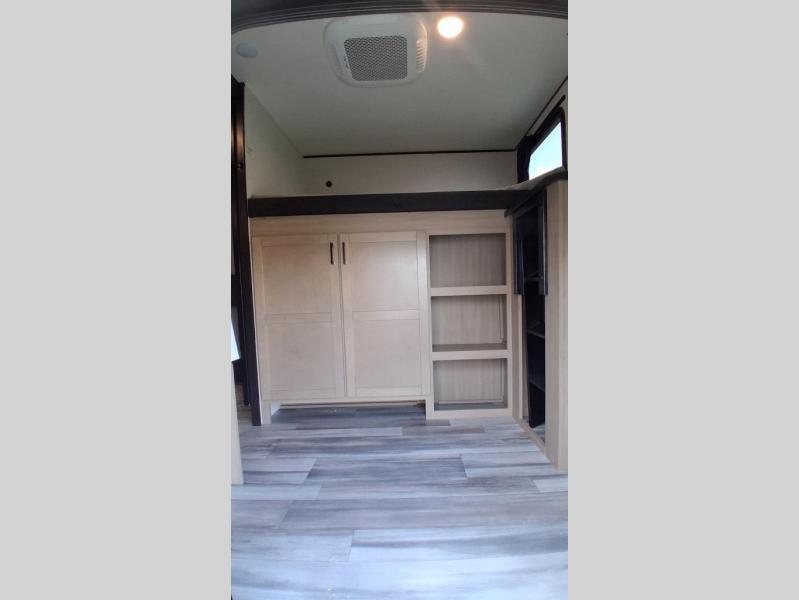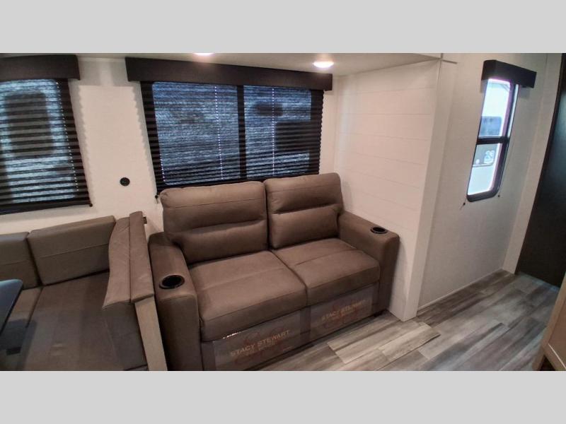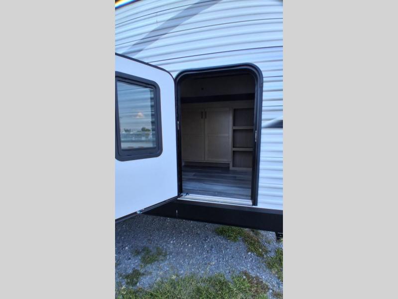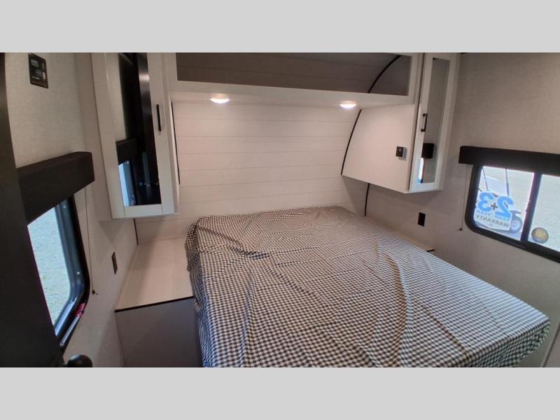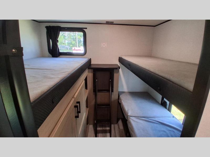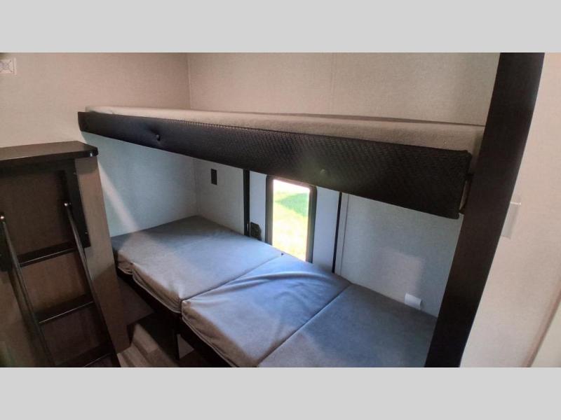 It's time to ditch that old tent and upgrade to this spacious travel trailer! There is a rear private bunkhouse includes a flip-up bunk over a 28" x 76" bunk, plus a bunk across the room and a wardrobe. You'll enjoy the front private bedroom all to yourselves with a queen bed and dual wardrobes, and the full bath is close by for easy nighttime use. A U-shaped dinette slide and sofa in the main living area provide your crew with space to relax and dine together, and the fully equipped kitchen lets you cook up your best meals. Outside, you'll find exterior storage, an 18' power awning, plus an outdoor refrigerator, shelf, and TV prep!