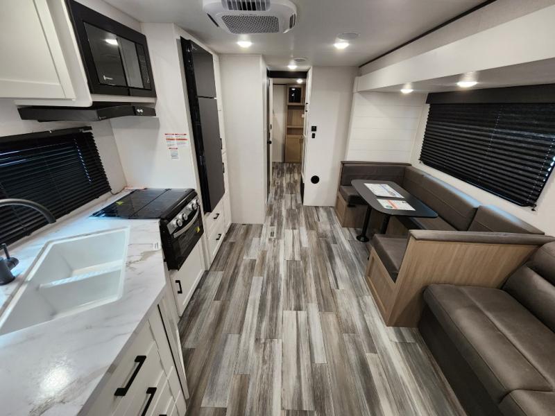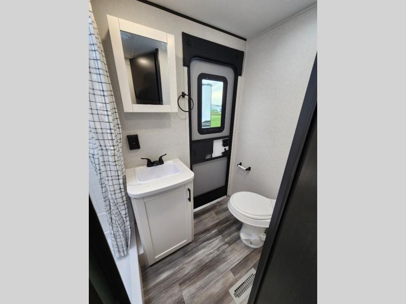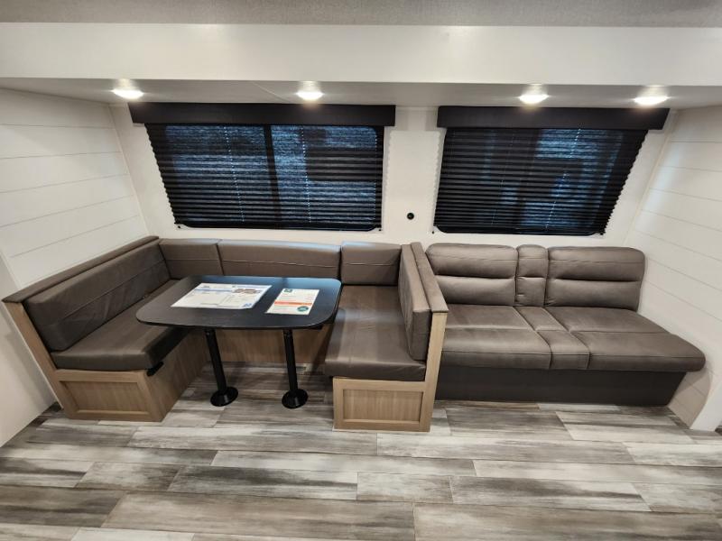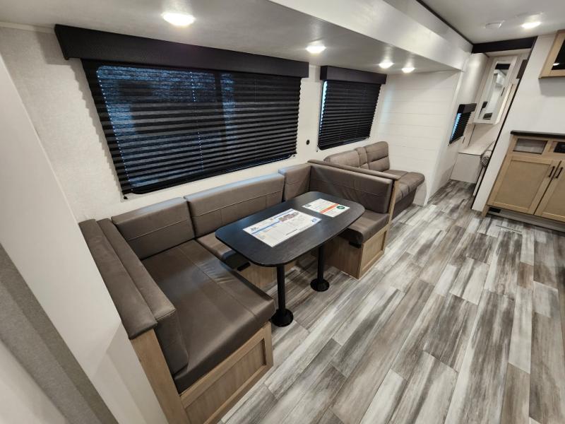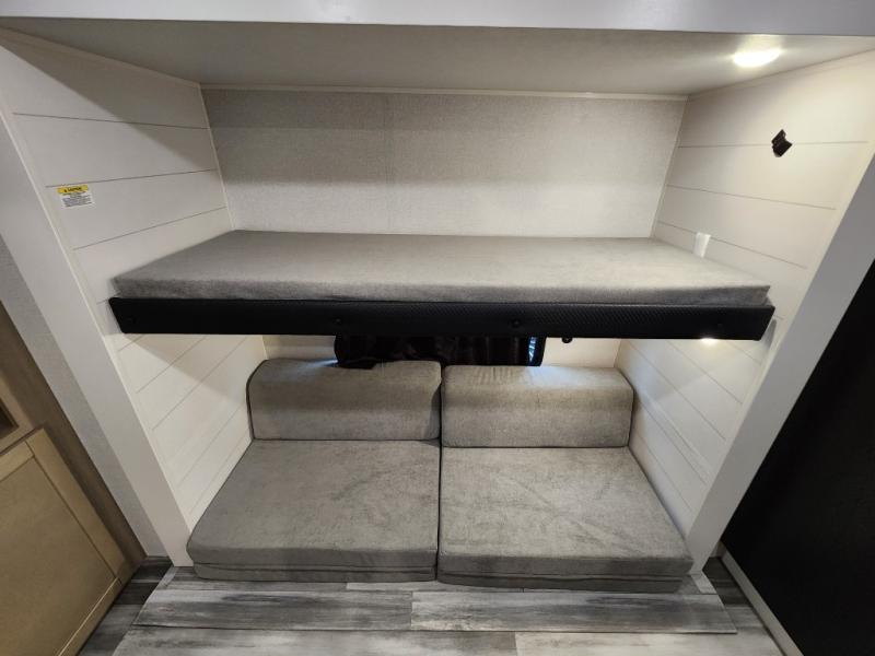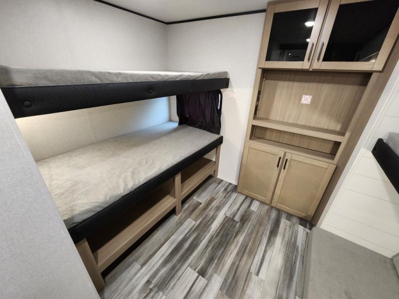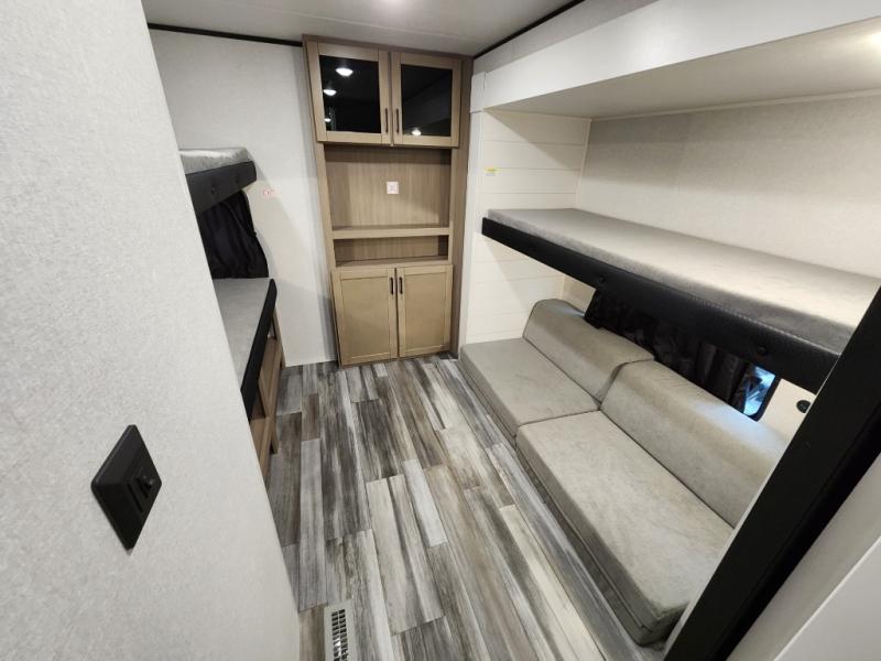 The whole gang can join along on camping trips in this double slide out travel trailer! There is a rear private bunkhouse with a bunk bed and J-cube futon sofa below plus two additional bunks across the room. You'll find your own space in the front private bedroom, which also includes an RV queen bed and dual wardrobes. The middle kitchen and living room will be a favorite place to come together since there is a jack-knife sofa and U-shaped dinette plus a fully-equipped kitchen to make meals each day. This model also includes a full bath with one of the dual entry doors for added convenience!