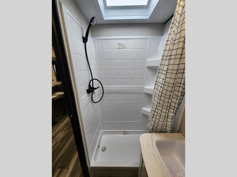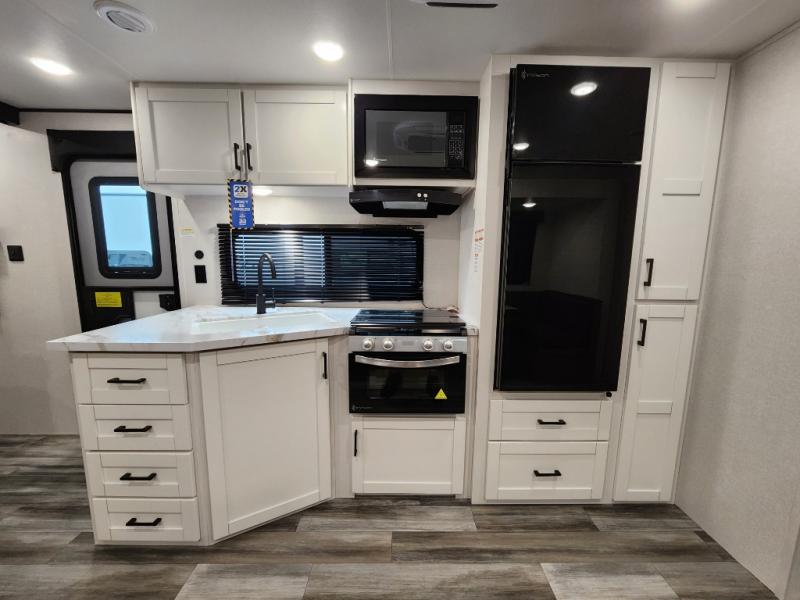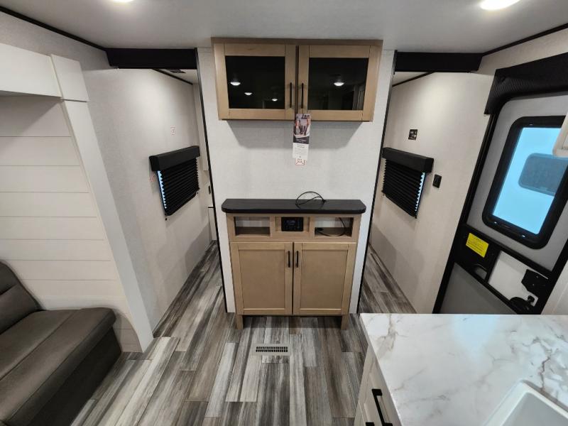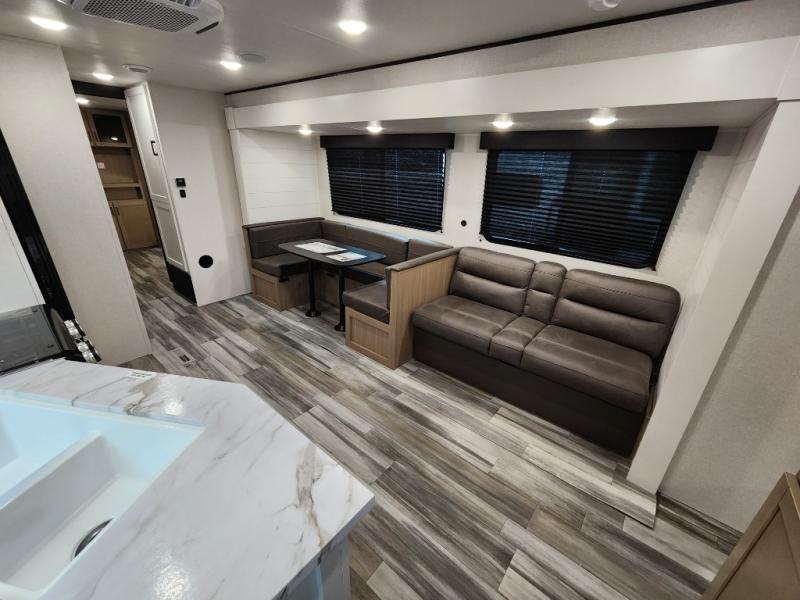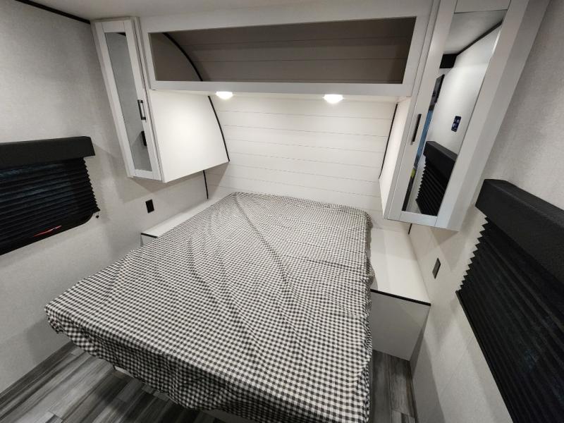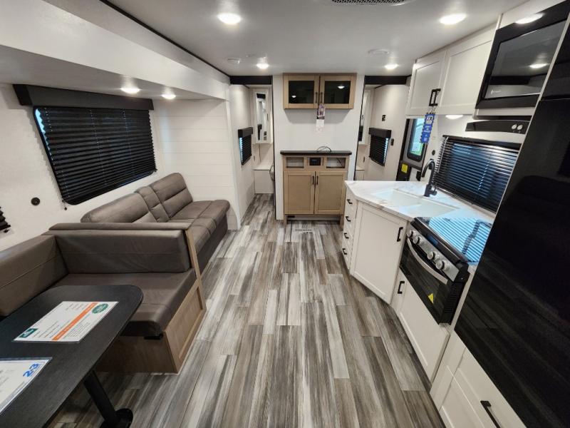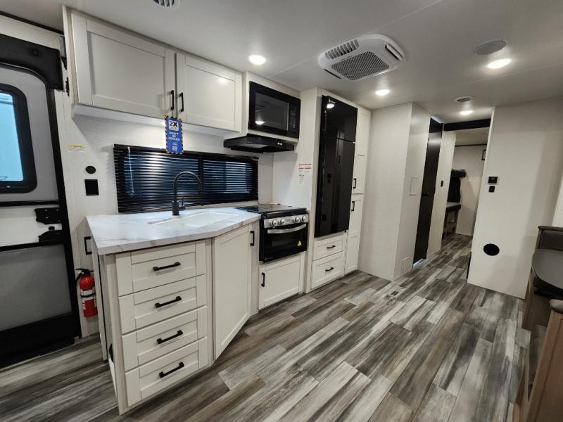 The whole gang can join along on camping trips in this double slide out travel trailer! There is a rear private bunkhouse with a bunk bed and J-cube futon sofa below plus two additional bunks across the room. You'll find your own space in the front private bedroom, which also includes an RV queen bed and dual wardrobes. The middle kitchen and living room will be a favorite place to come together since there is a jack-knife sofa and U-shaped dinette plus a fully-equipped kitchen to make meals each day. This model also includes a full bath with one of the dual entry doors for added convenience!