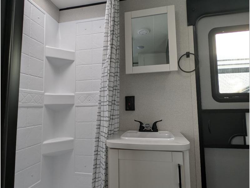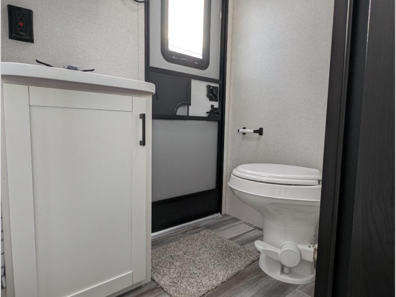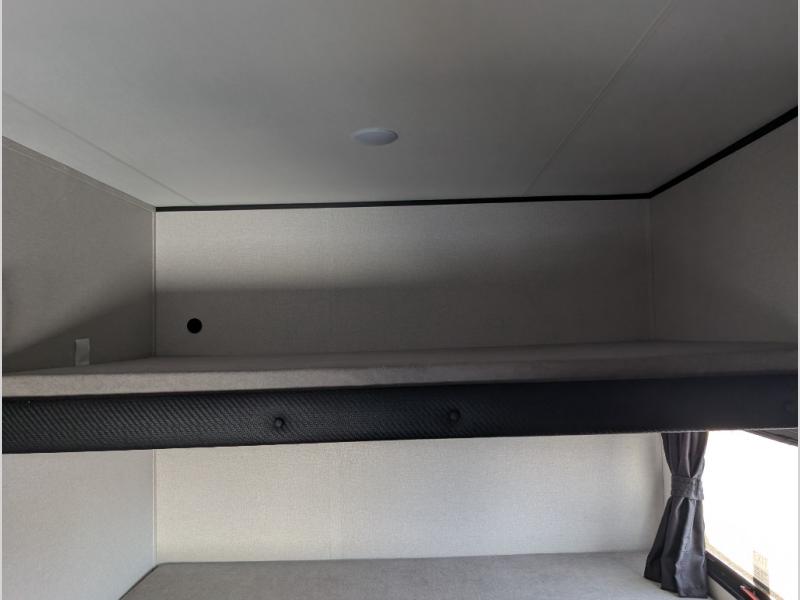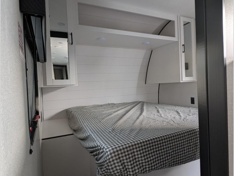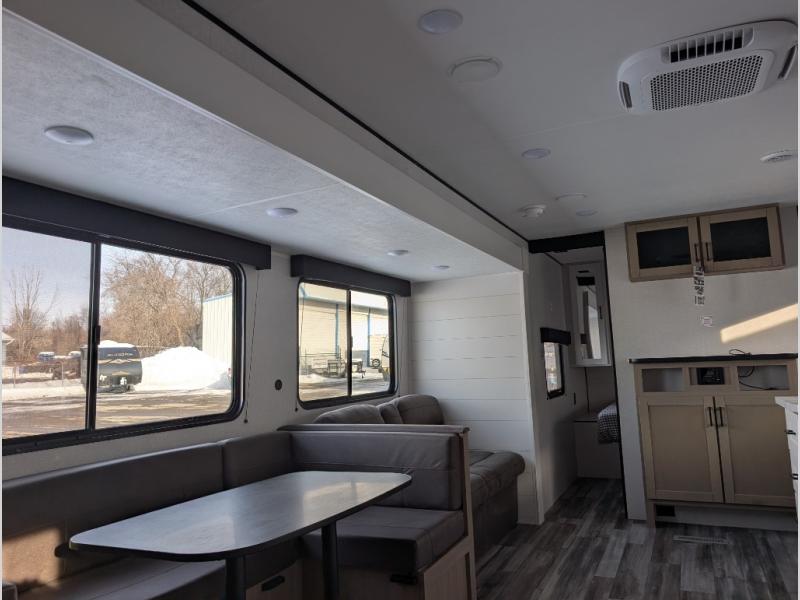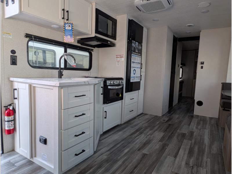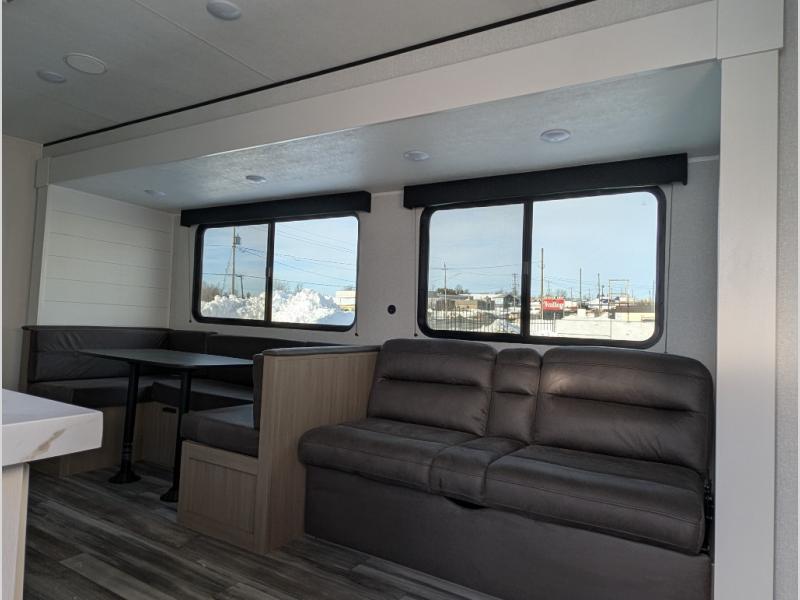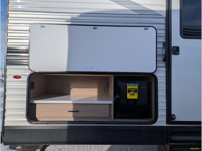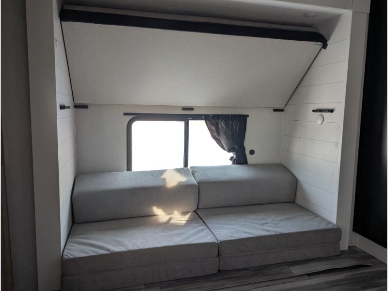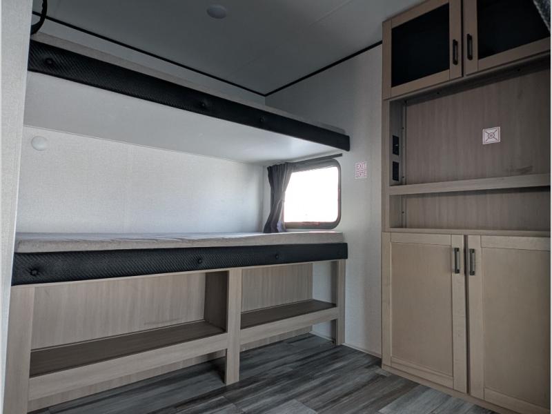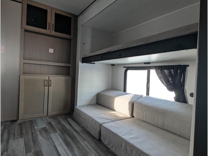 The whole gang can join along on camping trips in this double slide out travel trailer! There is a rear private bunkhouse with a bunk bed and J-cube futon sofa below plus two additional bunks across the room. You'll find your own space in the front private bedroom, which also includes an RV queen bed and dual wardrobes. The middle kitchen and living room will be a favorite place to come together since there is a jack-knife sofa and U-shaped dinette plus a fully-equipped kitchen to make meals each day. This model also includes a full bath with one of the dual entry doors for added convenience!