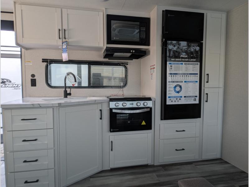 The Jayco Jay Flight SLX travel trailer is quite easy to own because it is lightweight for an easier towing experience. Built on a fully integrated A-frame with galvanized-steel, impact-resistant wheel wells, the Jay Flight SLX has quality at its very foundation. That quality continues on to the electric self-adjusting brakes, easy-lube hubs, Magnum Truss roof system, and LP quick connect. Some of what the mandatory Customer Value Package includes is backup camera prep, Keyed-Alike entry and baggage doors, and an on-demand tankless water heater.