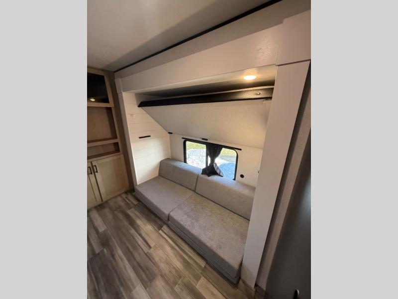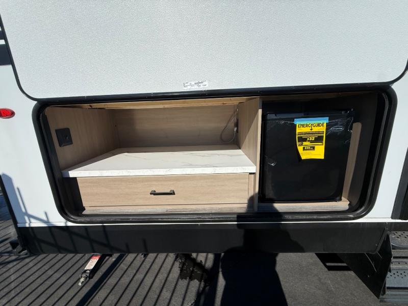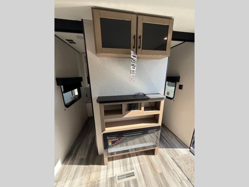 Inside, you’ll find solid hardwood cabinet doors with hidden hinges, giving the space a modern, residential feel. Oversized cabinets and under-bed storage ensure there’s room for everything you need, while the lit exterior passthrough storage makes packing and unpacking a breeze.