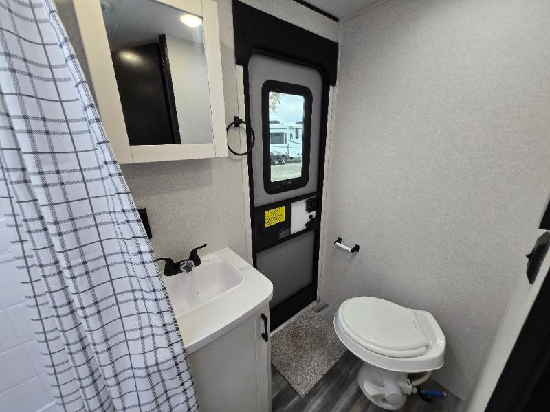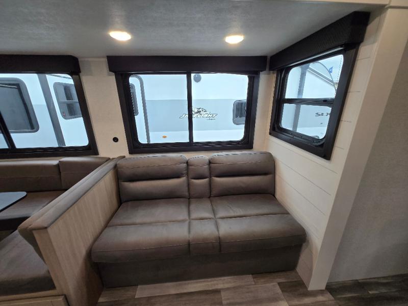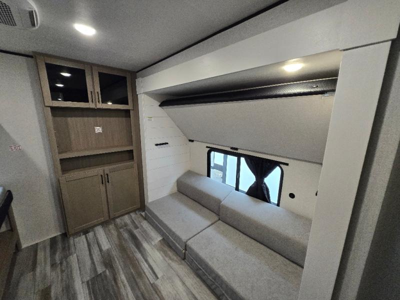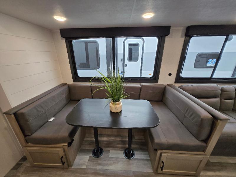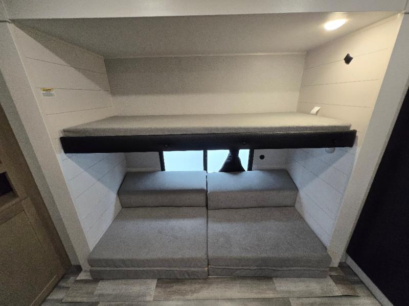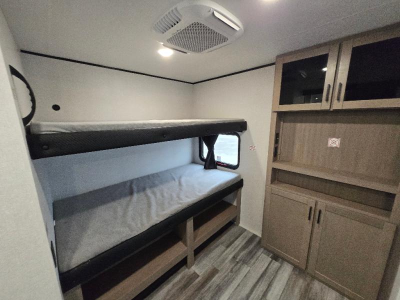 The whole gang can join along on camping trips in this double slide out travel trailer! There is a rear private bunkhouse with a bunk bed and J-cube futon sofa below plus two additional bunks across the room. You'll find your own space in the front private bedroom, which also includes an RV queen bed and dual wardrobes. The middle kitchen and living room will be a favorite place to come together since there is a jack-knife sofa and U-shaped dinette plus a fully-equipped kitchen to make meals each day. This model also includes a full bath with one of the dual entry doors for added convenience!