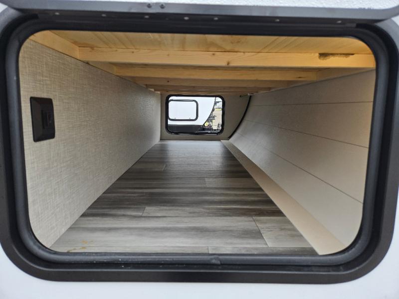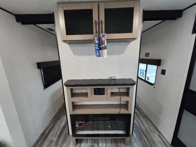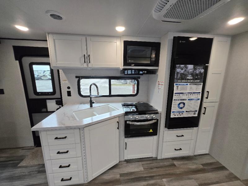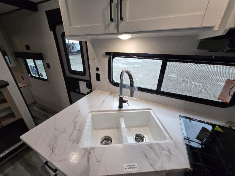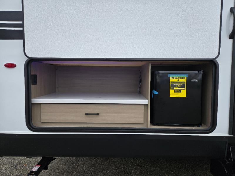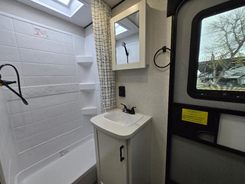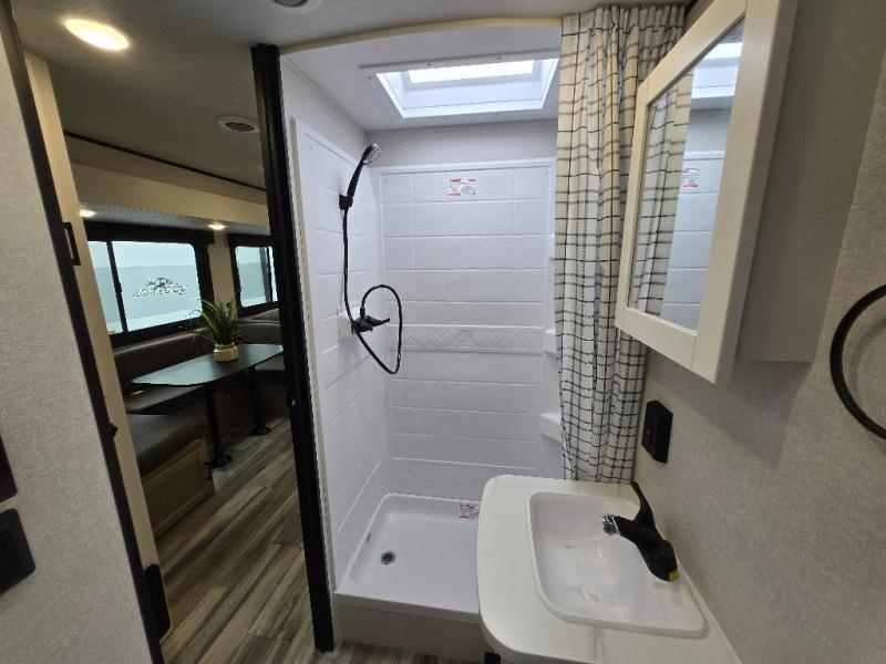 The whole gang can join along on camping trips in this double slide out travel trailer! There is a rear private bunkhouse with a bunk bed and J-cube futon sofa below plus two additional bunks across the room. You'll find your own space in the front private bedroom, which also includes an RV queen bed and dual wardrobes. The middle kitchen and living room will be a favorite place to come together since there is a jack-knife sofa and U-shaped dinette plus a fully-equipped kitchen to make meals each day. This model also includes a full bath with one of the dual entry doors for added convenience!