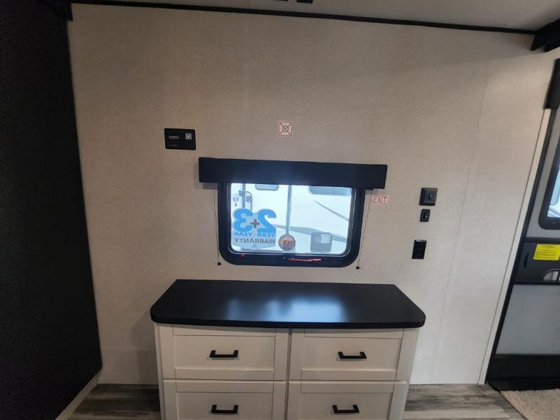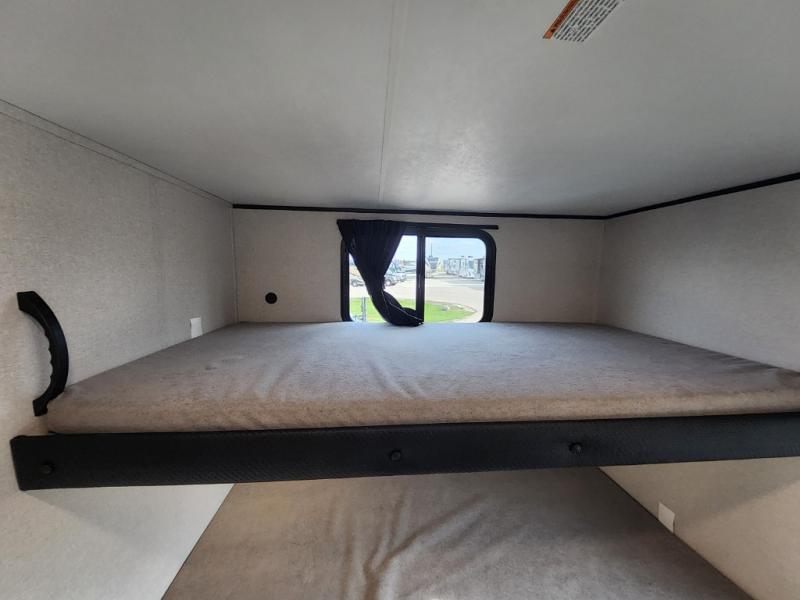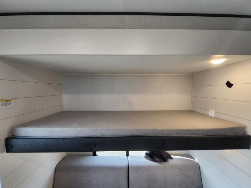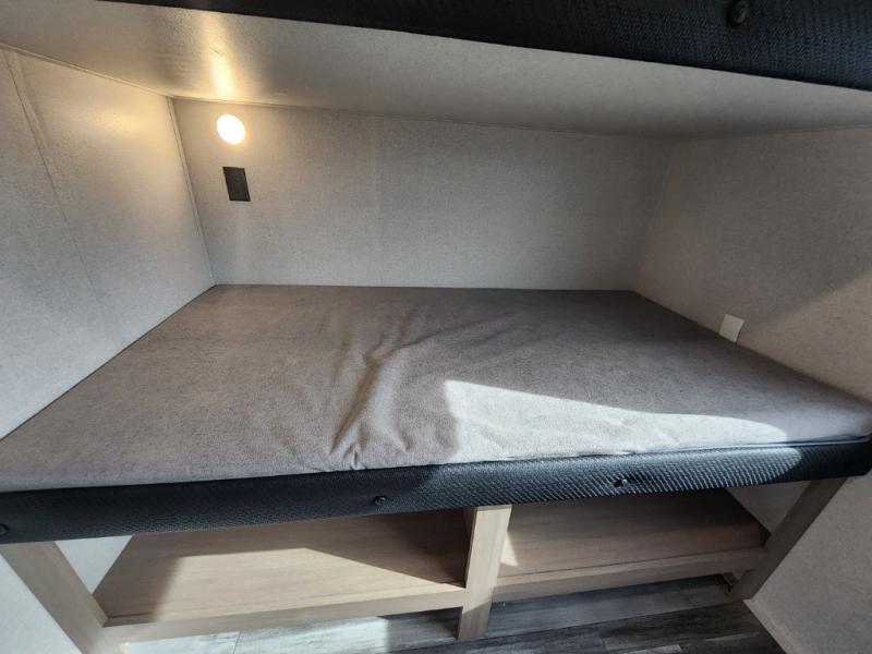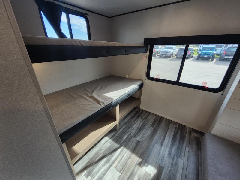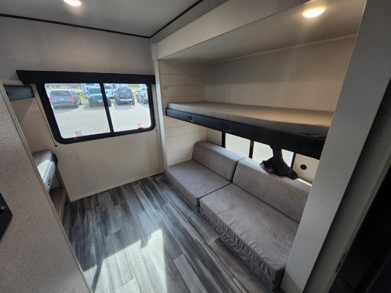 The whole gang can join along on camping trips in this triple slide out travel trailer! There is a rear private bunkhouse with a bunk bed and J-cube futon sofa below plus two additional bunks across the room. You'll find your own space in the front private bedroom, which also includes a queen bed slide out, a dresser, plus a front wardrobe and washer/dryer prep. The middle kitchen and living room will be a favorite place to come together since there is a jack-knife sofa and U-shaped dinette plus a fully equipped kitchen to make meals each day.