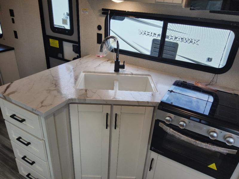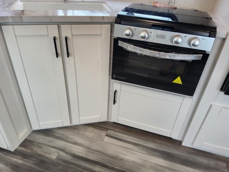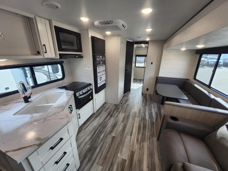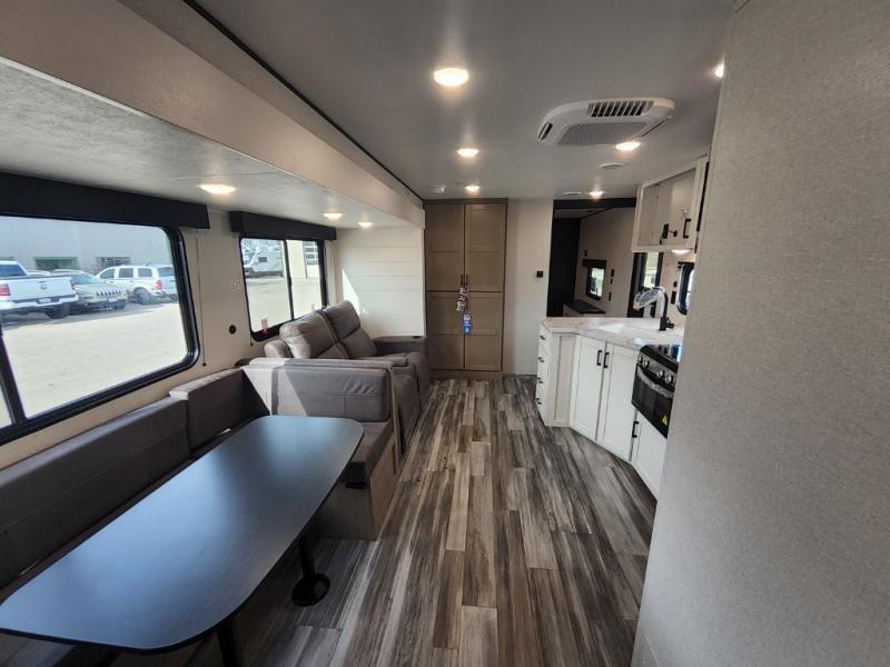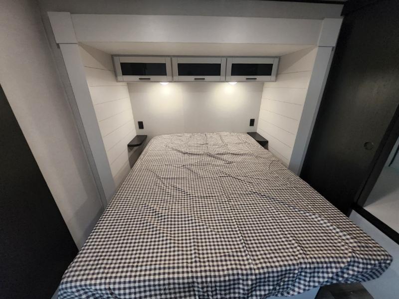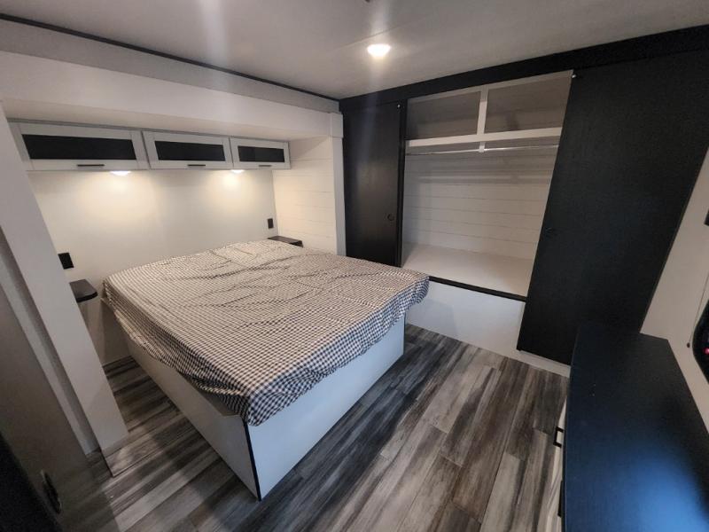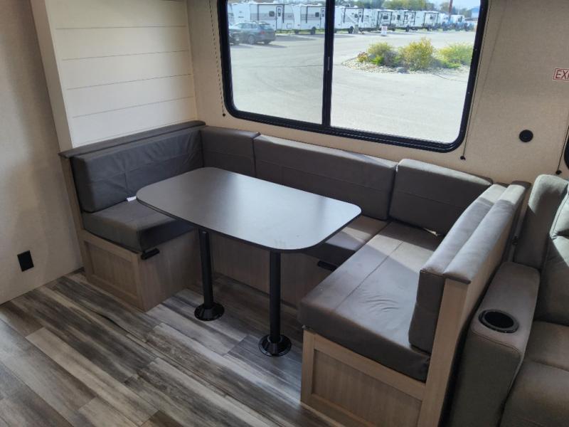 The whole gang can join along on camping trips in this triple slide out travel trailer! There is a rear private bunkhouse with a bunk bed and J-cube futon sofa below plus two additional bunks across the room. You'll find your own space in the front private bedroom, which also includes a queen bed slide out, a dresser, plus a front wardrobe and washer/dryer prep. The middle kitchen and living room will be a favorite place to come together since there is a jack-knife sofa and U-shaped dinette plus a fully equipped kitchen to make meals each day.