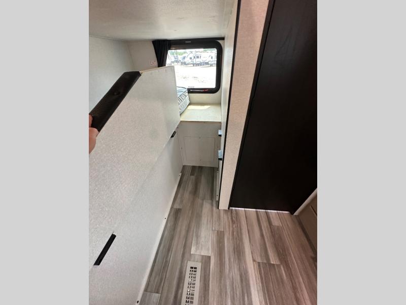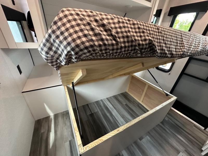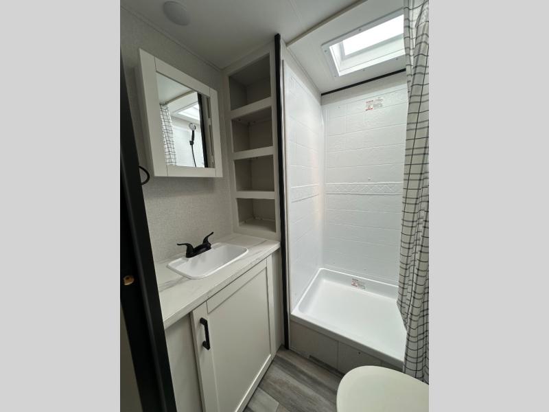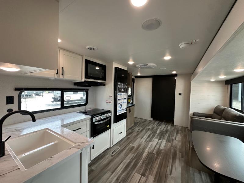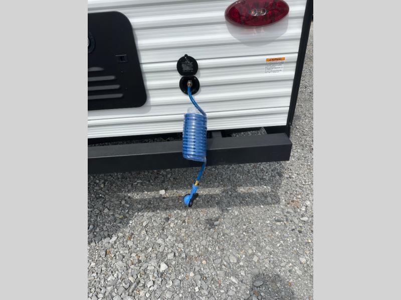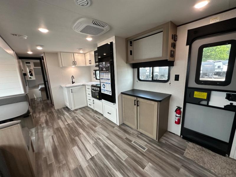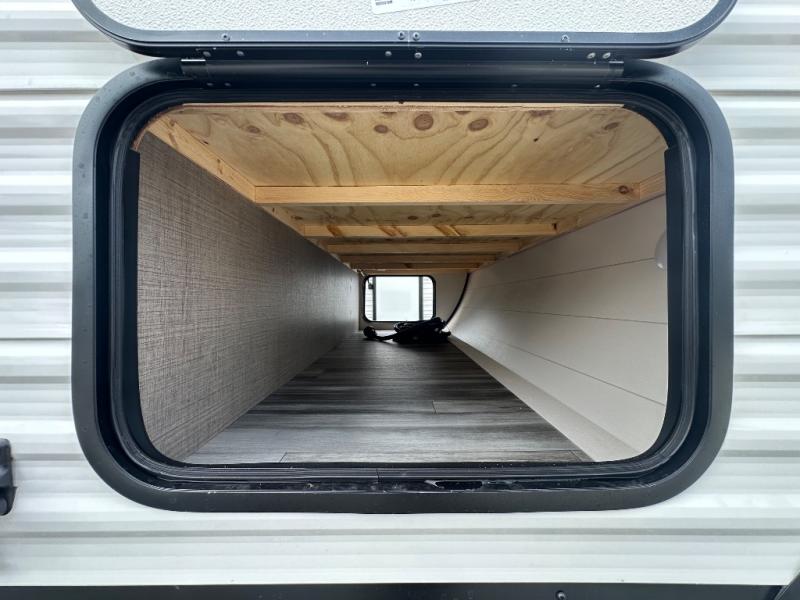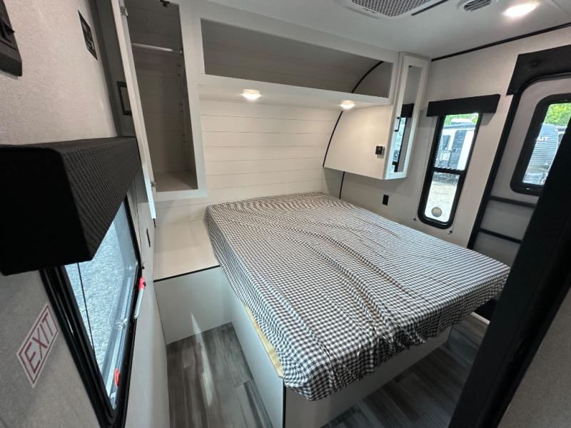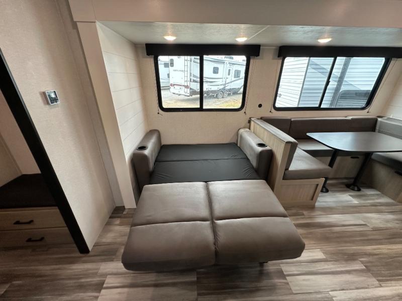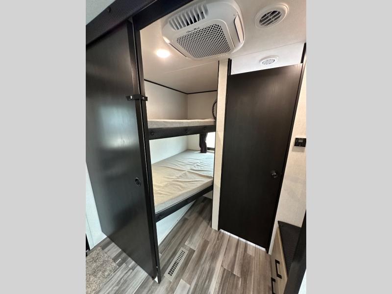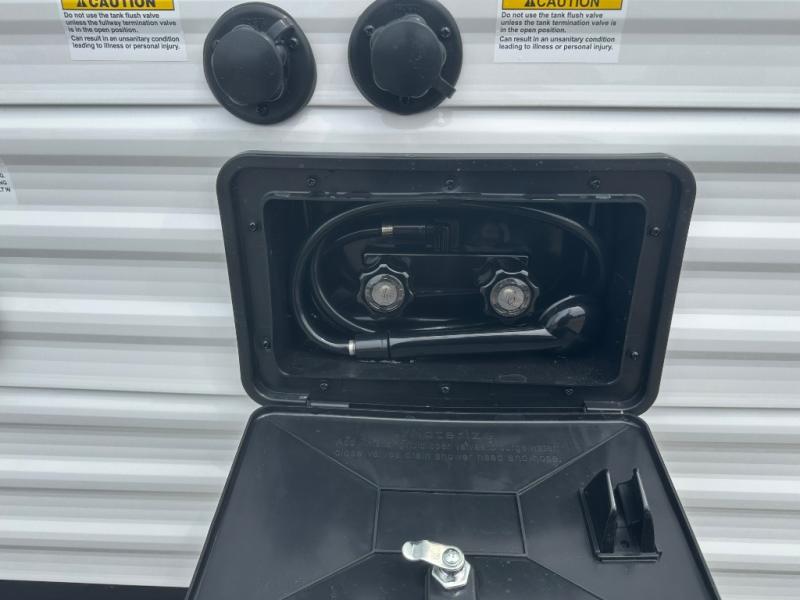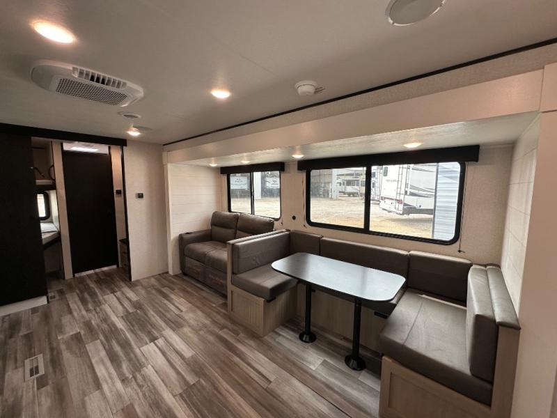 It's time to ditch that old tent and upgrade to this spacious travel trailer! The littles ones or your guests will love the double-size bunks in the rear bunkhouse, along with a half bath and storage space for their things. You'll enjoy the front private bedroom all to yourselves with a queen bed and dual wardrobes, and the full bath is close by for easy nighttime use. A U-shaped dinette slide and sofa in the main living area provide your crew with space to relax and dine together, and the fully equipped kitchen lets you cook up your best meals. Outside, you'll find exterior storage, a 20' power awning, plus an exterior refrigerator, LP Quick Connect, and an exterior spray port!