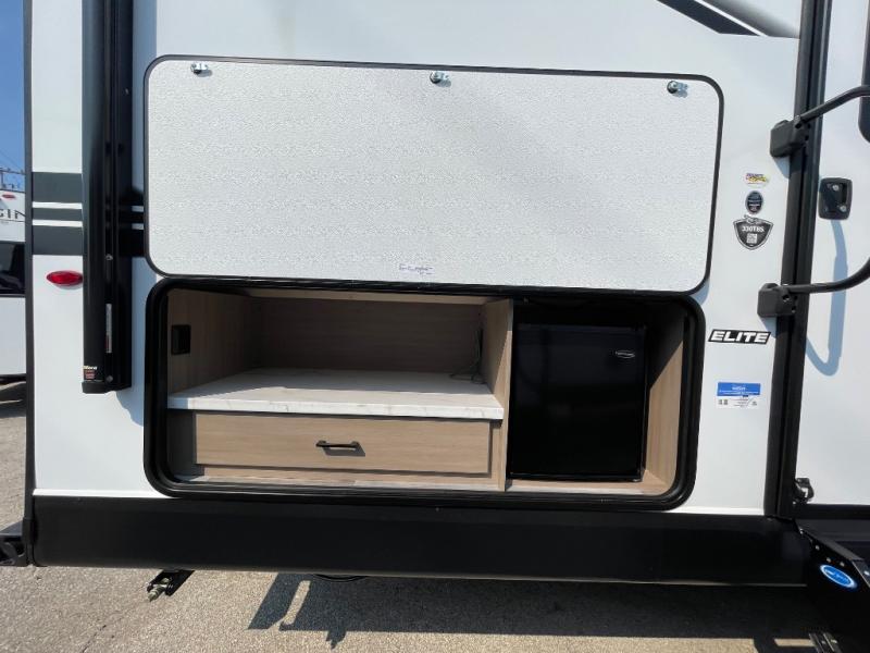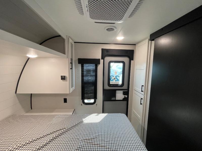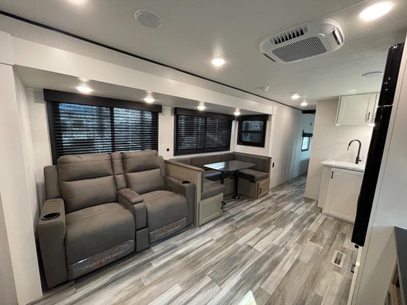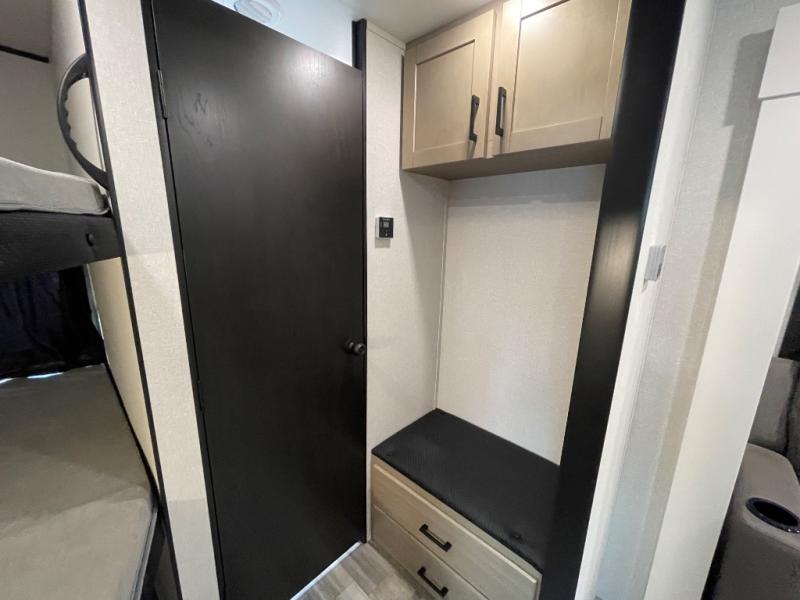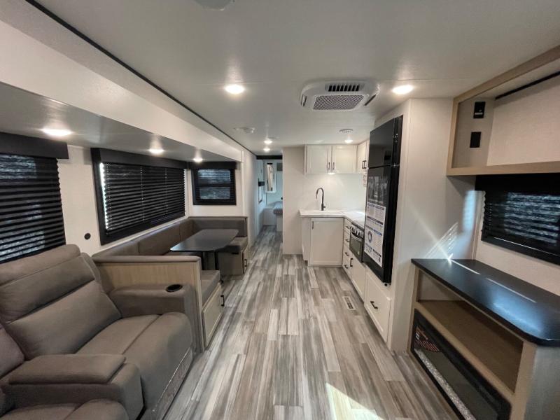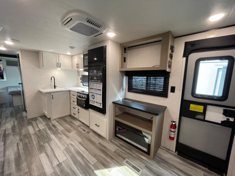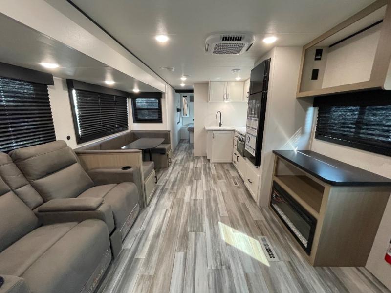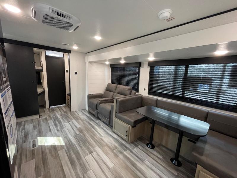 It's time to ditch that old tent and upgrade to this spacious travel trailer! The little ones or your guests will love the double-size bunks in the rear bunkhouse, along with a half bath and storage space for their things. You'll enjoy the front private bedroom all to yourselves with a queen bed and dual wardrobes, and the full bath is close by for easy nighttime use. A U-shaped dinette slide and sofa in the main living area provide your crew with space to relax and dine together, and the fully equipped kitchen lets you cook up your best meals. Outside, you'll find exterior storage, a 20' power awning, plus an outdoor kitchen to enjoy a sunrise breakfast!