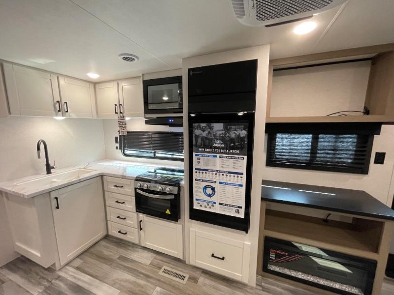The Jayco Jay Flight SLX travel trailer is quite easy to own because it is lightweight for an easier towing experience. Built on a fully integrated A-frame with galvanized-steel, impact-resistant wheel wells, the Jay Flight SLX has quality at its very foundation. That quality continues on to the electric self-adjusting brakes, easy-lube hubs, Magnum Truss roof system, and LP quick connect. Some of what the mandatory Customer Value Package includes is backup camera prep, Keyed-Alike entry and baggage doors, and an on-demand tankless water heater.