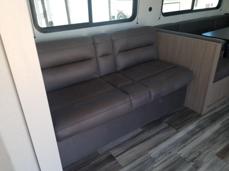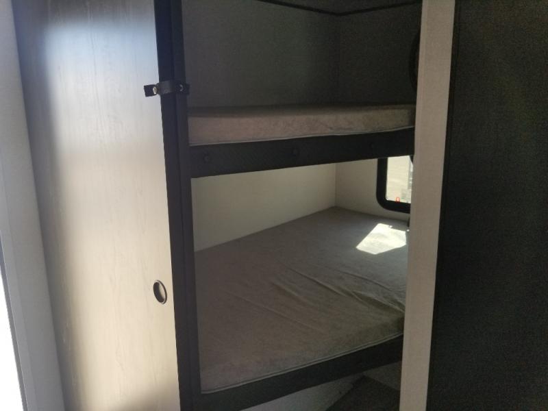 It's time to ditch that old tent and upgrade to this spacious travel trailer! The little ones or your guests will love the double-size bunks in the rear bunkhouse, along with a half bath and storage space for their things. You'll enjoy the front private bedroom all to yourselves with a queen bed and dual wardrobes, and the full bath is close by for easy nighttime use. A U-shaped dinette slide and sofa in the main living area provide your crew with space to relax and dine together, and the fully equipped kitchen lets you cook up your best meals. Outside, you'll find exterior storage, a 20' power awning, plus an outdoor kitchen to enjoy a sunrise breakfast!