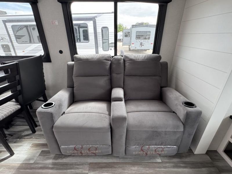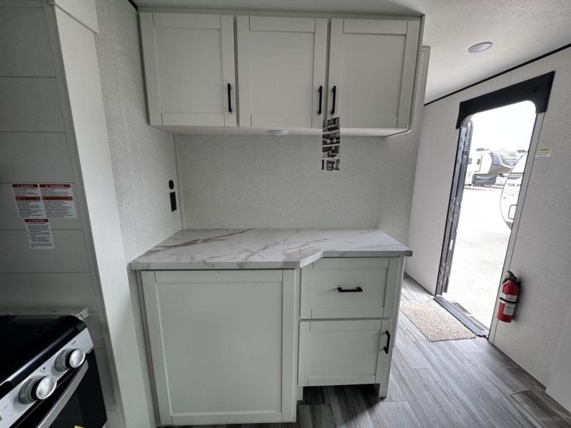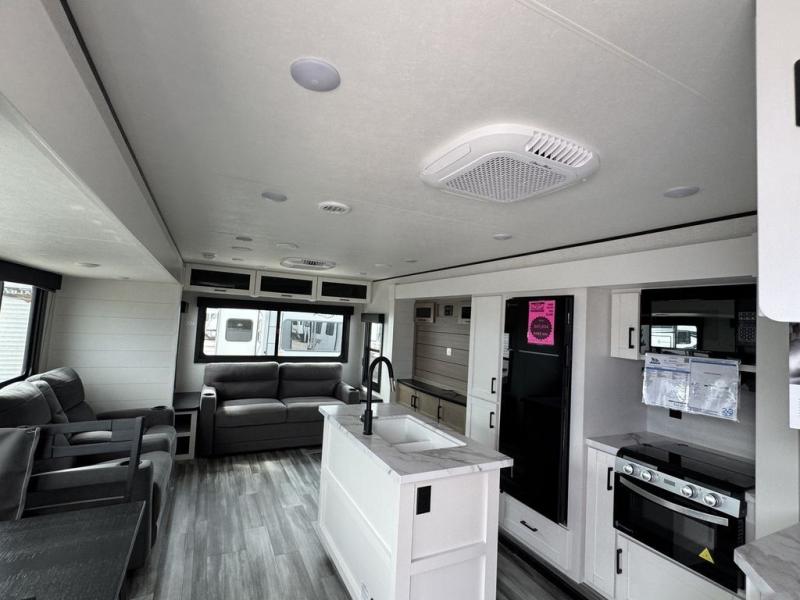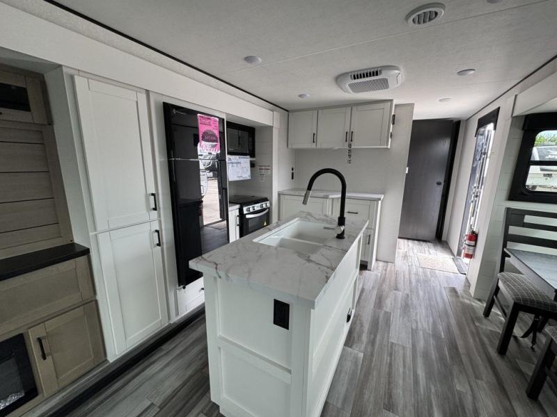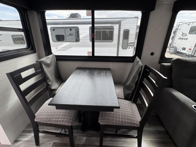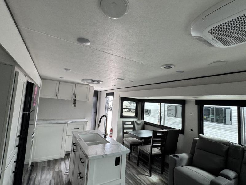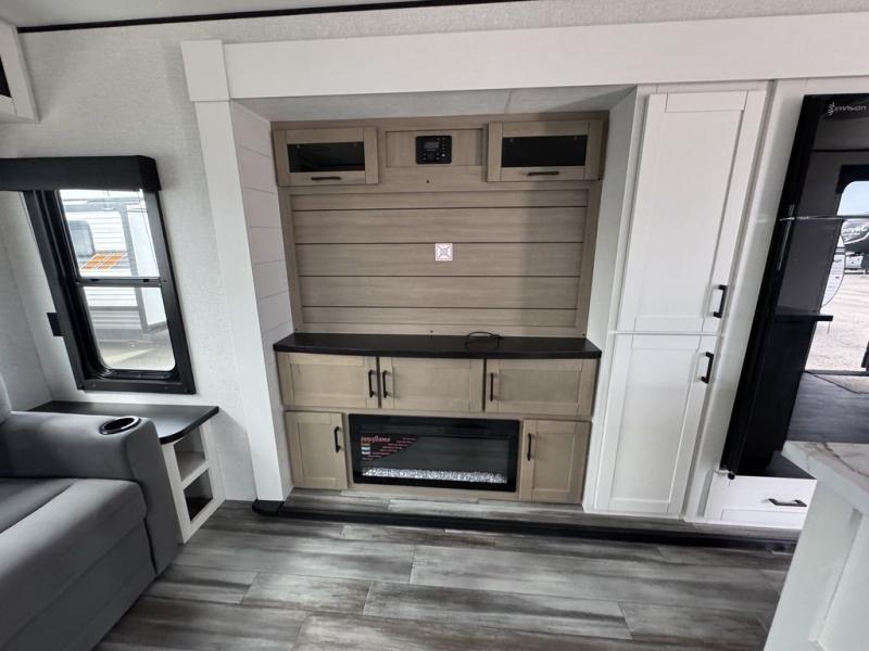 Enjoy a relaxing weekend getaway in this travel trailer! The dual entry bathroom with radius shower creates a front master suite with a queen bed slide, a dresser, and a front large wardrobe with storage space plus washer and dryer prep. The chef will have an easy time preparing their best home cooked meals with the kitchen island, hutch, three burner cooktop, and 12V refrigerator. Enjoy your meals at the booth dinette then play a card game or transform it into an extra sleeping space. The rear living area has a rear Jack-knife sofa for a quick afternoon nap and theater seating across from the entertainment center with a fireplace for the perfect spot on movie night!