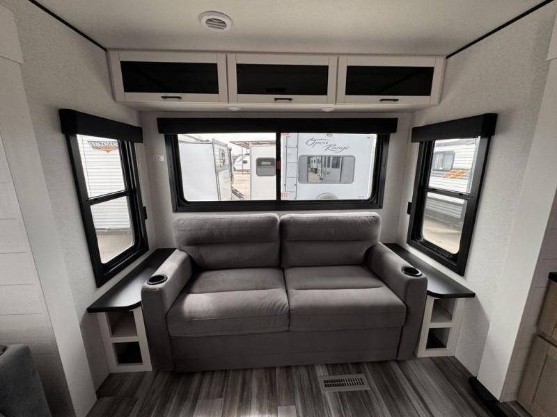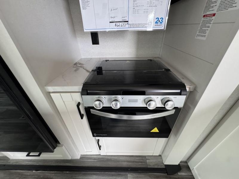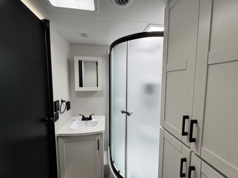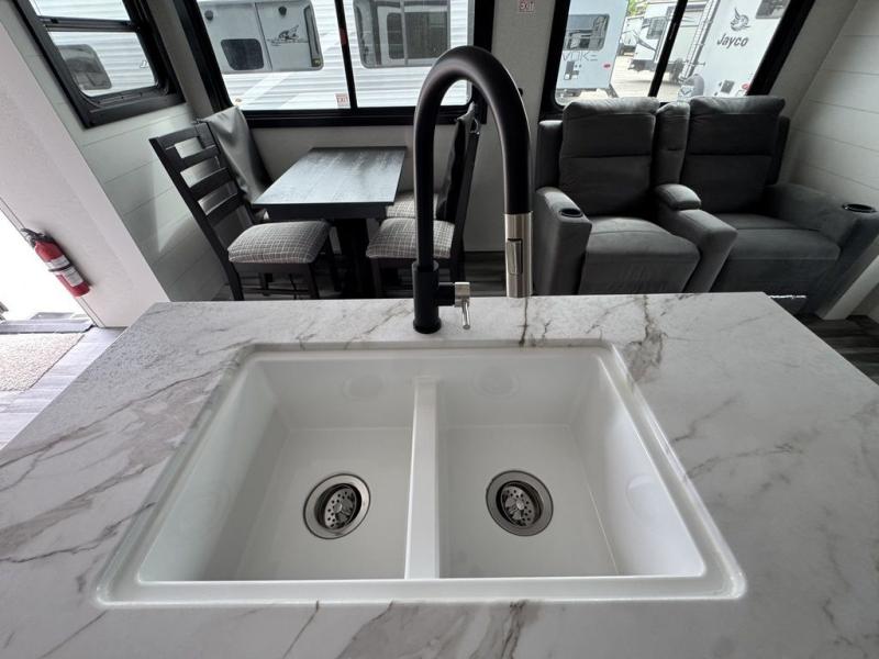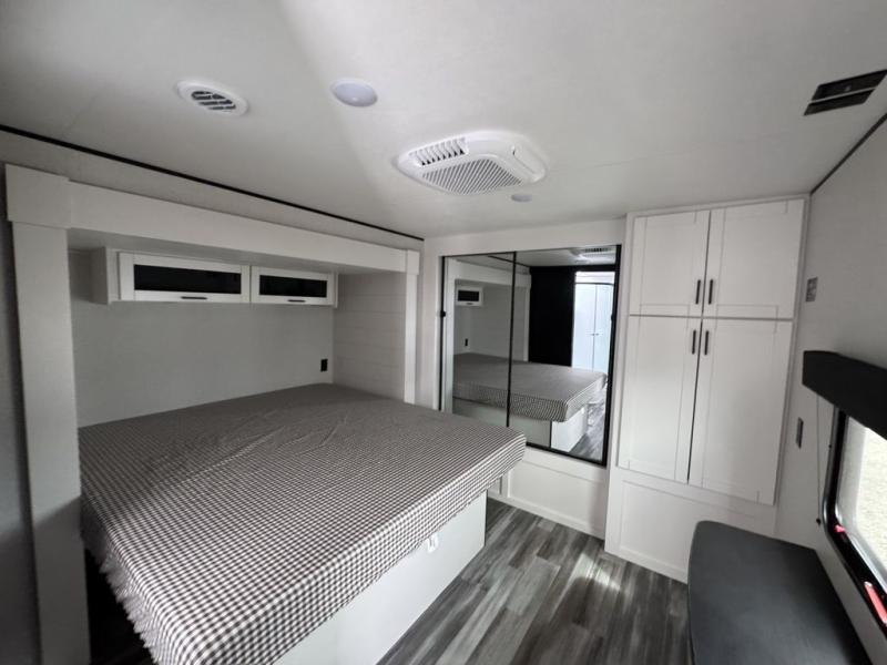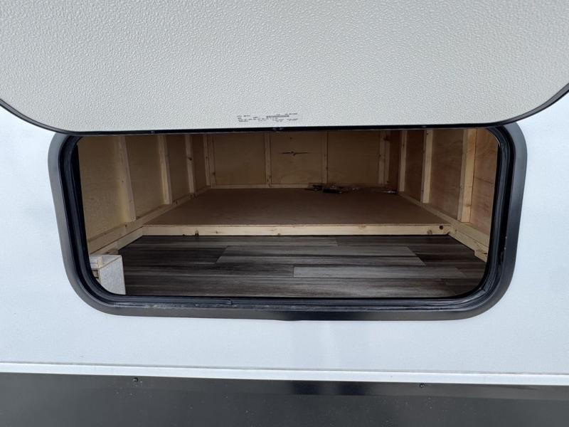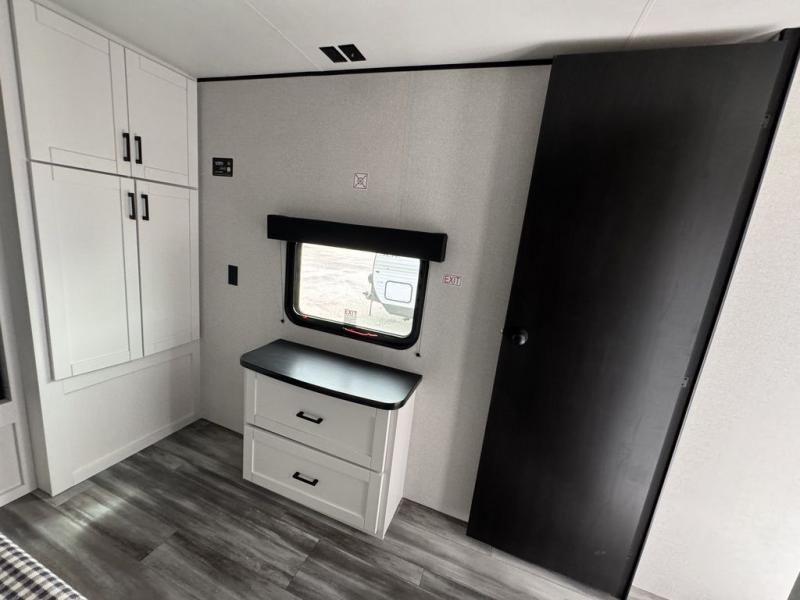 Enjoy a relaxing weekend getaway in this travel trailer! The dual entry bathroom with radius shower creates a front master suite with a queen bed slide, a dresser, and a front large wardrobe with storage space plus washer and dryer prep. The chef will have an easy time preparing their best home cooked meals with the kitchen island, hutch, three burner cooktop, and 12V refrigerator. Enjoy your meals at the booth dinette then play a card game or transform it into an extra sleeping space. The rear living area has a rear Jack-knife sofa for a quick afternoon nap and theater seating across from the entertainment center with a fireplace for the perfect spot on movie night!