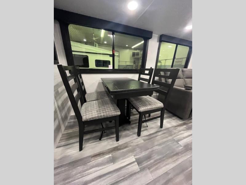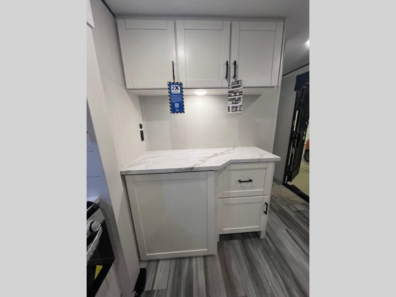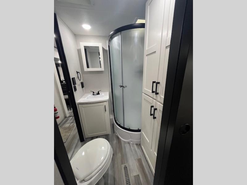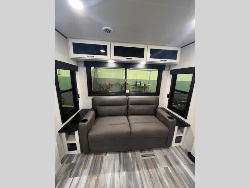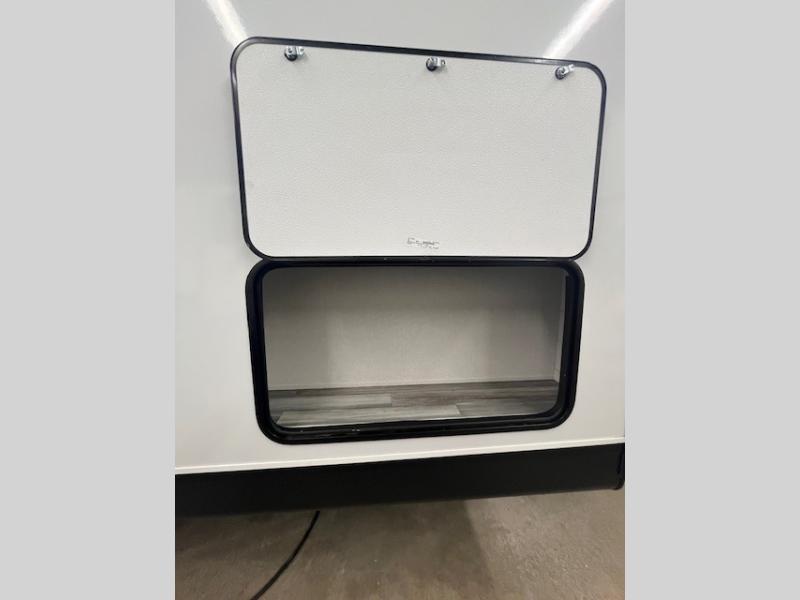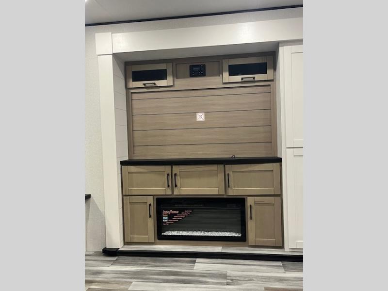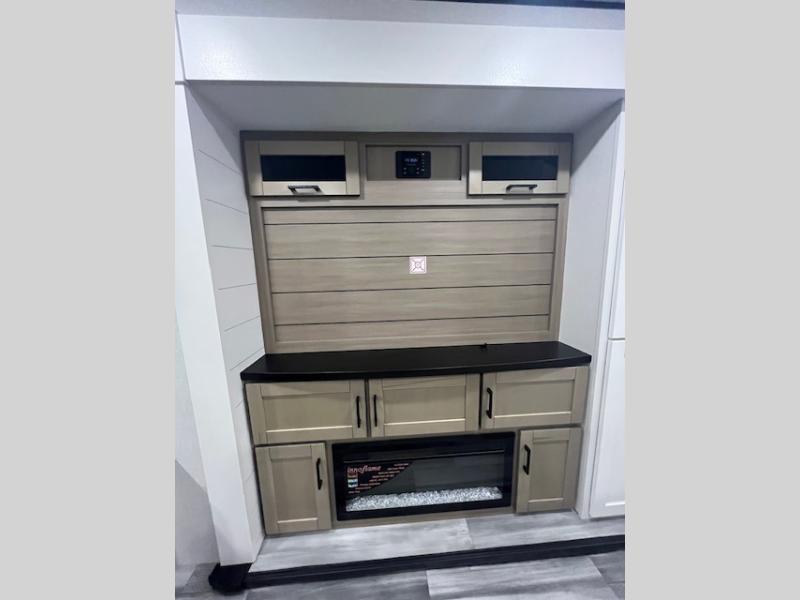 Enjoy a relaxing weekend getaway in this travel trailer! The dual entry bathroom with radius shower creates a front master suite with a queen bed slide, a dresser, and a front large wardrobe with storage space plus washer and dryer prep. The chef will have an easy time preparing their best home cooked meals with the kitchen island, hutch, three burner cooktop, and 12V refrigerator. Enjoy your meals at the booth dinette then play a card game or transform it into an extra sleeping space. The rear living area has a rear Jack-knife sofa for a quick afternoon nap and theater seating across from the entertainment center with a fireplace for the perfect spot on movie night!